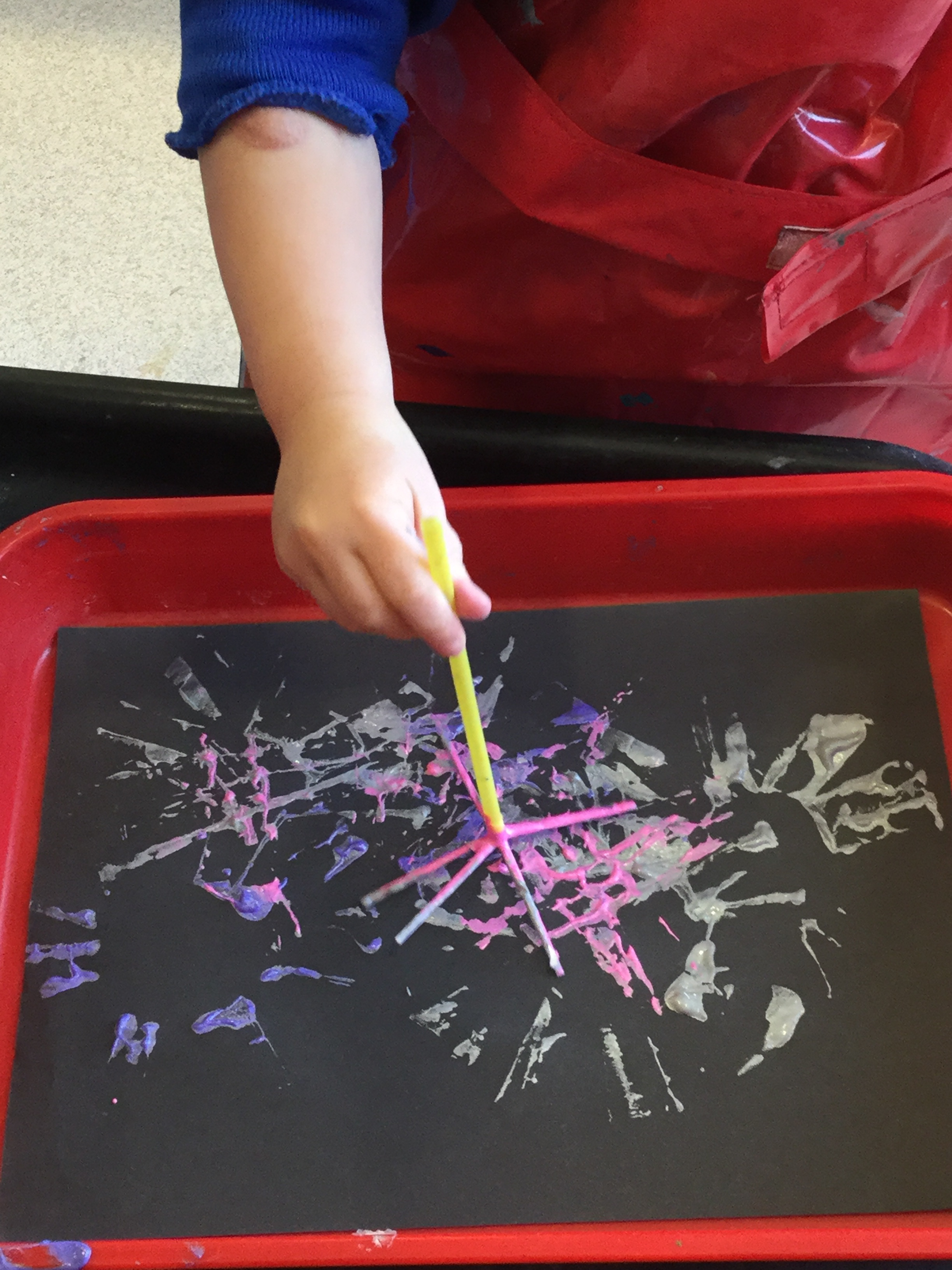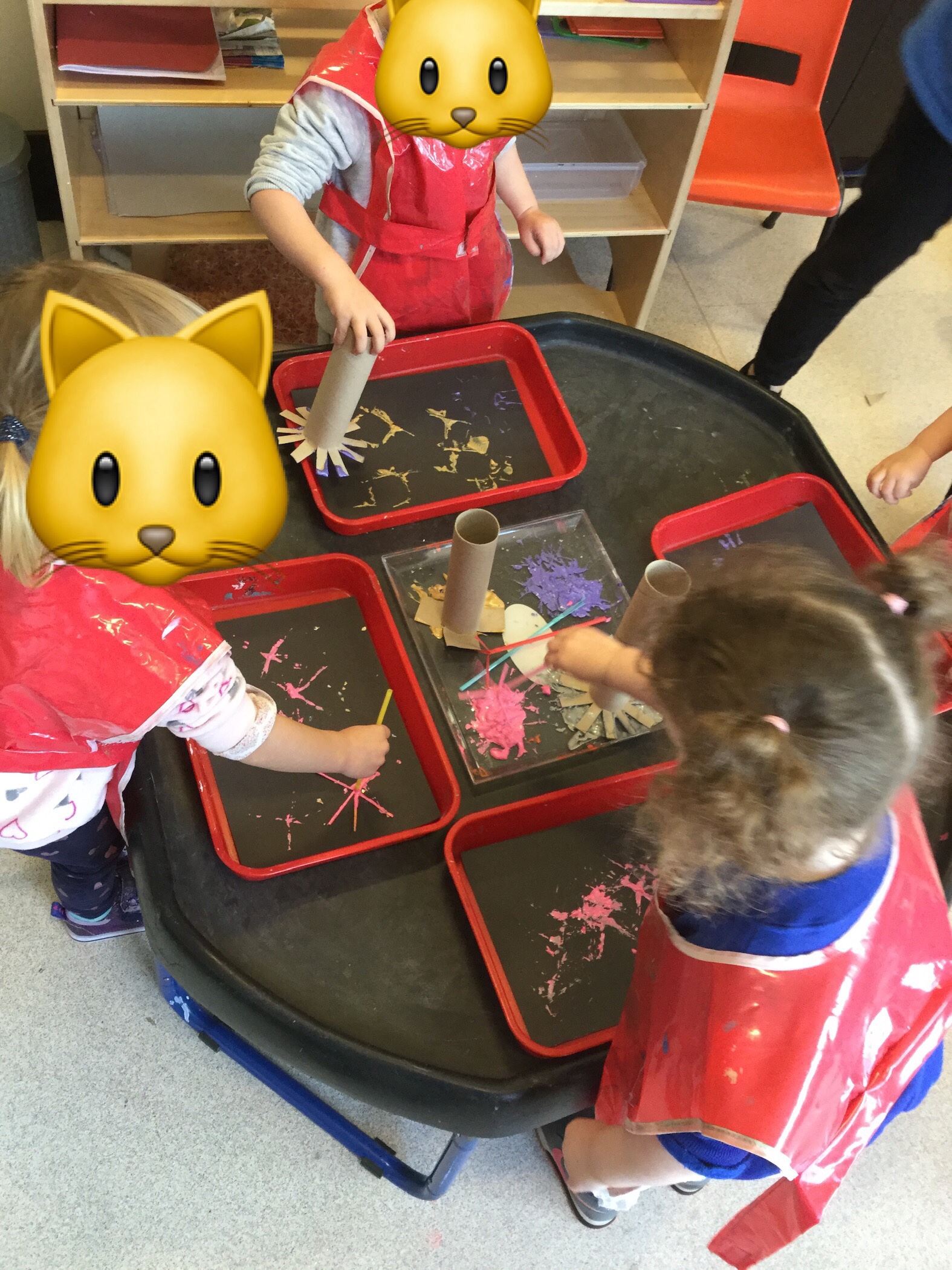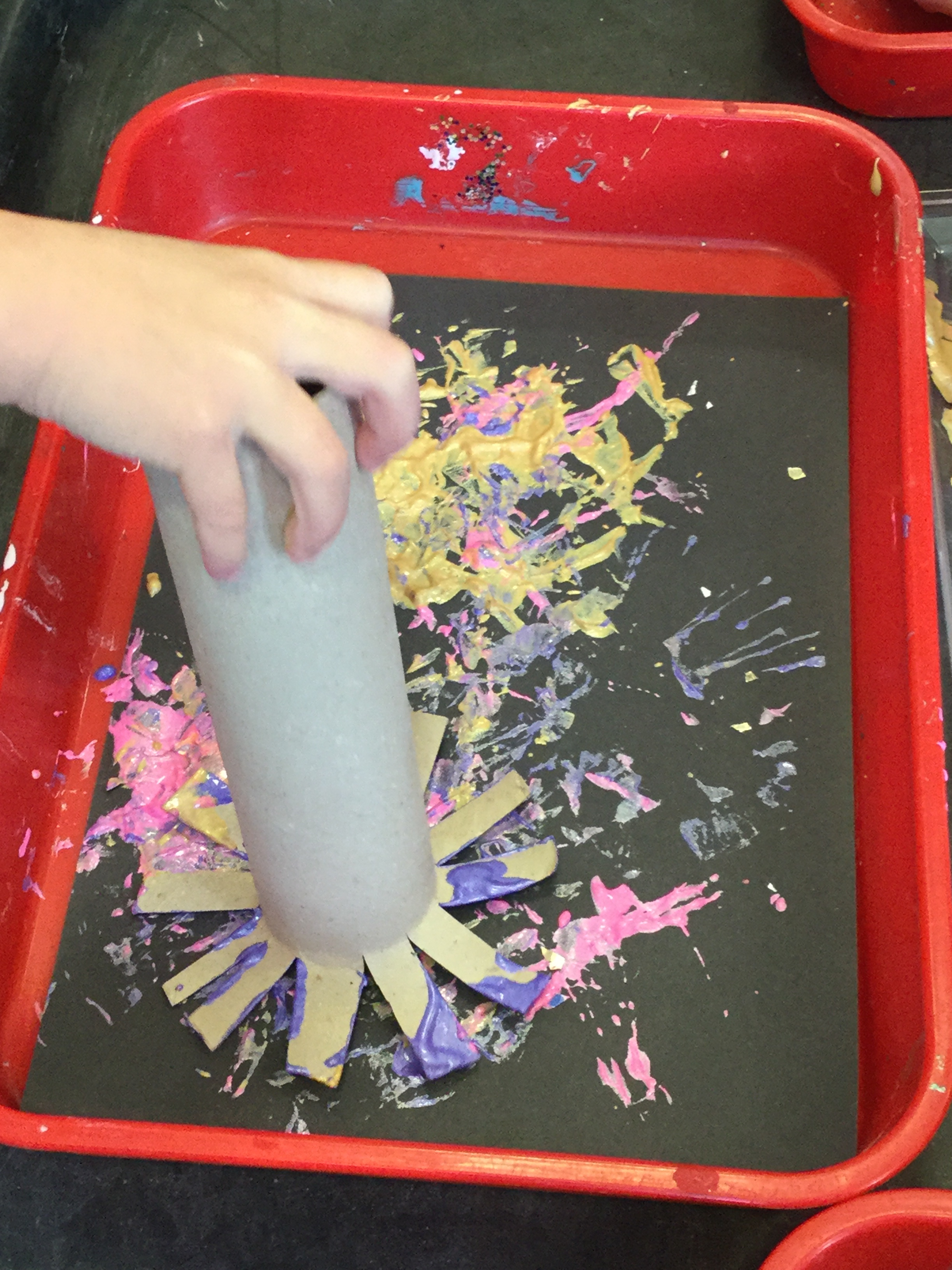 We created some amazing firework pictures exploring different ways to print, using marbles rolled in paint and adding glitter for the sparkle effect. And also using frayed cardboard tubes and straws to give a firework shape. 🎇