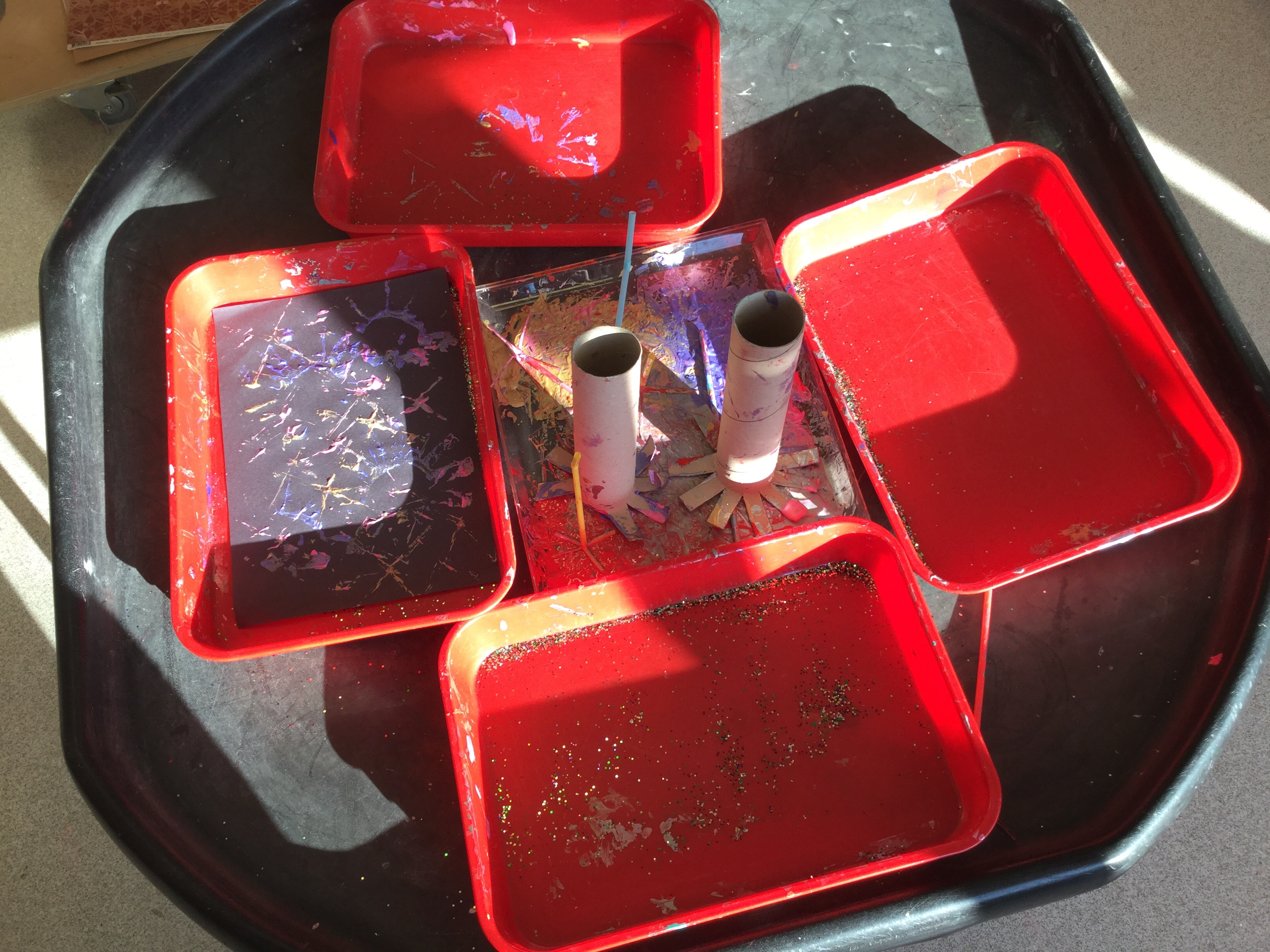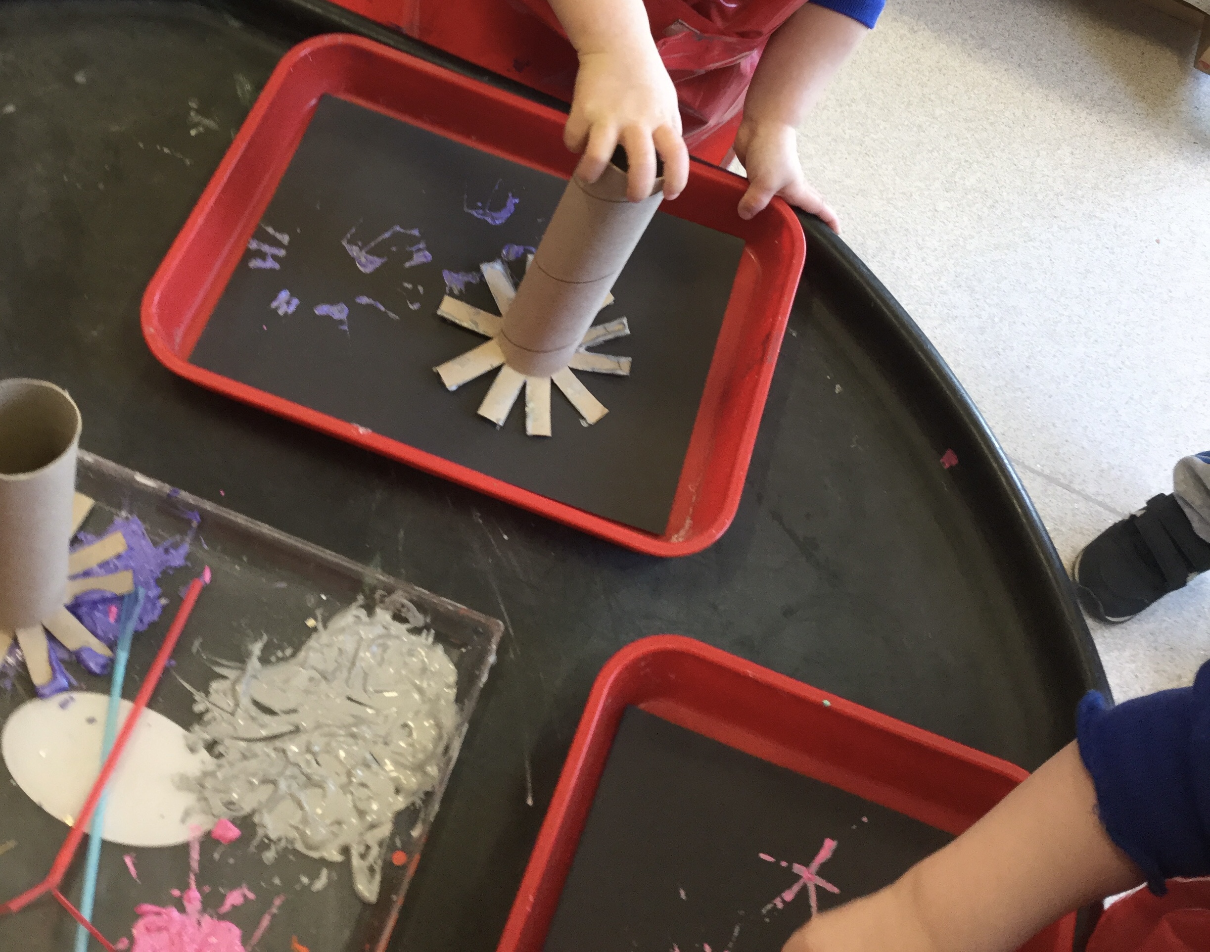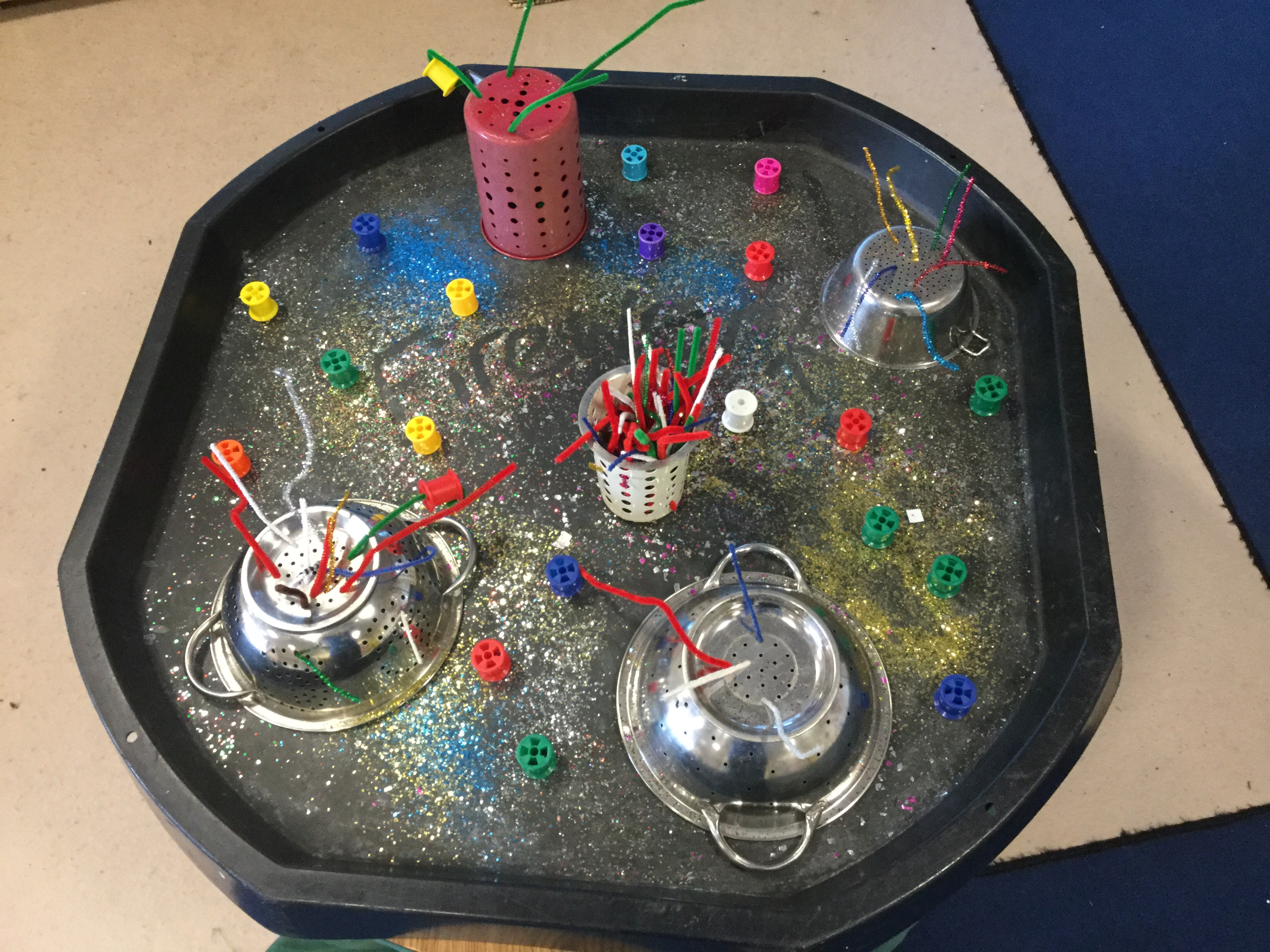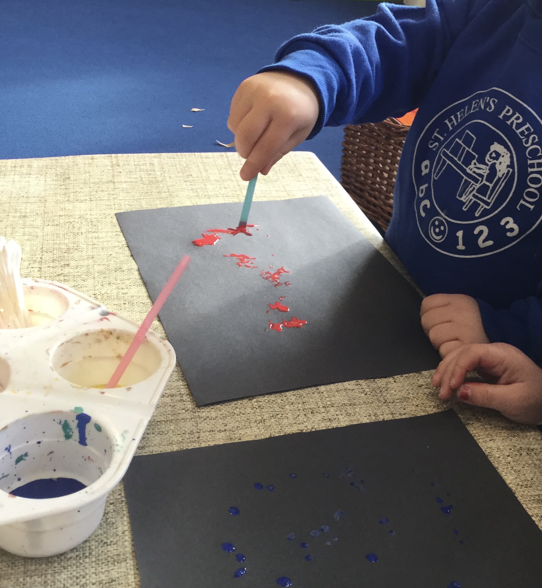 We created some amazing firework pictures exploring different ways to print, using marbles rolled in paint and adding glitter for the sparkle effect. And also using frayed cardboard tubes and straws to give a firework shape. 🎇
