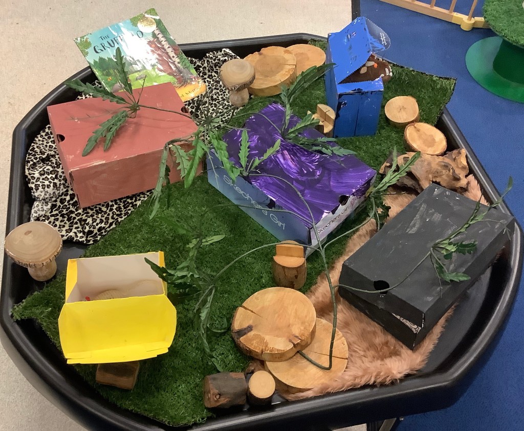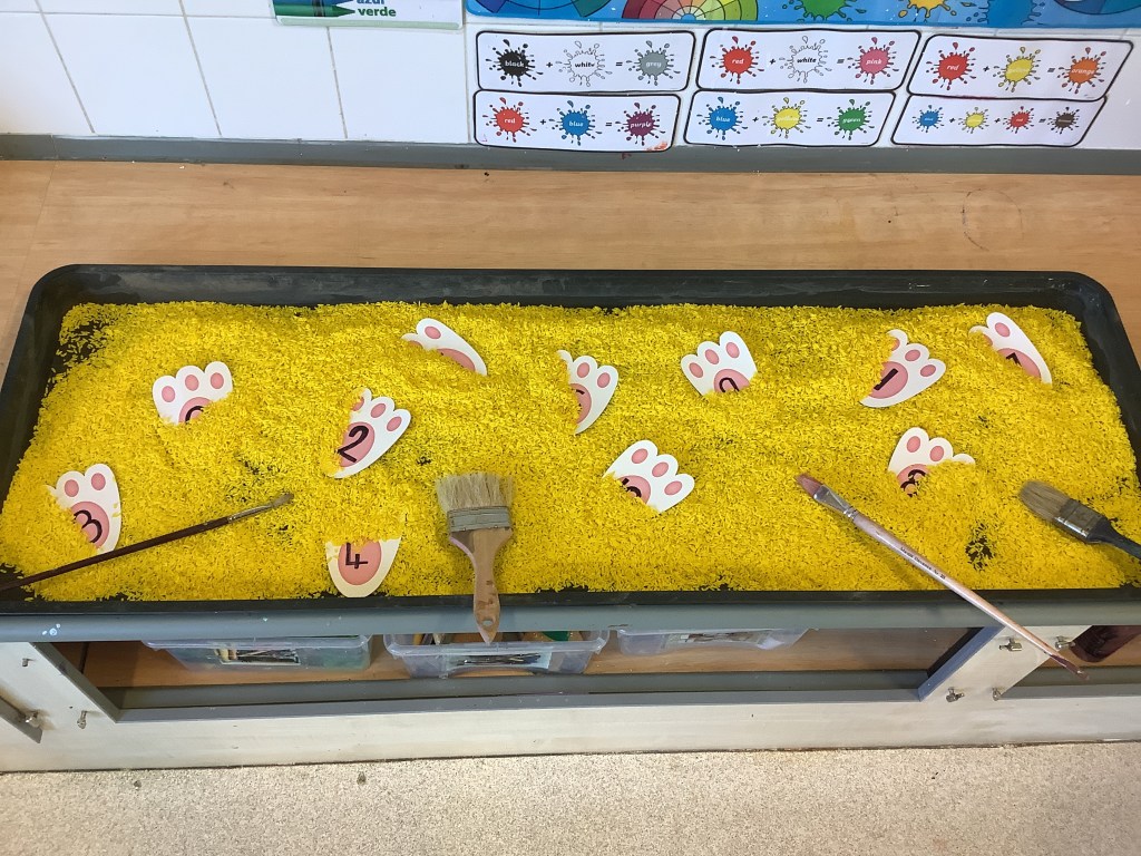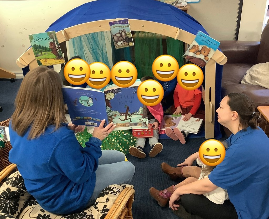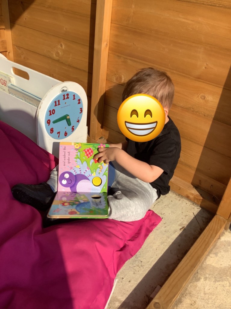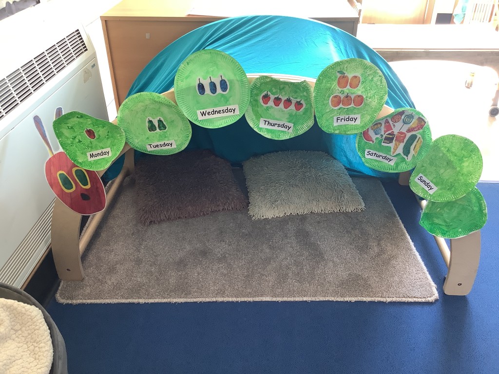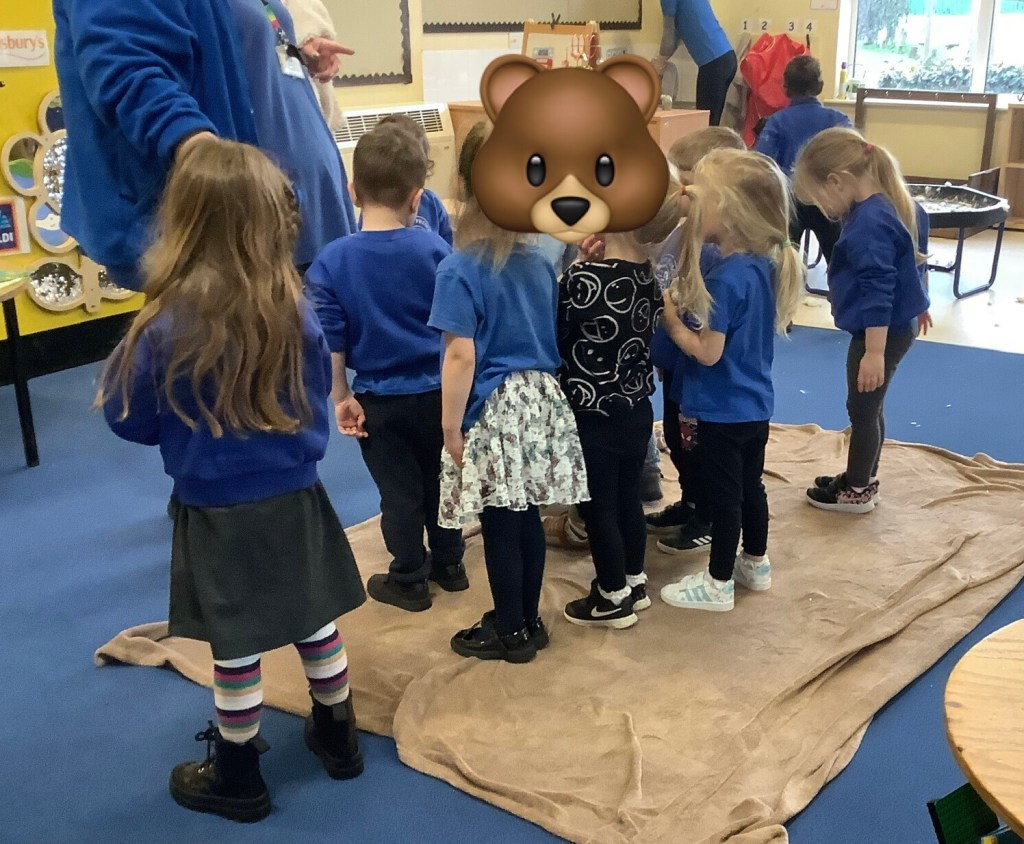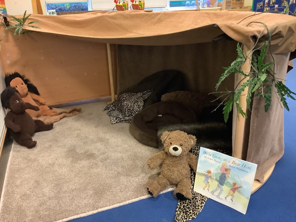 Our book theme for this half term is “we’re going on a bear hunt.” So we’ve set out lots of activities based on the book. For example, bear hunt yoga, a bear hunt around the garden, bear hunt hide and seek, a bear hunt sensory experience. We added a cave to the yellow room.