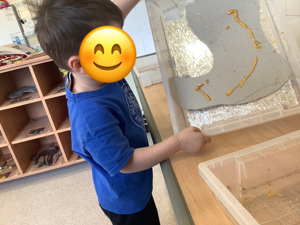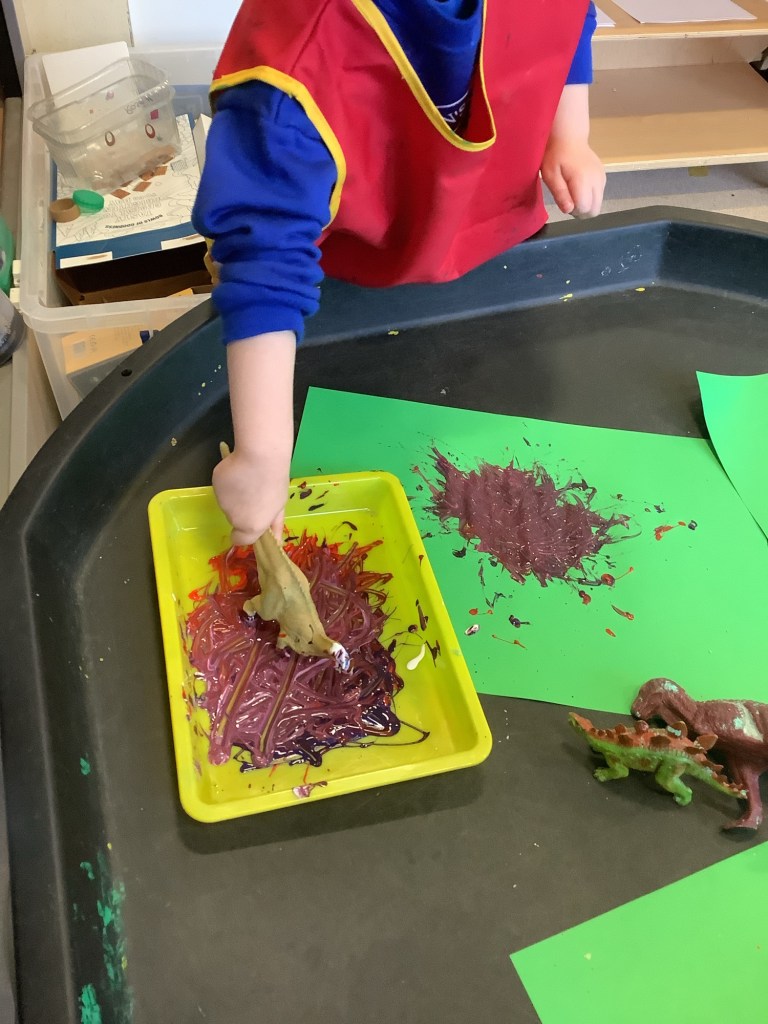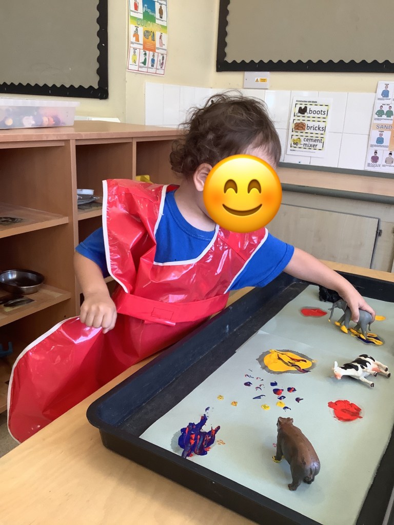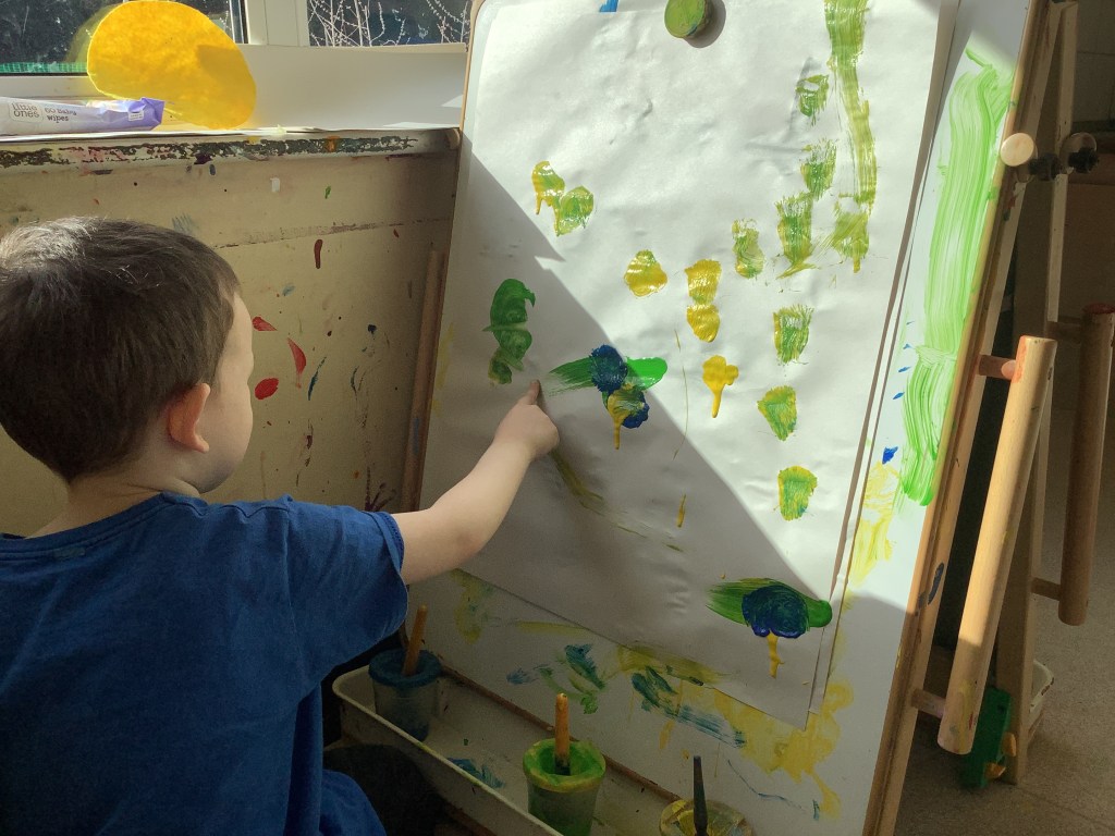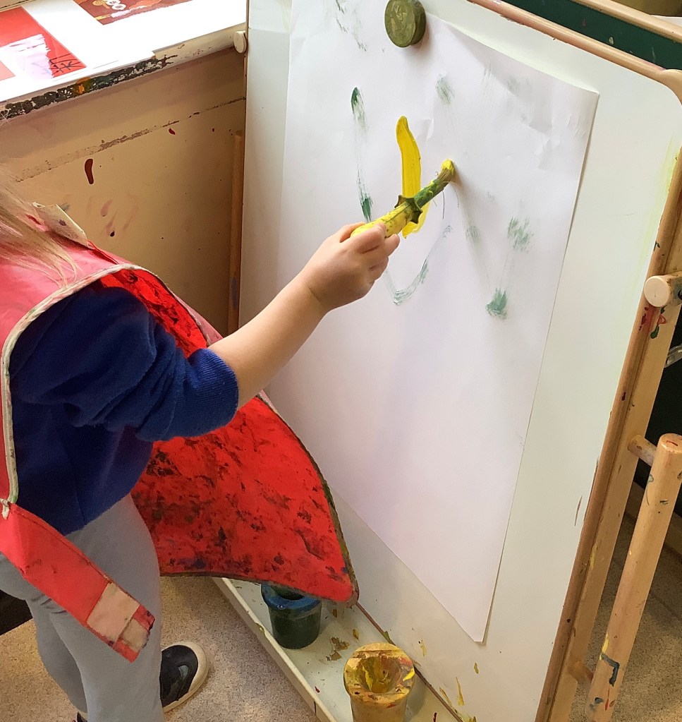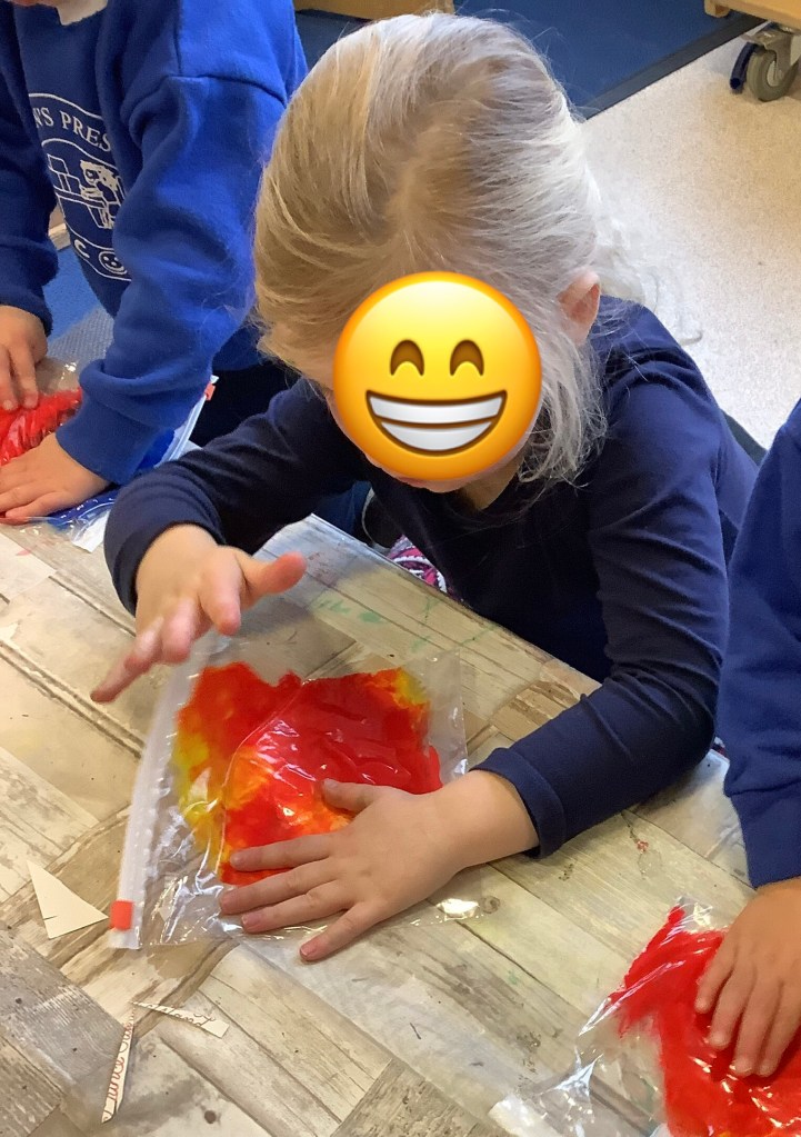 The children have been exploring colour mixing using paint in ziplock backs, to poke, squish and squeeze, guessing what colour it might change to. Some boys and girls carried this on at the paint easel, wondering what would happen to mix colours on the paper… and in their hands. What a lovely squishy experience.