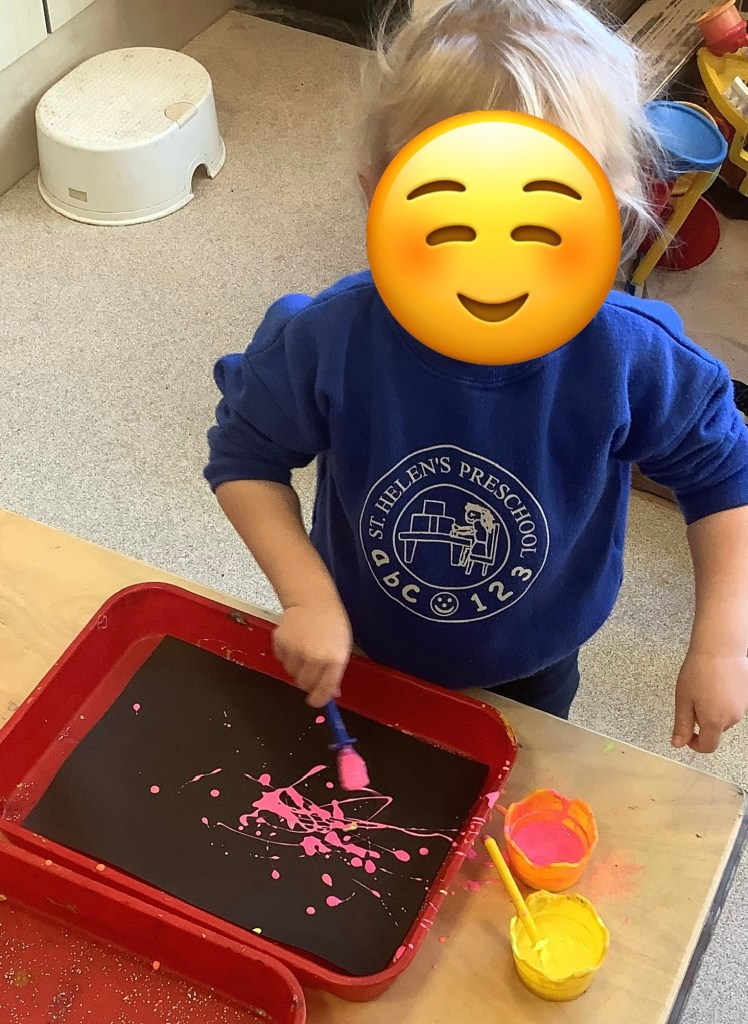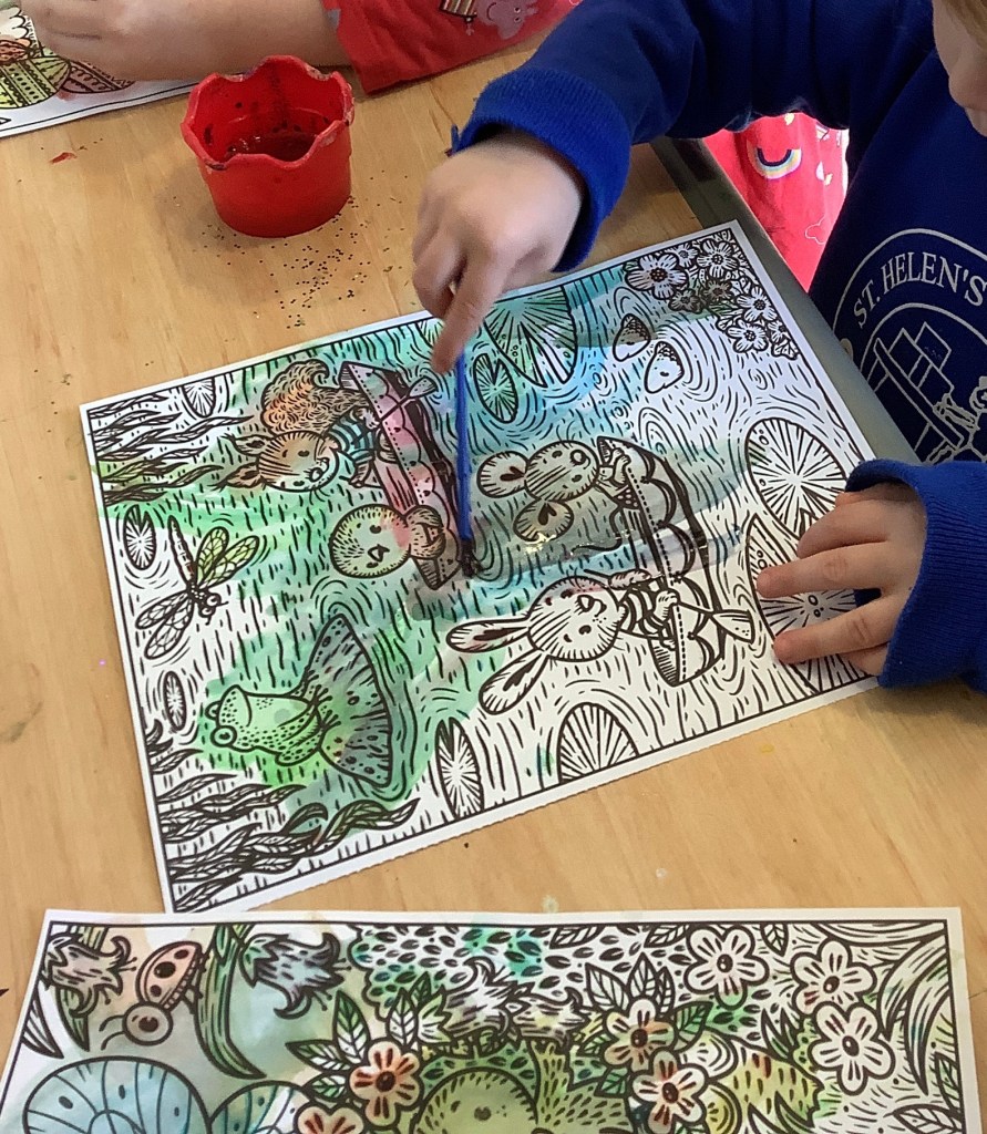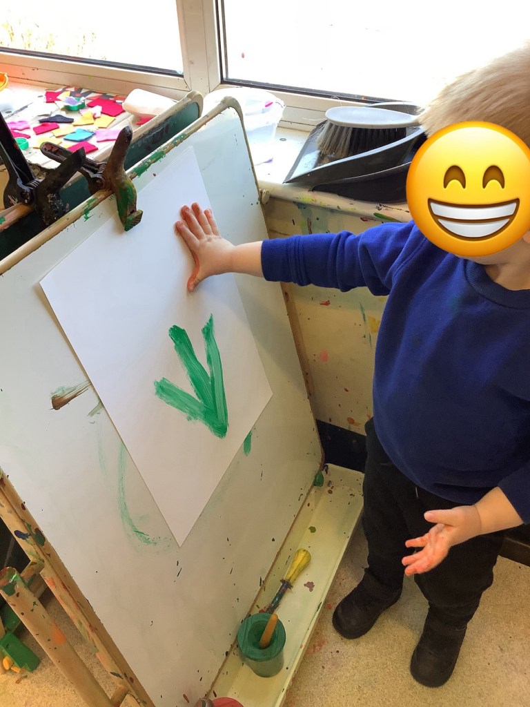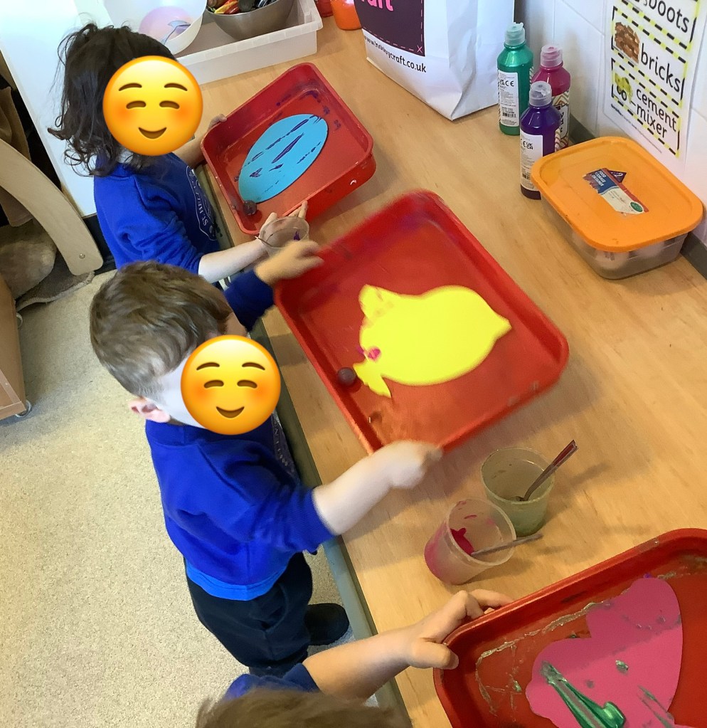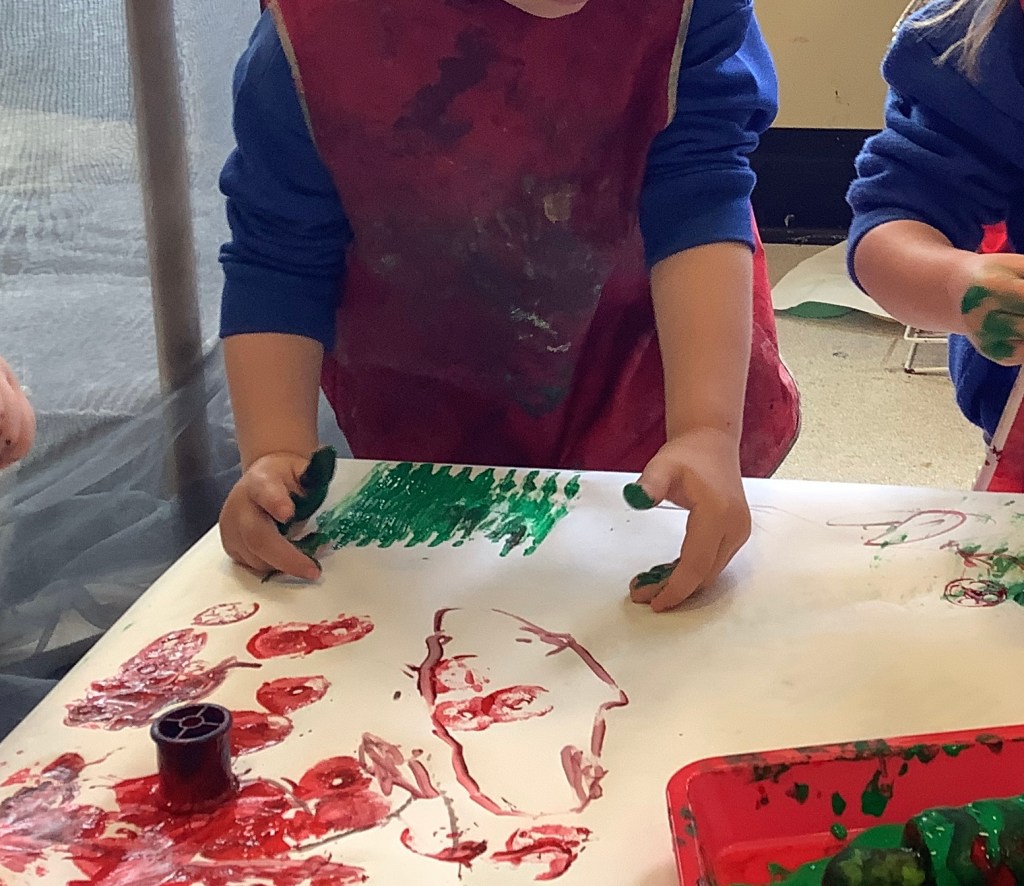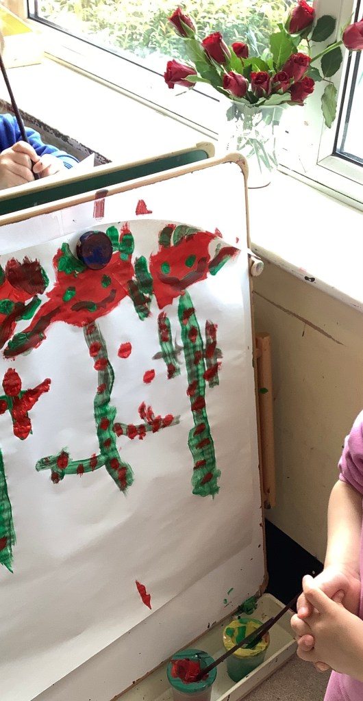 The children have been exploring colour mixing using paint in ziplock backs, to poke, squish and squeeze, guessing what colour it might change to. Some boys and girls carried this on at the paint easel, wondering what would happen to mix colours on the paper… and in their hands. What a lovely squishy experience.
