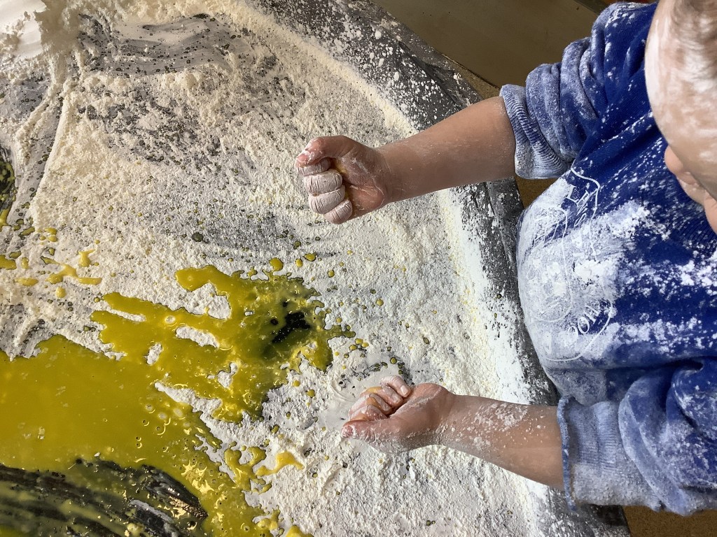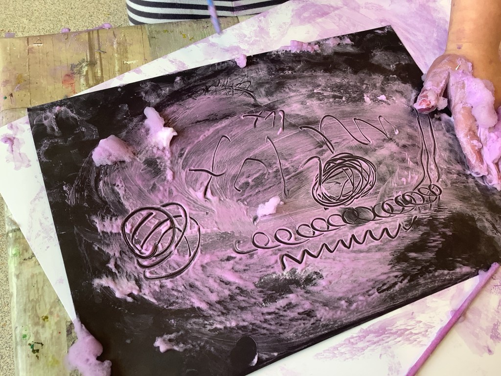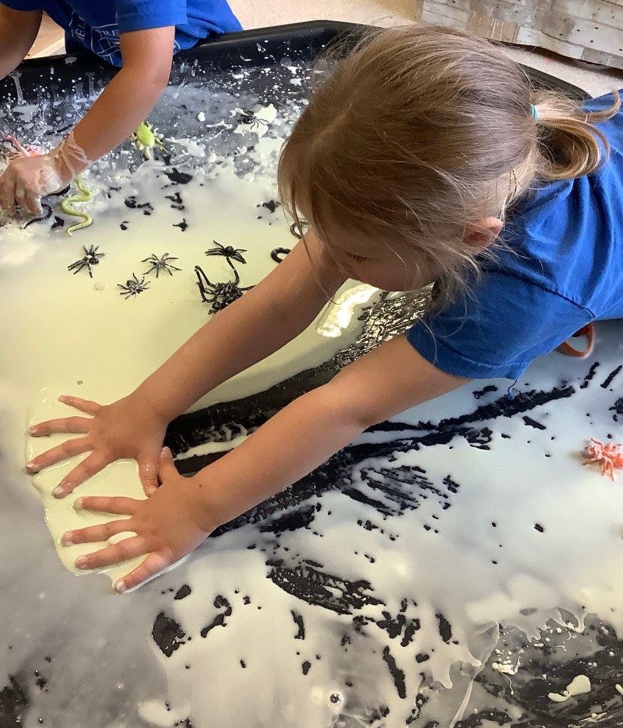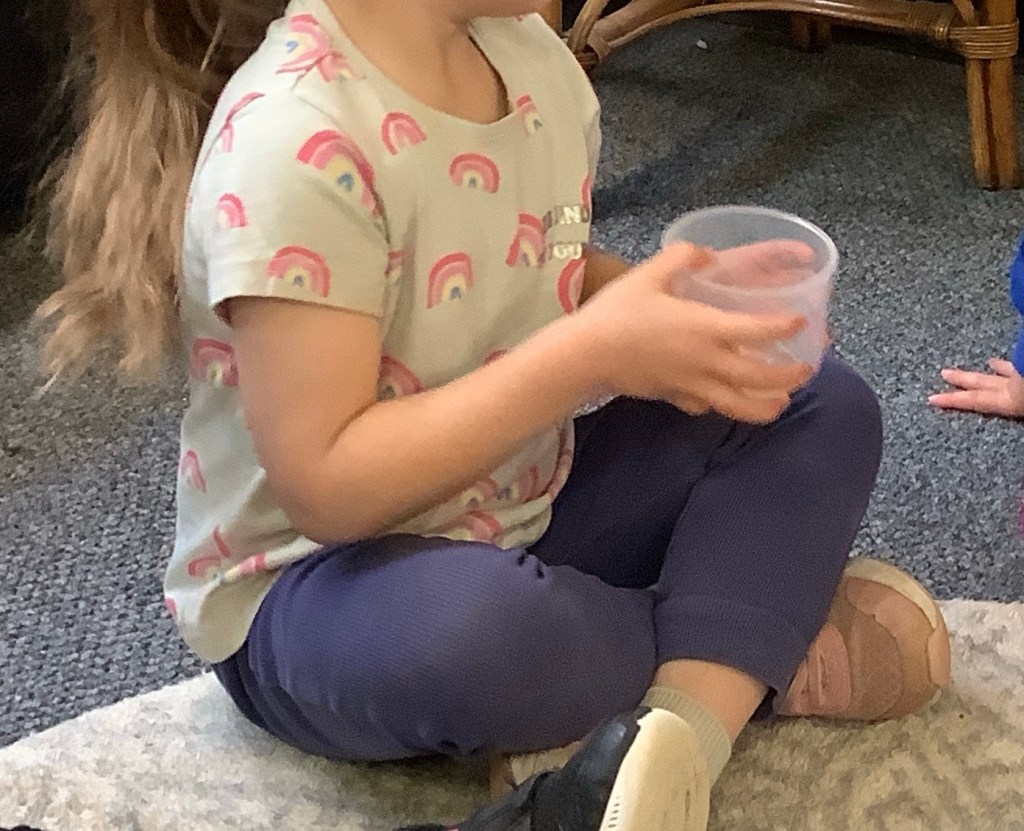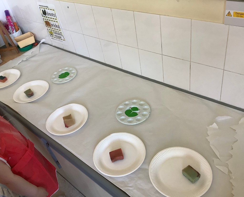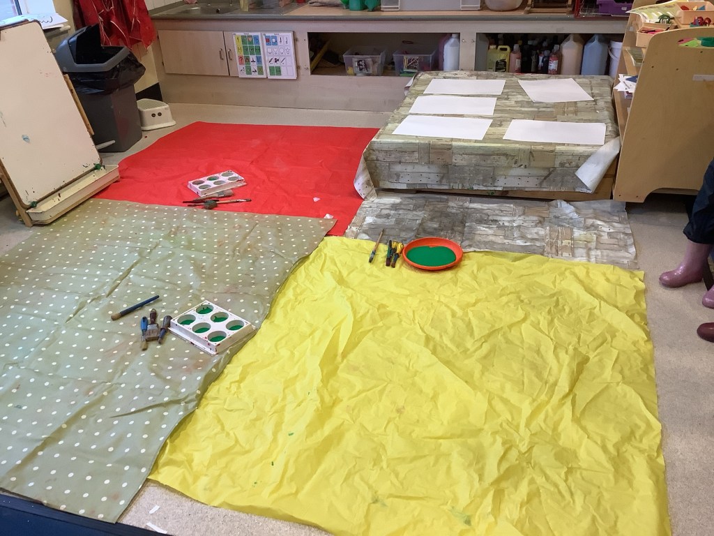 The children have been exploring colour mixing using paint in ziplock backs, to poke, squish and squeeze, guessing what colour it might change to. Some boys and girls carried this on at the paint easel, wondering what would happen to mix colours on the paper… and in their hands. What a lovely squishy experience.