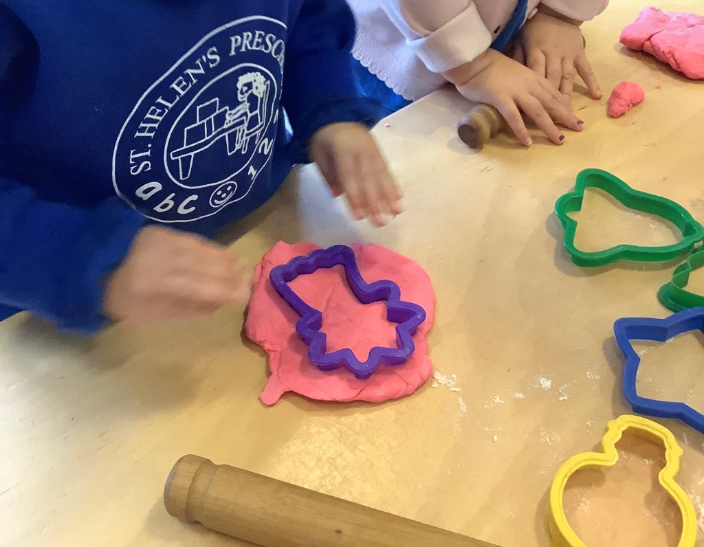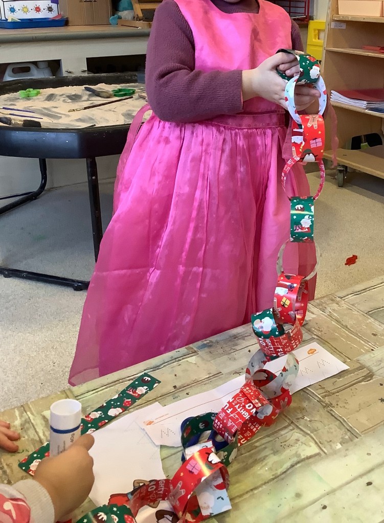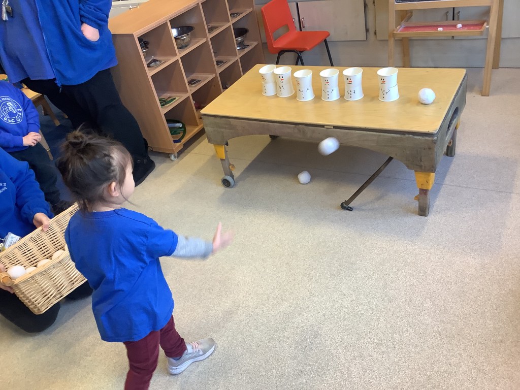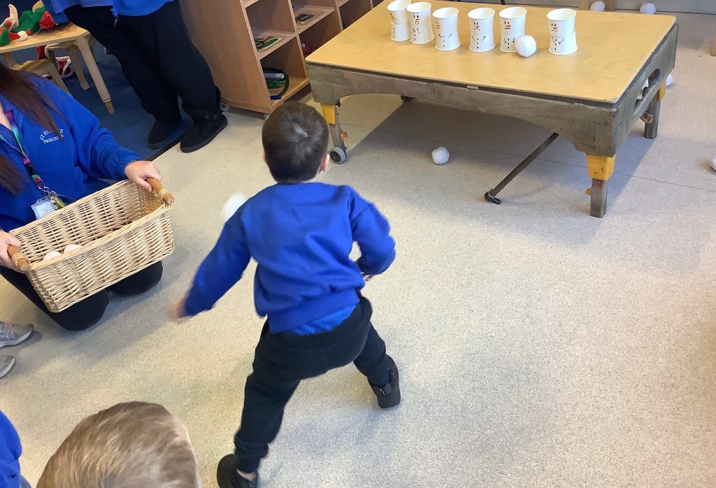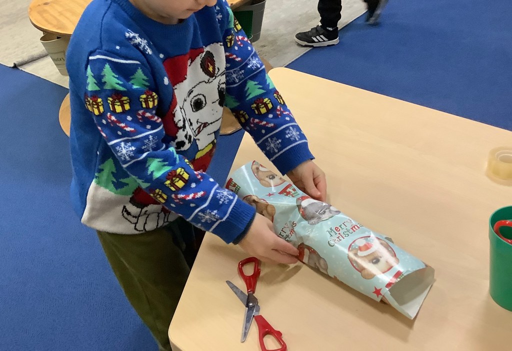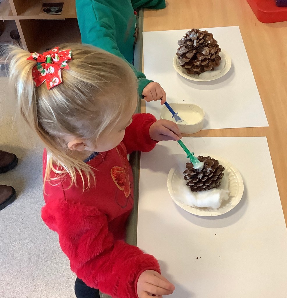We’ve enjoyed lots of Christmas/winter themed activities this month. A snowball throwing target game, present wrapping station, card making, snowy small world play, gingerbread play dough, marble painting, dressing up, pine cone decorating, cosy Christmas stories, ice colour mixing, Christmas music and movement, just to name a few.