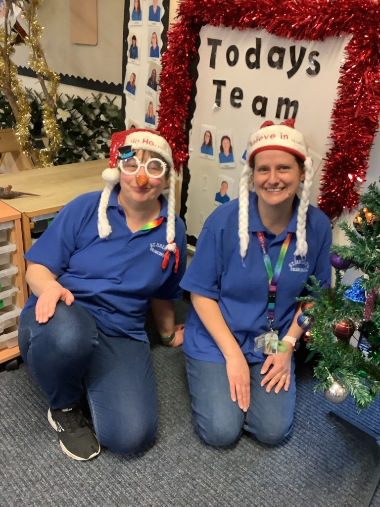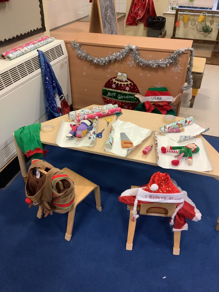 On December the 1st a very special visitor appeared in the setting, inside a balloon. He said he was sent from the North Pole and using a suggestion from one of the children we named him Alan the elf. He was a mischievous little elf and played lots of tricks on us.. including drawing over the ladies photos, ziplining across the snack area, riding on the back of incy our spider, and invading the Christmas stay and play sessions with his friends.