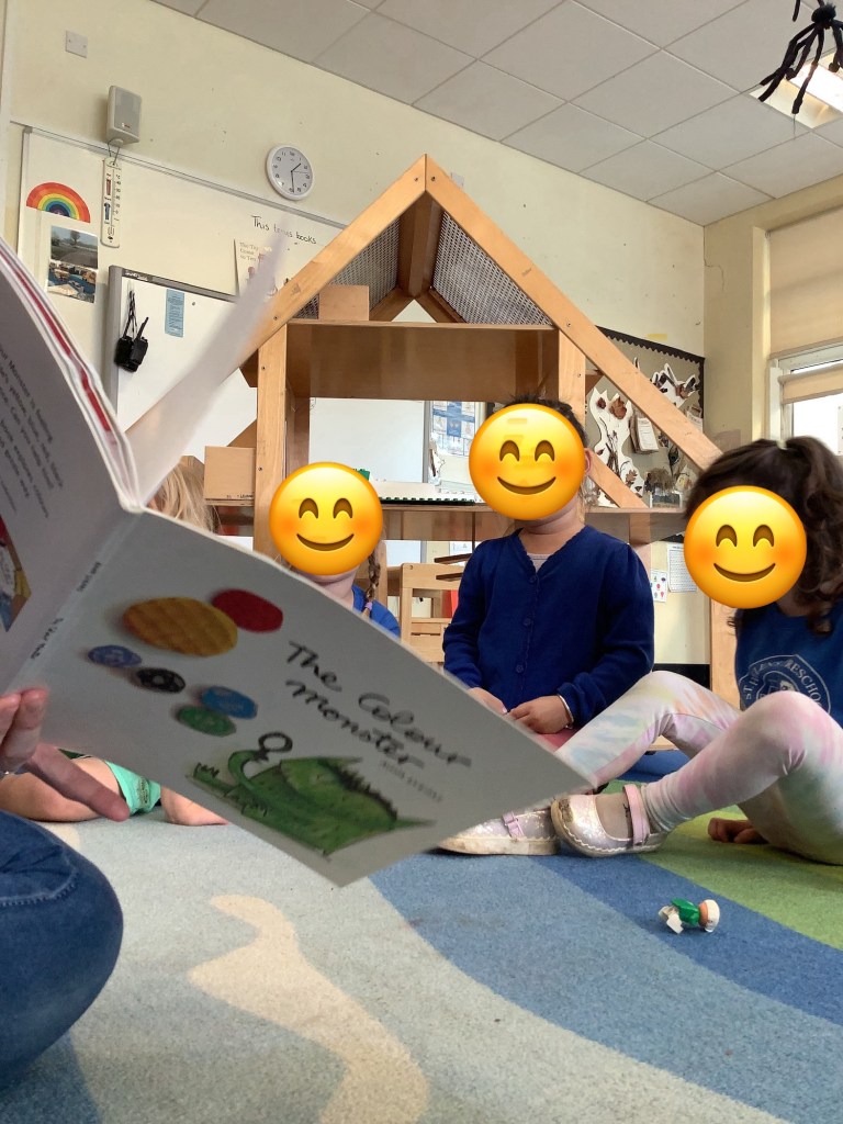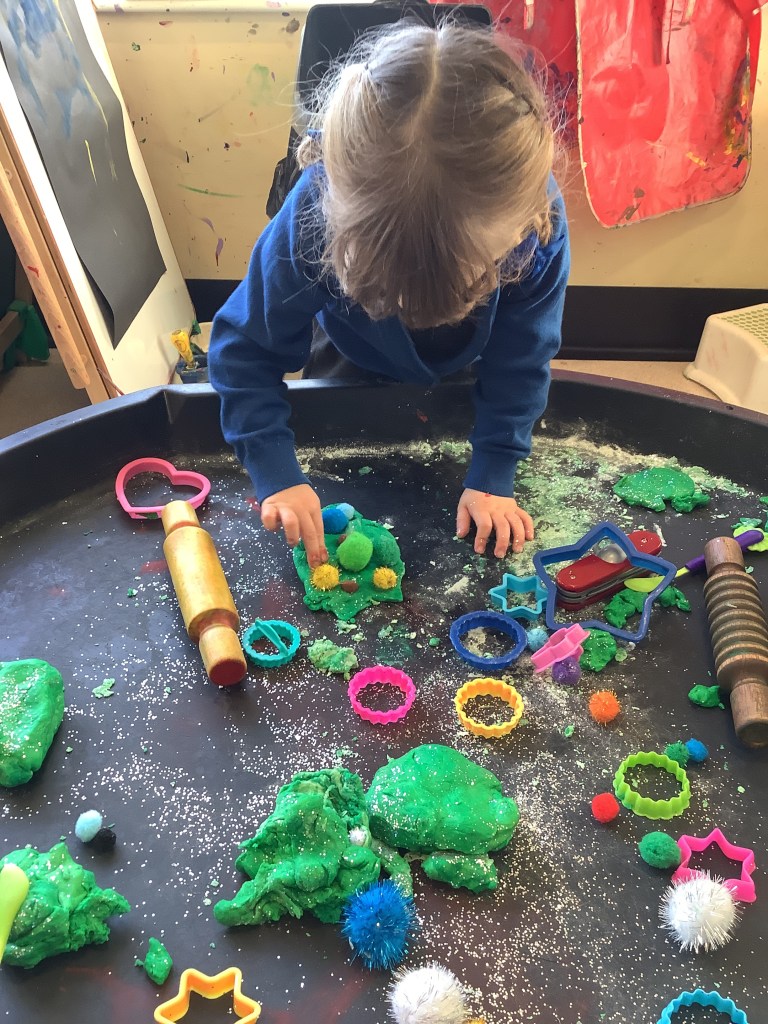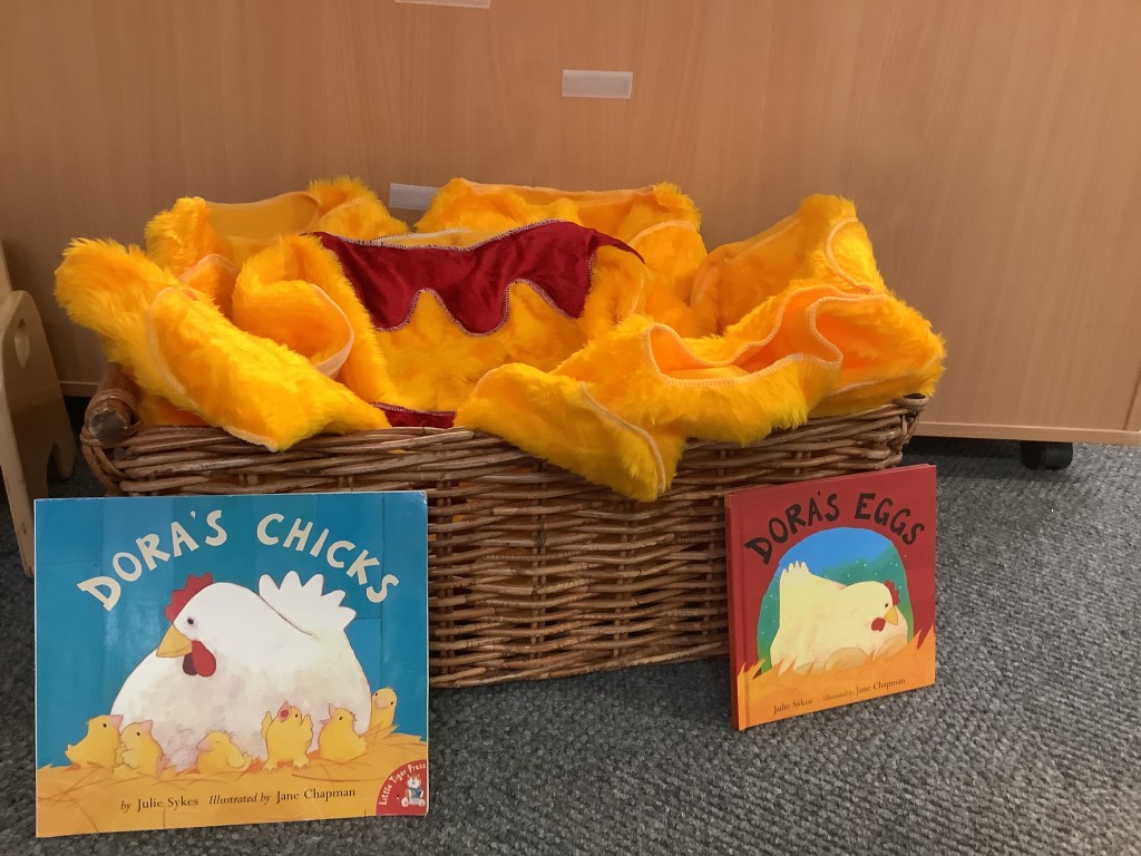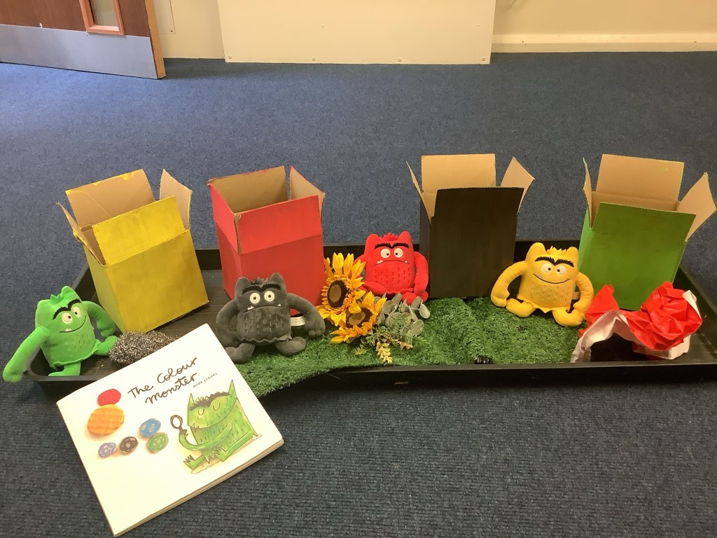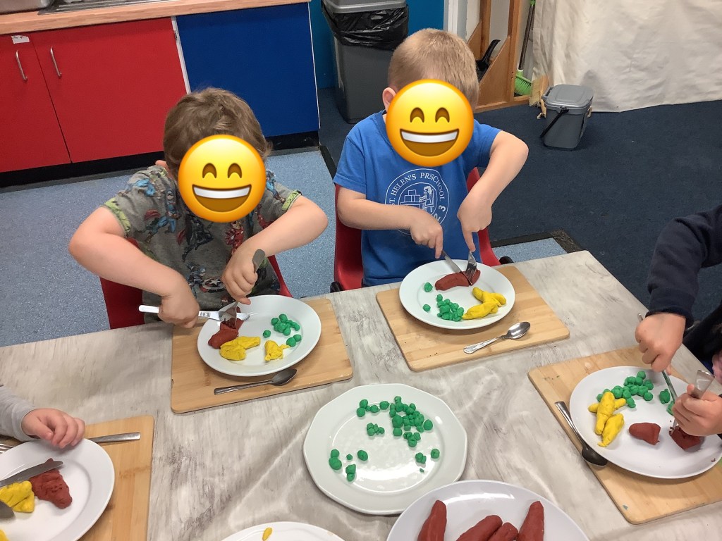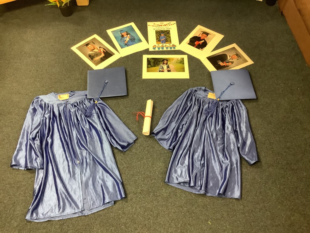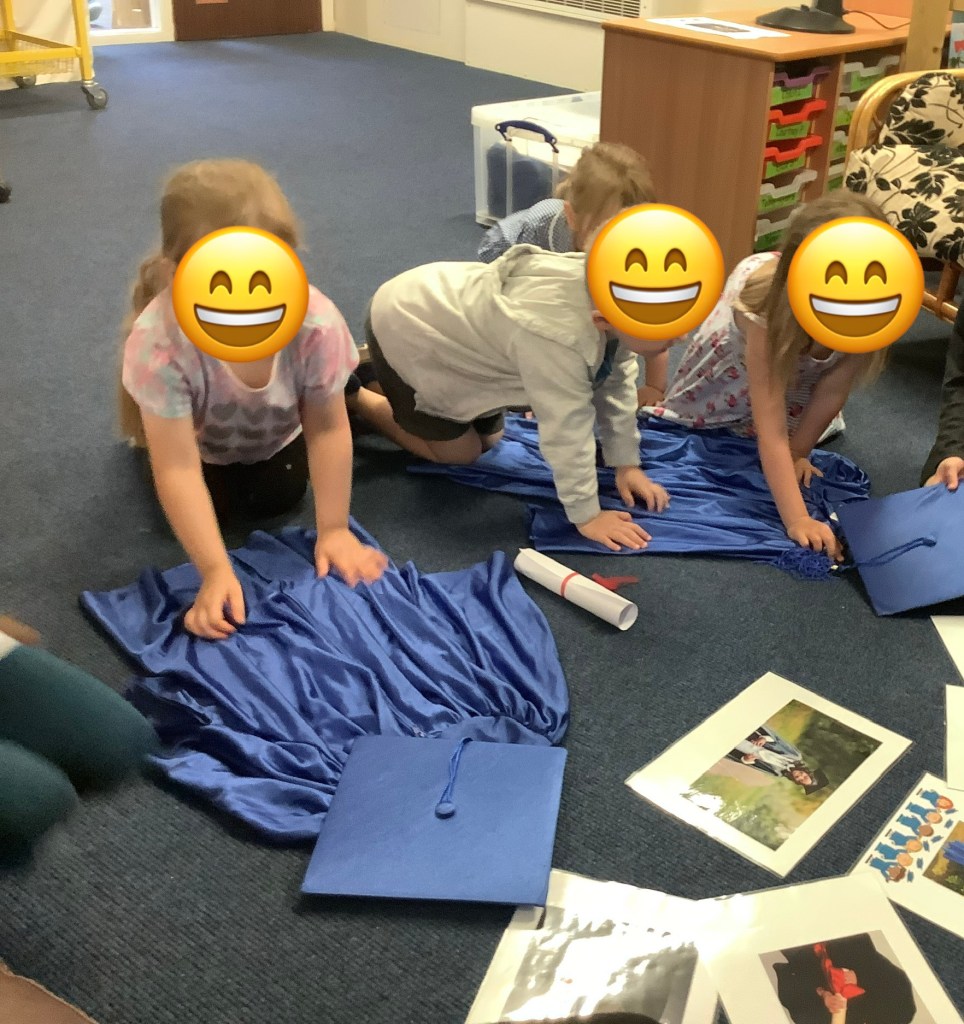 In support of our older children transitioning to big school, we’ve set out some activities to explore independence. Opening and closing tubs to release the trapped dinosaurs and get in practise for lunchtimes. We made a playdough dinner and used knives and forks to cut it up. In our role play school we’ve been trying on different uniforms and taking turns being the teacher. We had lots of activities based on emotions, giving us language and supporting our understanding of any big emotions we may be feeling especially at a time when there is so much talk of change. We had a look at some graduation gowns and talked about what it means to graduate from preschool.