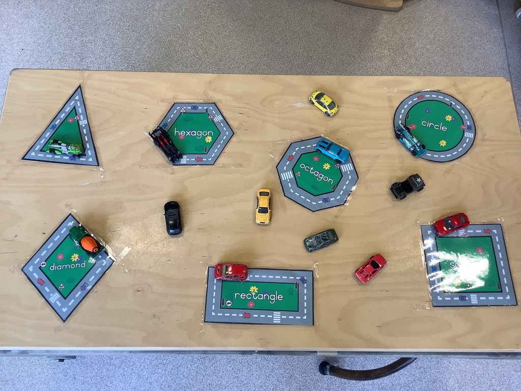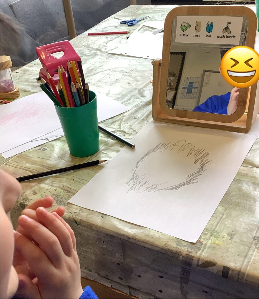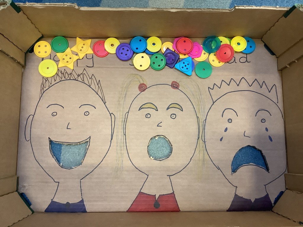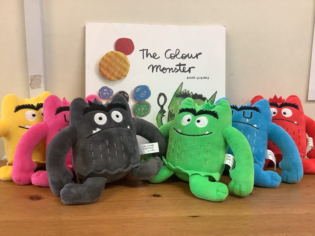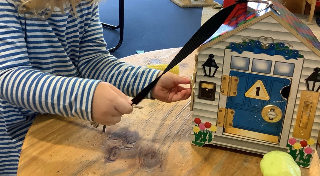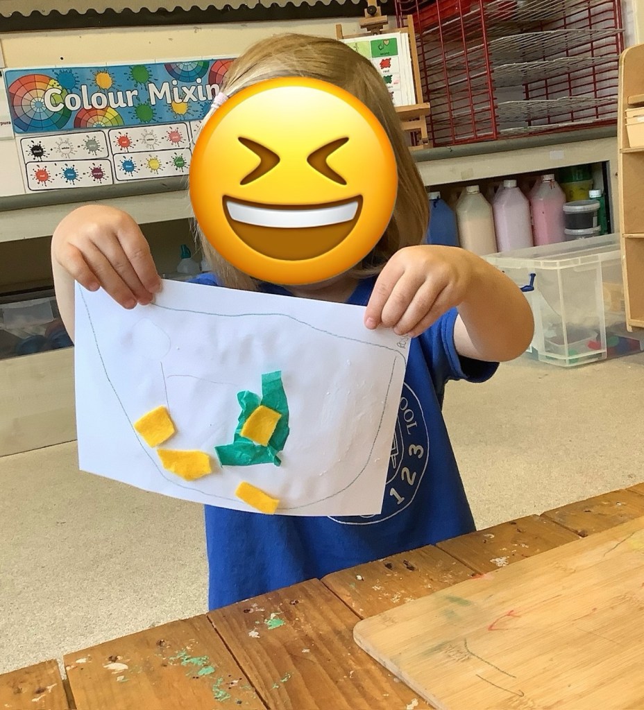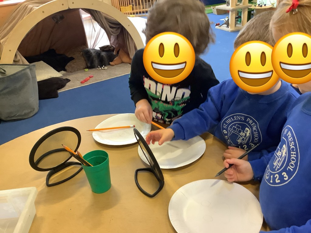 In support of our older children transitioning to big school, we’ve set out some activities to explore independence. Opening and closing tubs to release the trapped dinosaurs and get in practise for lunchtimes. We made a playdough dinner and used knives and forks to cut it up. In our role play school we’ve been trying on different uniforms and taking turns being the teacher. We had lots of activities based on emotions, giving us language and supporting our understanding of any big emotions we may be feeling especially at a time when there is so much talk of change. We had a look at some graduation gowns and talked about what it means to graduate from preschool.