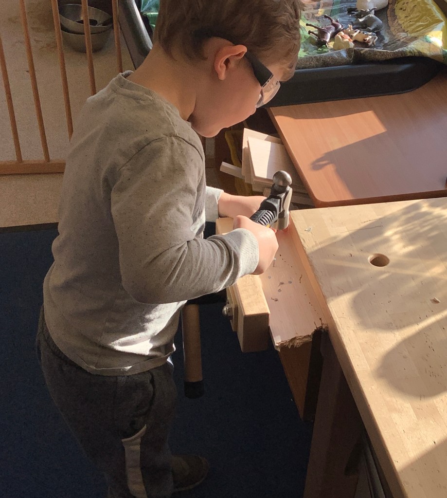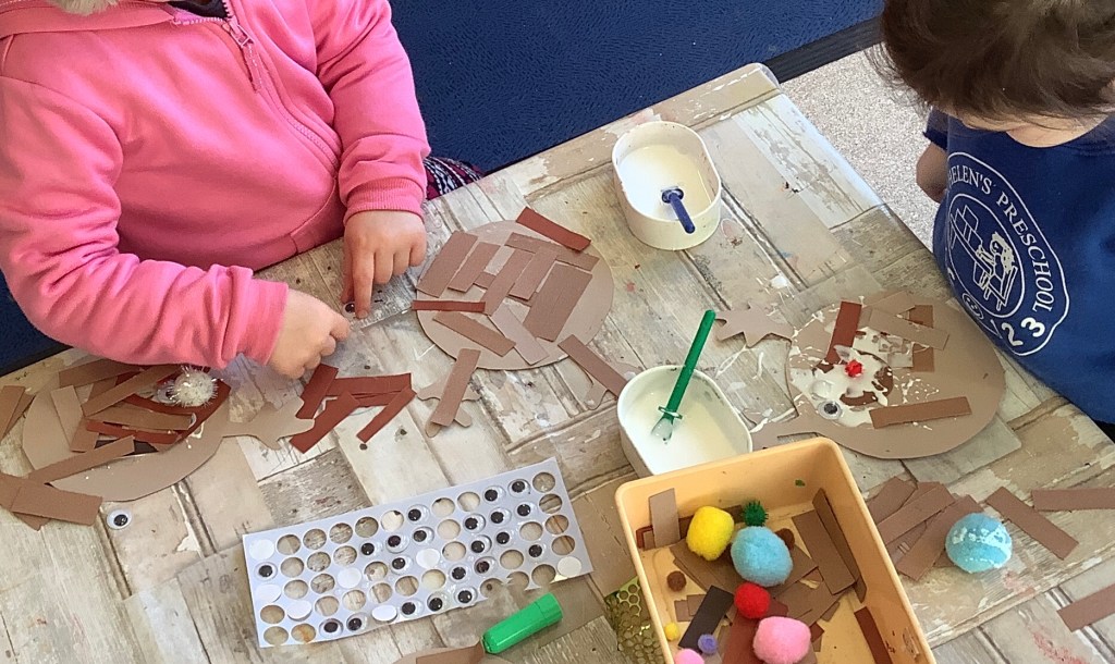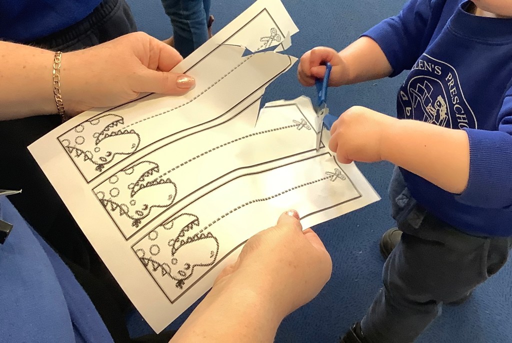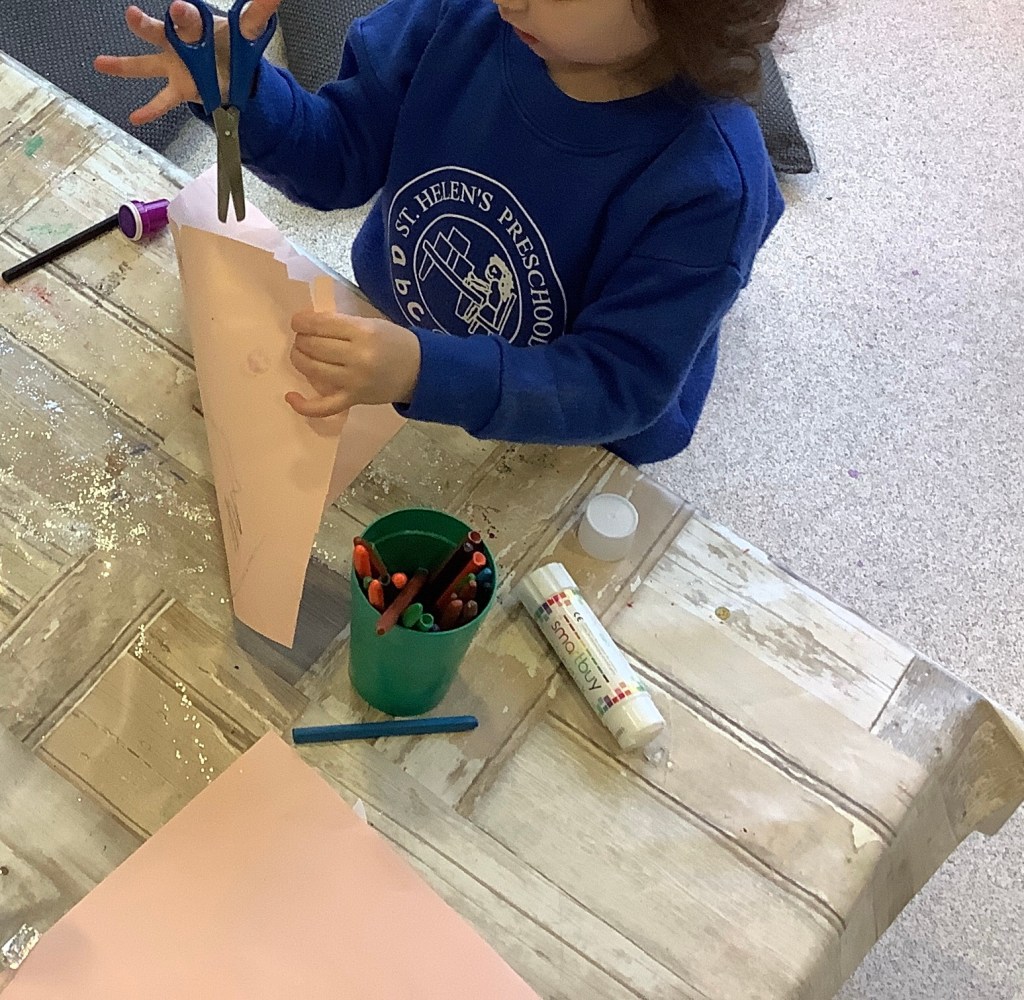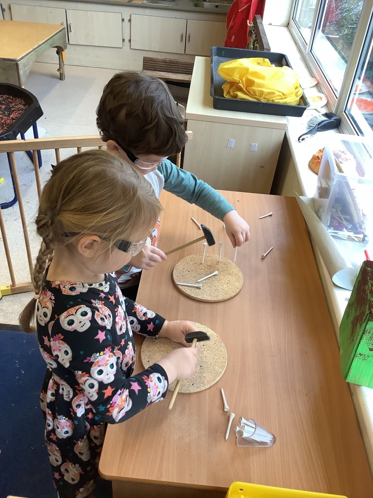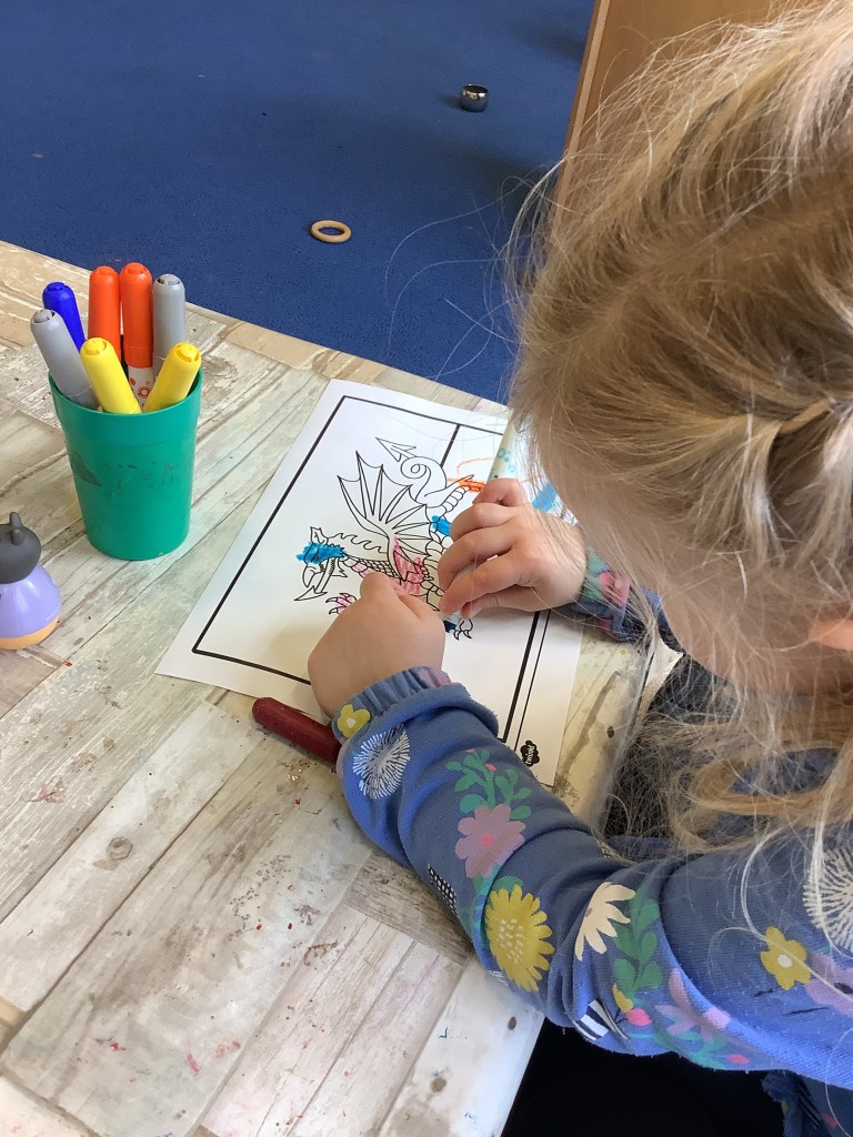 The children have been practising concentration and control, following lines using scissors, or pencils, and colouring sheets. And some children had a turn in the woodwork area, creating their own masterpieces.