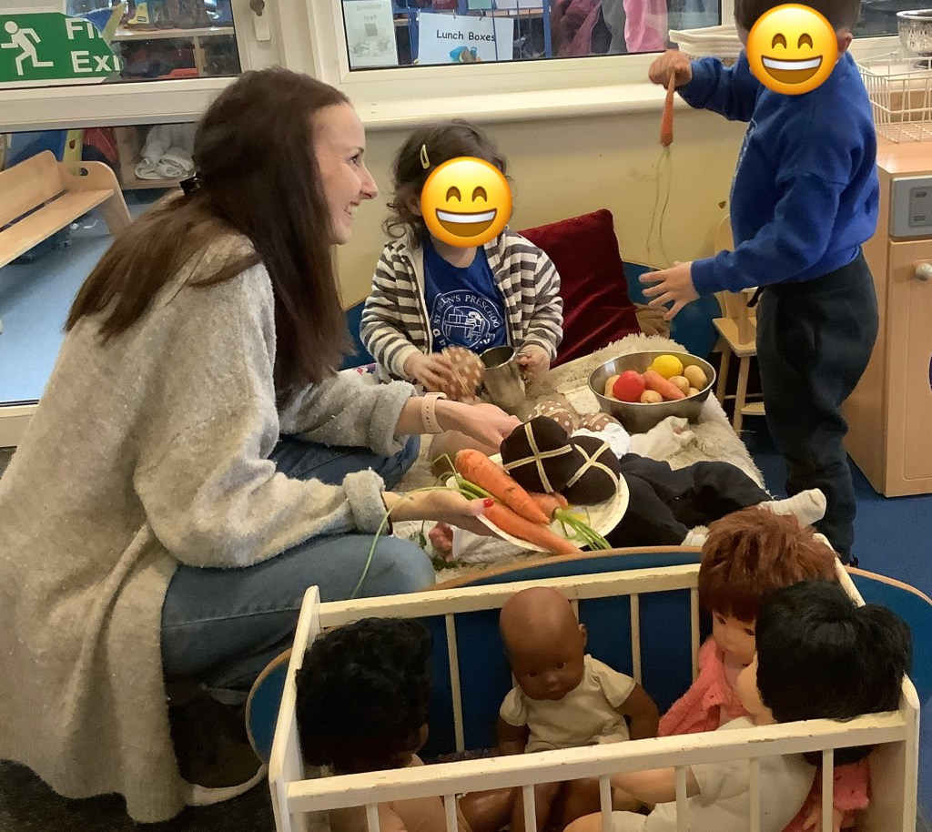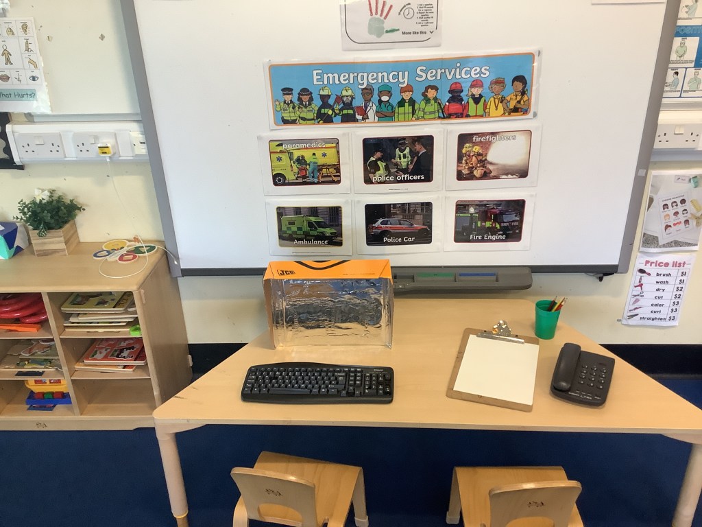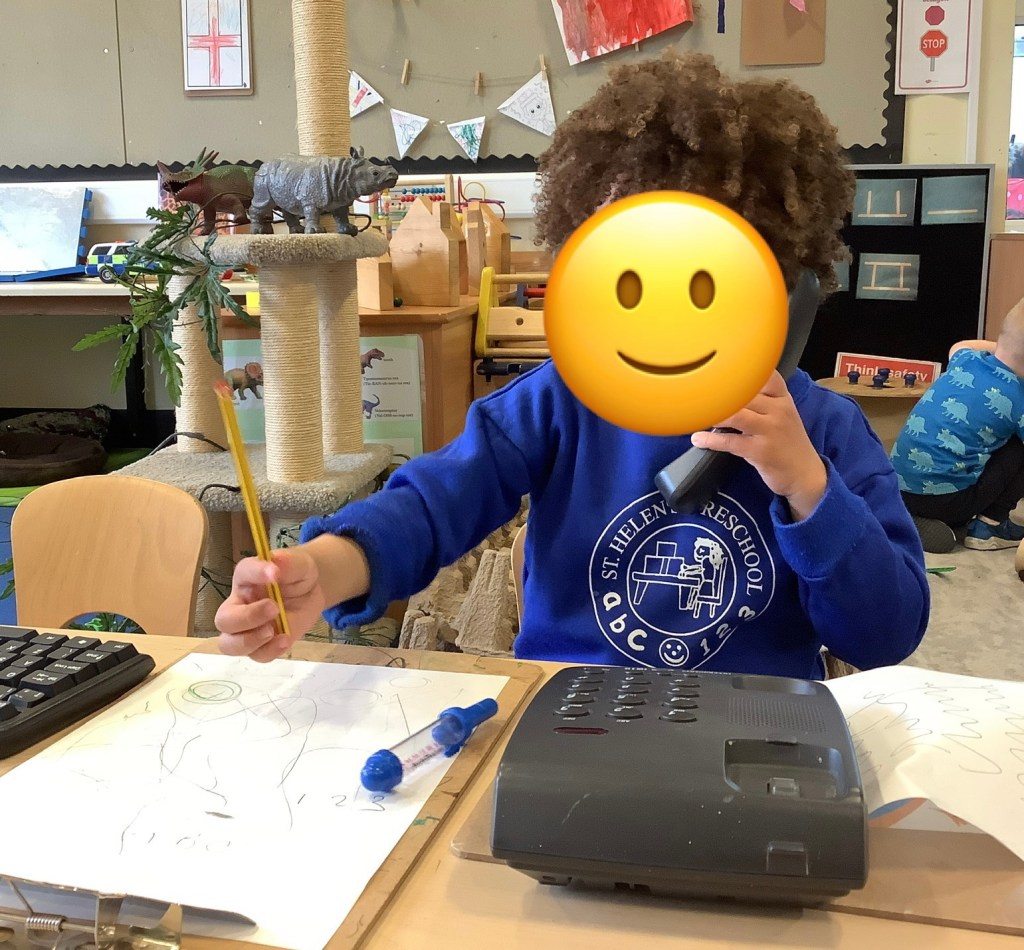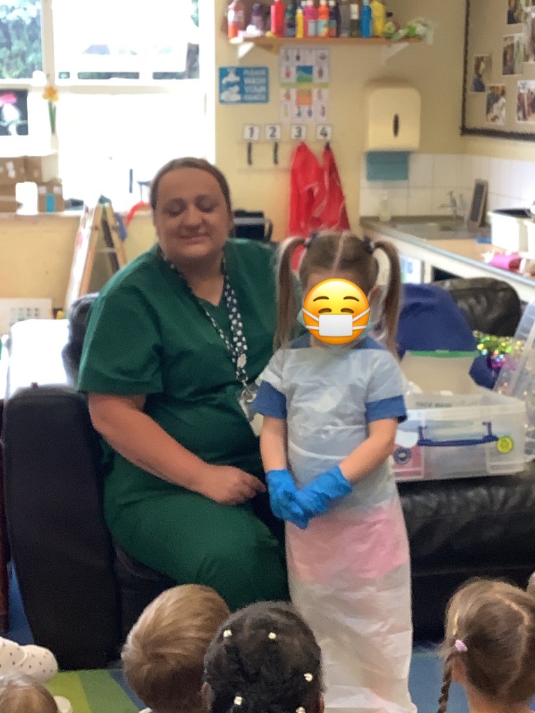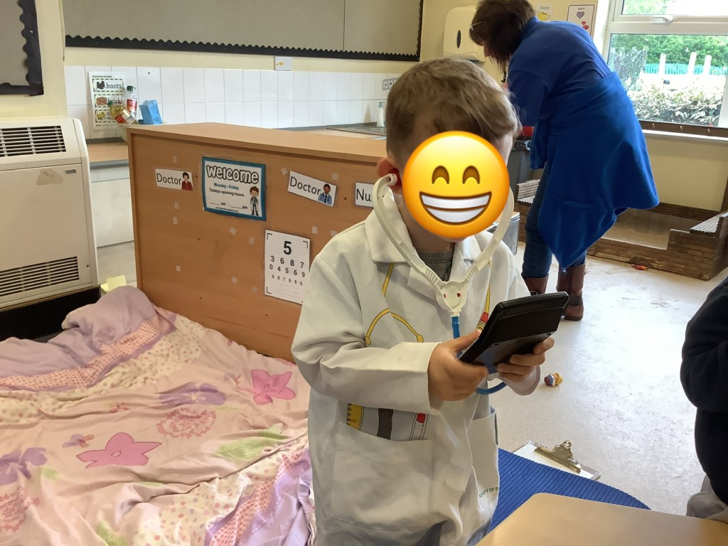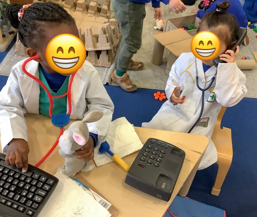 Moving on to our theme of occupations, the children have been roleplaying in St Helens doctors surgery. Using the apparatus to check their patients in, taking turns to be the patient or the doctor and even caring for some of the ladies!