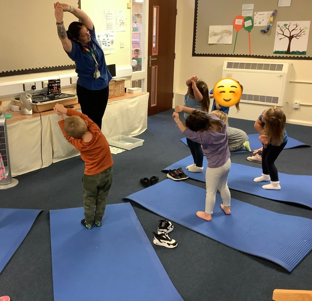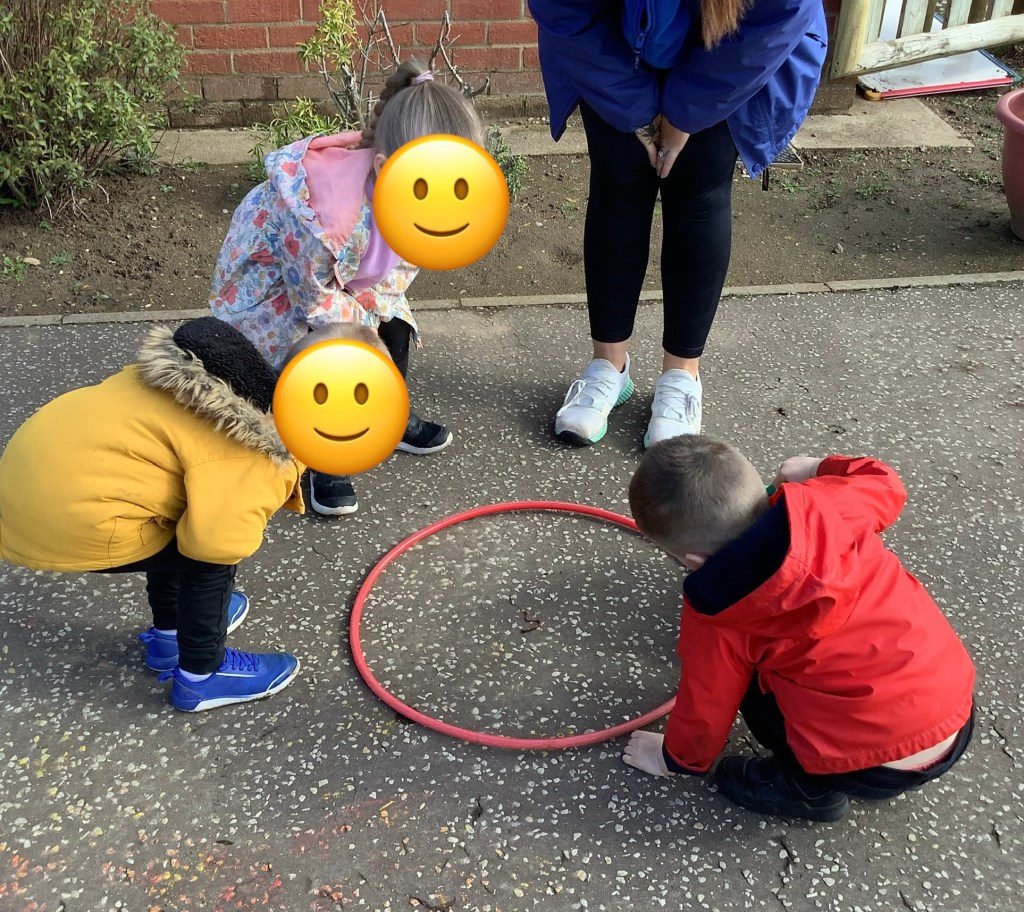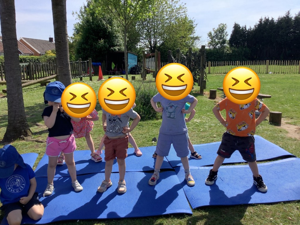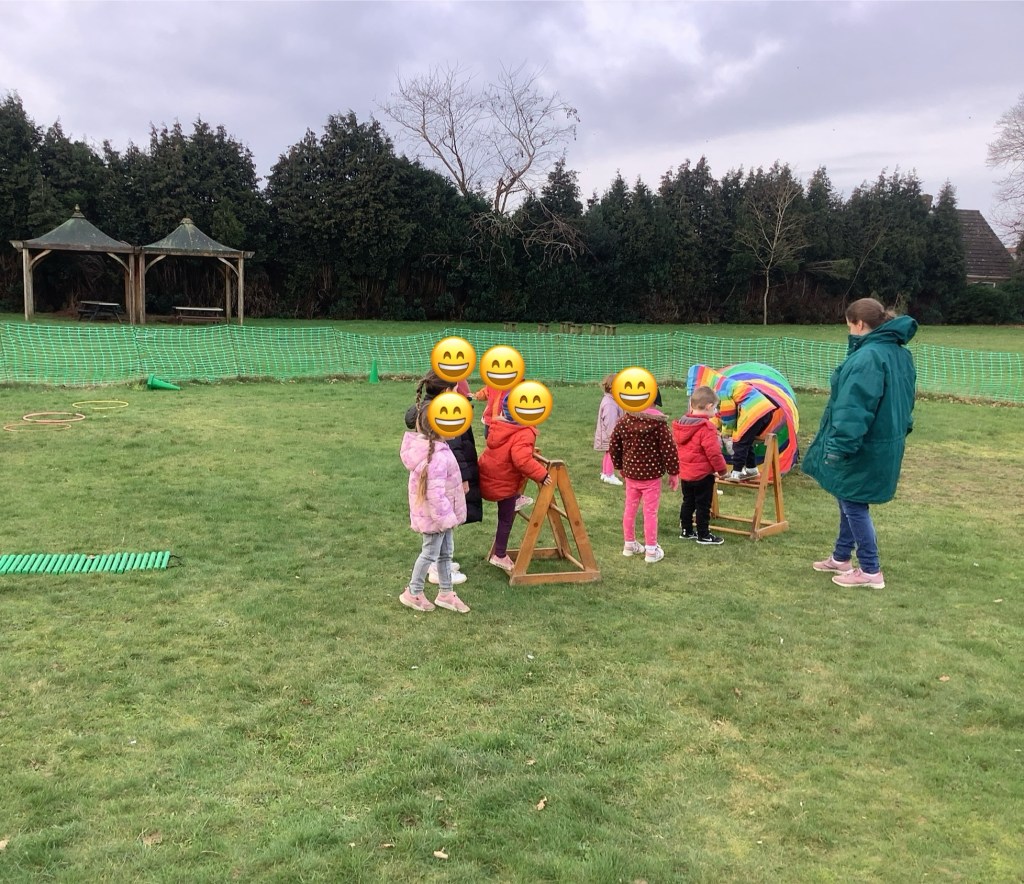 We’ve been exploring our bodies, looking at facial features and their purposes. We had a yoga session working on balance and looking at some different shapes along the way. In the garden we have been climbing over the trim train and building our own obstacle courses using the hoops and balance beams. Lots of great gross motor work.
