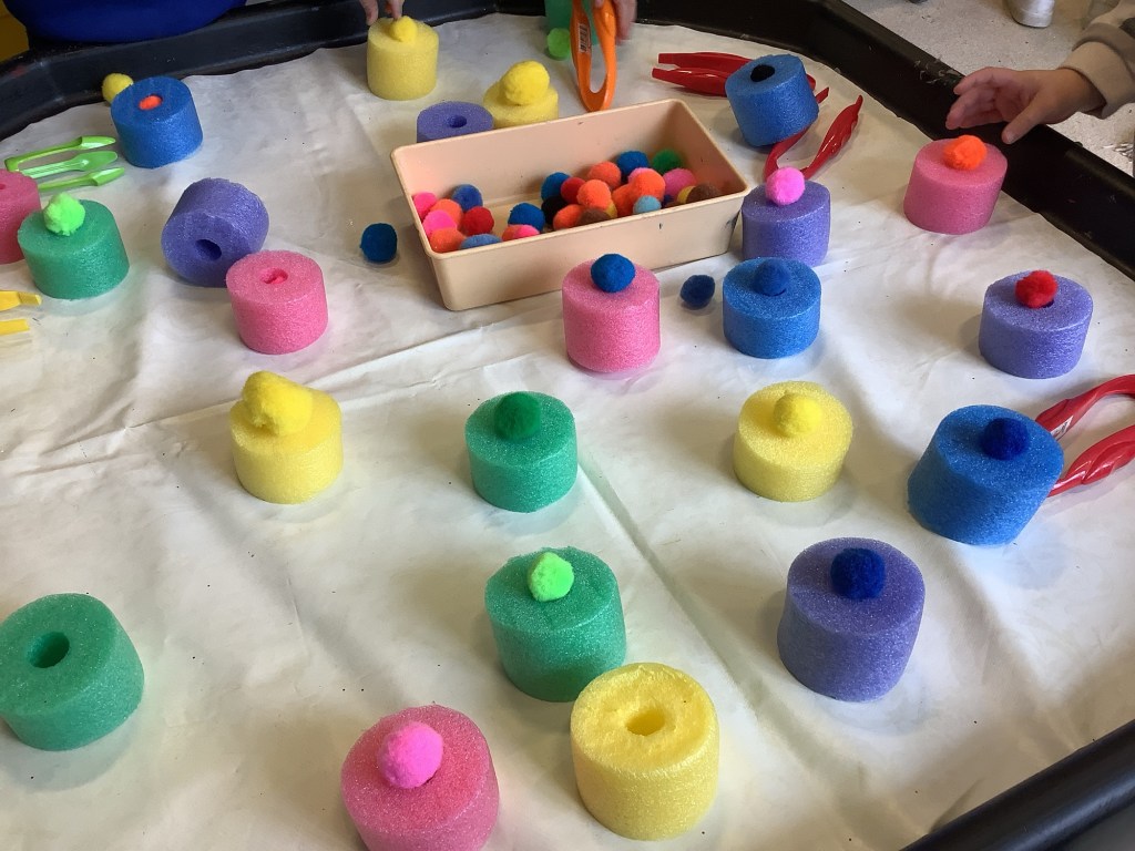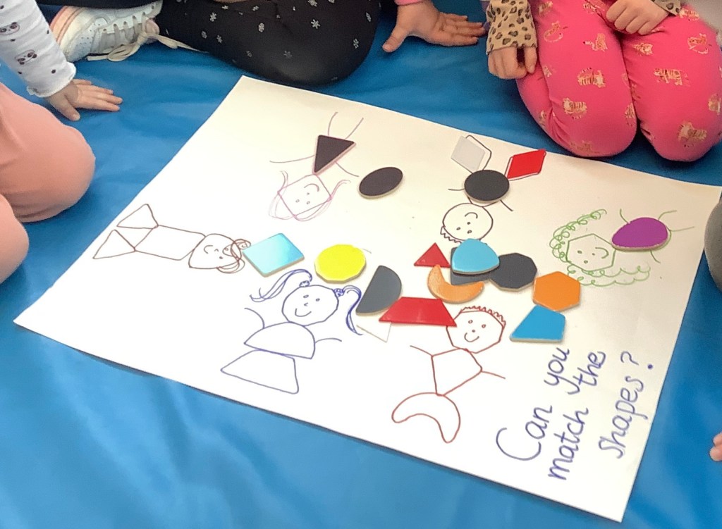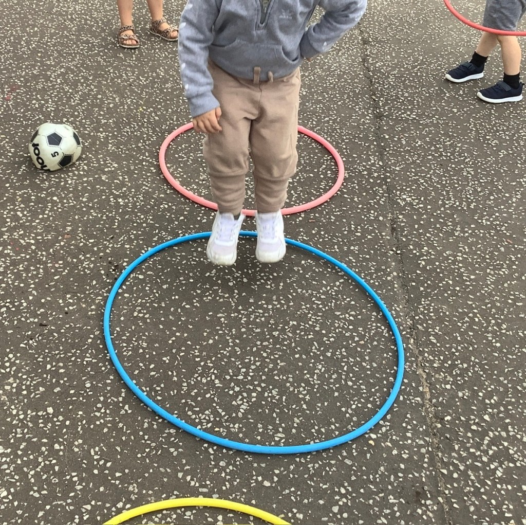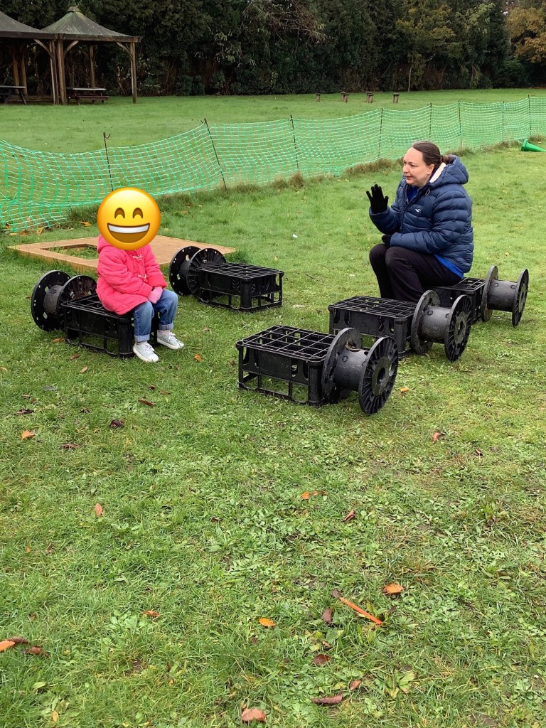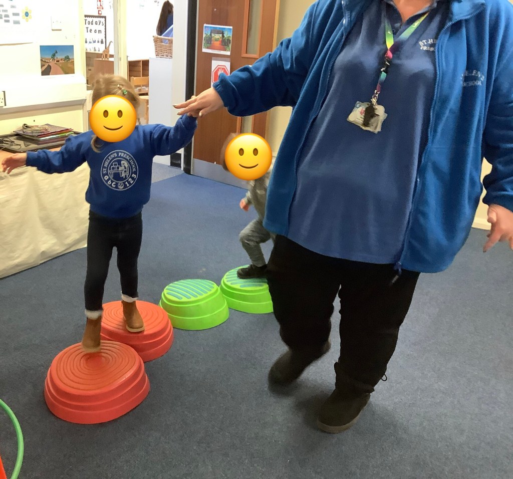 We’ve been exploring our bodies, looking at facial features and their purposes. We had a yoga session working on balance and looking at some different shapes along the way. In the garden we have been climbing over the trim train and building our own obstacle courses using the hoops and balance beams. Lots of great gross motor work.