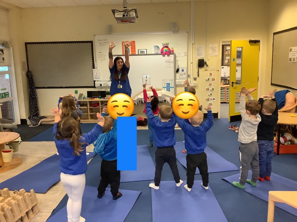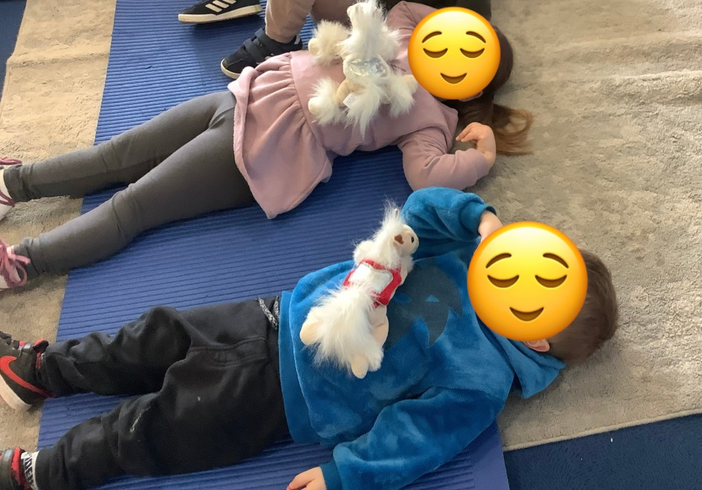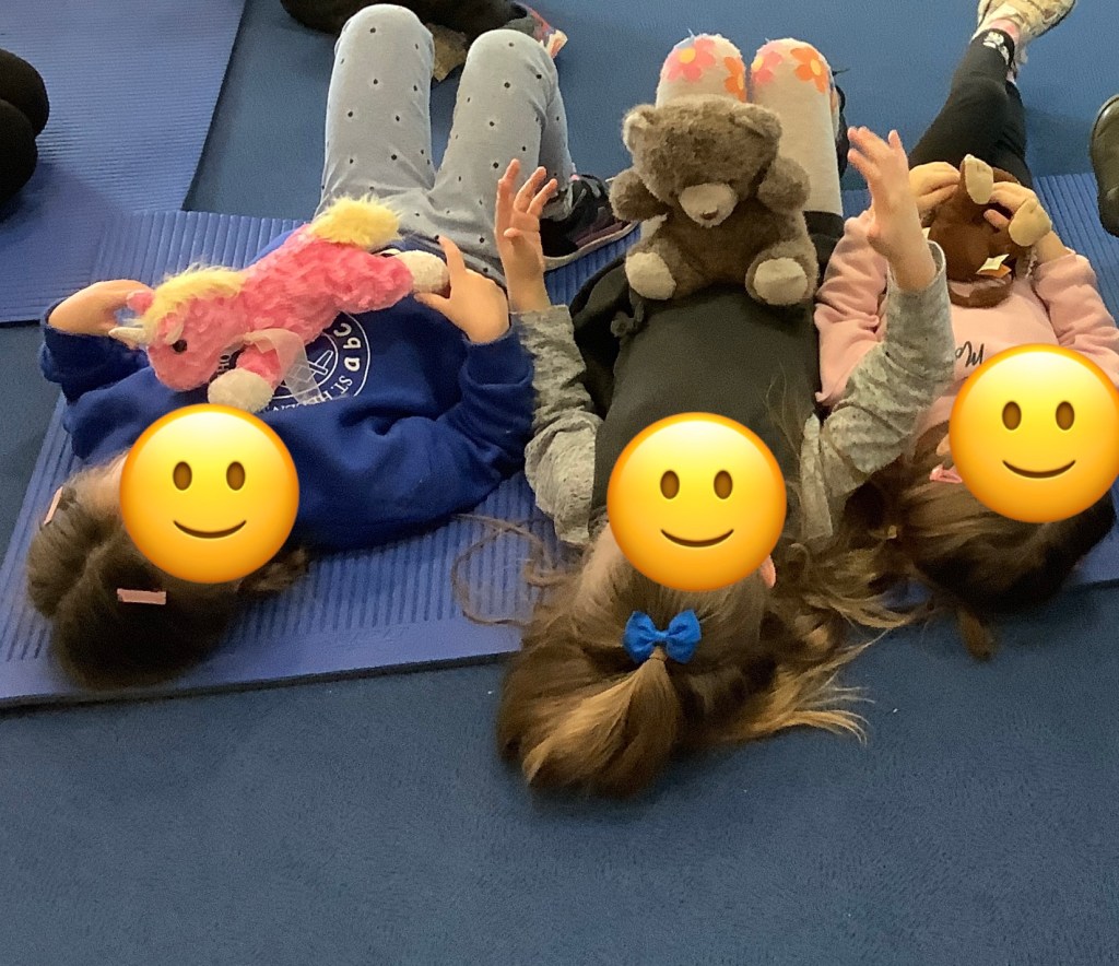 During one of our yoga sessions we practised breathing while feeling our tummies rising up and down. Then we placed teddy’s on our tummy’s and watched them rise up and down as we breathed in and out.