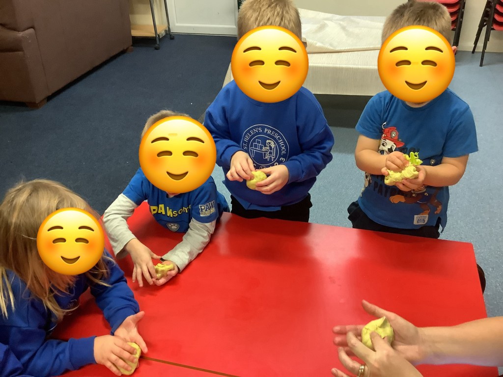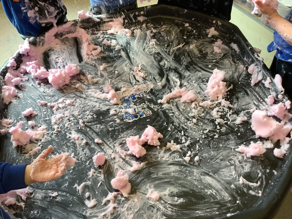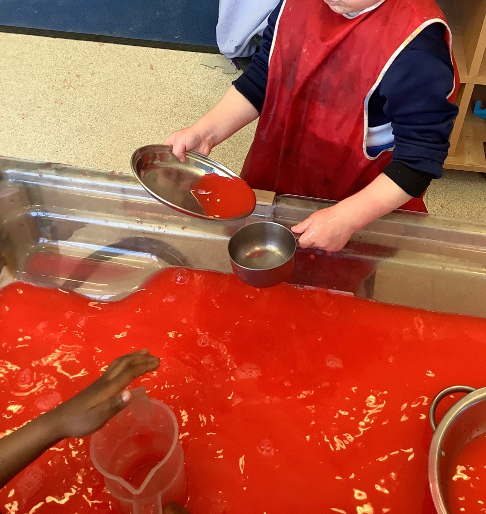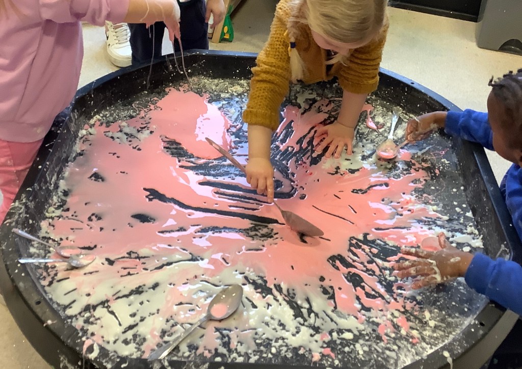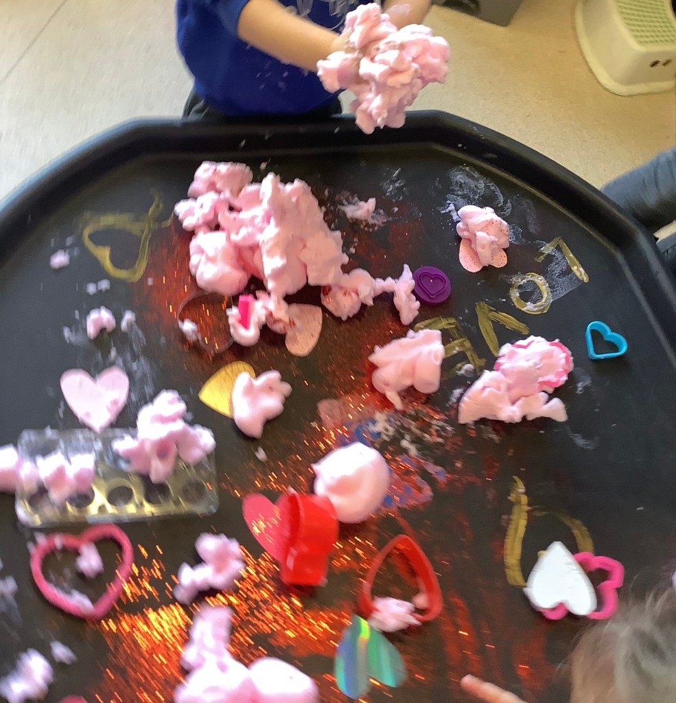 We do love our messy play here at St Helens, and this month we were not short of fun opportunities to get messy. Shaving foam, painting with sponges, heart shapes, our hands and fingers, more shaving foam, playdough (valentines themed) and a sensory fruity water tray using fruits we have on our pancakes.