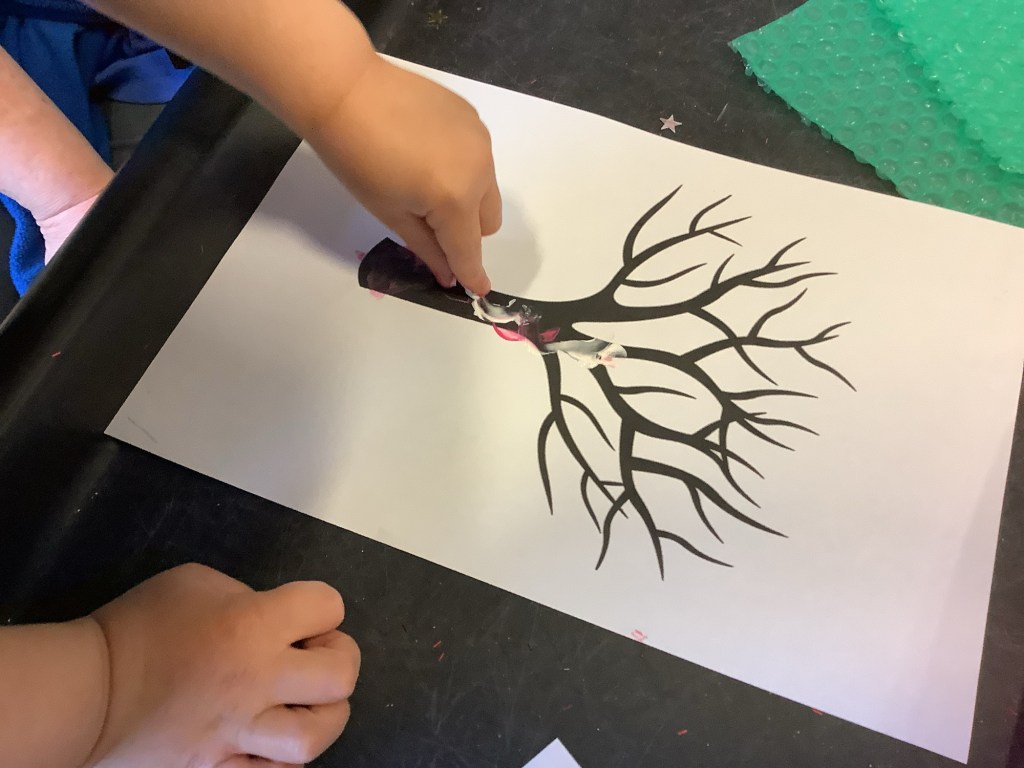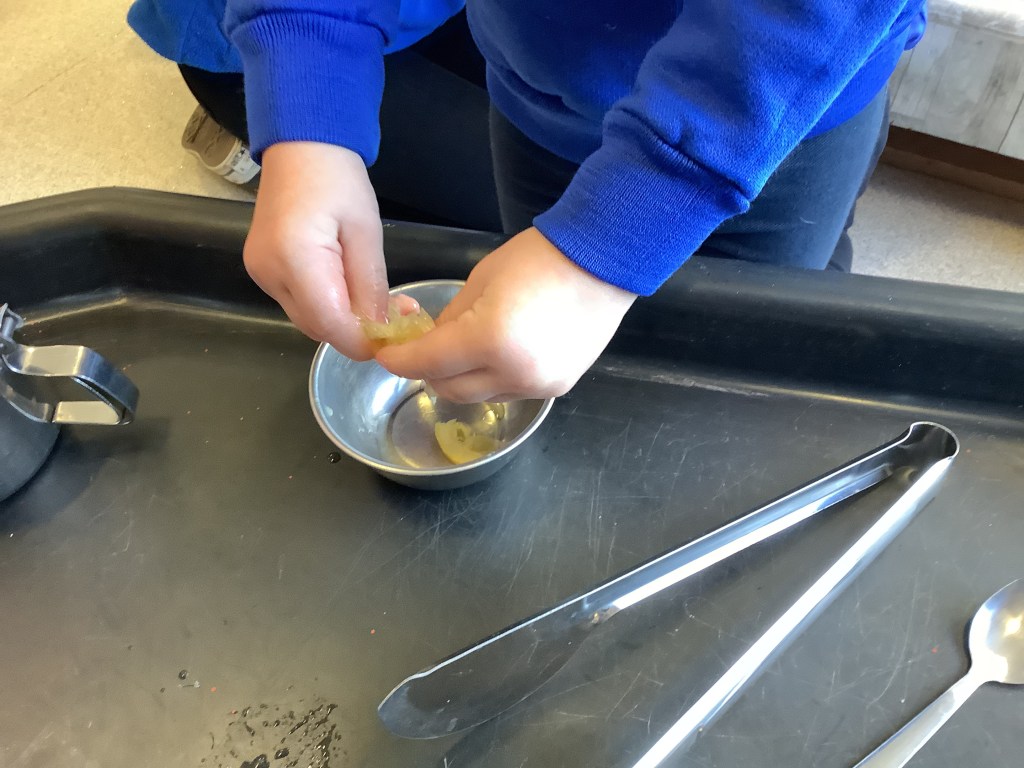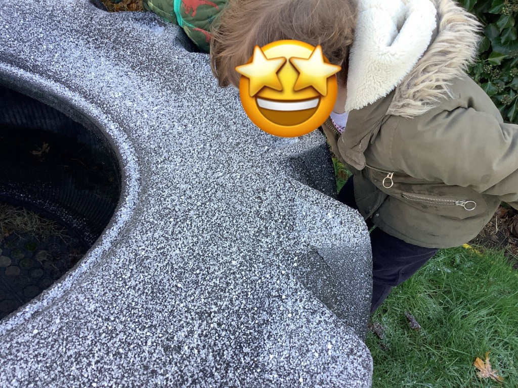 The weather has been super cold, but as you know we love all weathers, so we wrapped up warm and headed out to explore the wintery scene. The frost made our garden look magical and sparkly, especially spiderwebs. The children noticed when breathing out they could see their breath, some of them called it “dragon breath.” We had great fun breaking up the ice, watching it melt in the sun and inspecting the bubbles and patterns inside. We took some ice inside to carry on our learning adding different tools, paint and glitter.