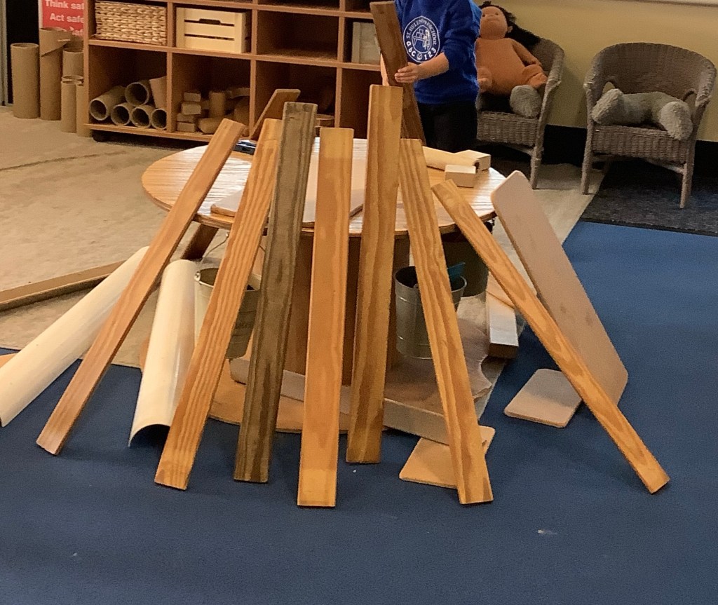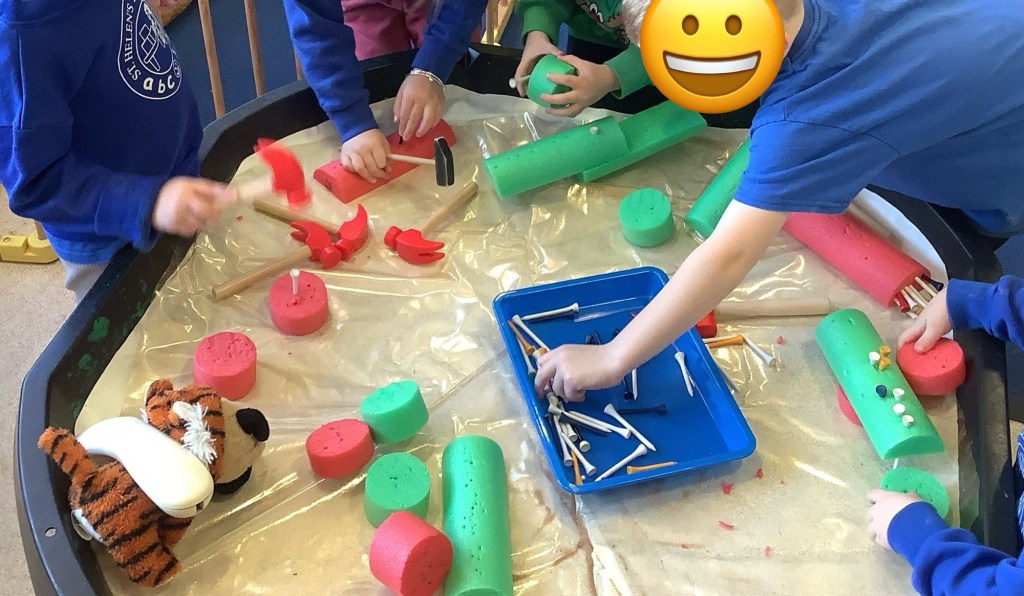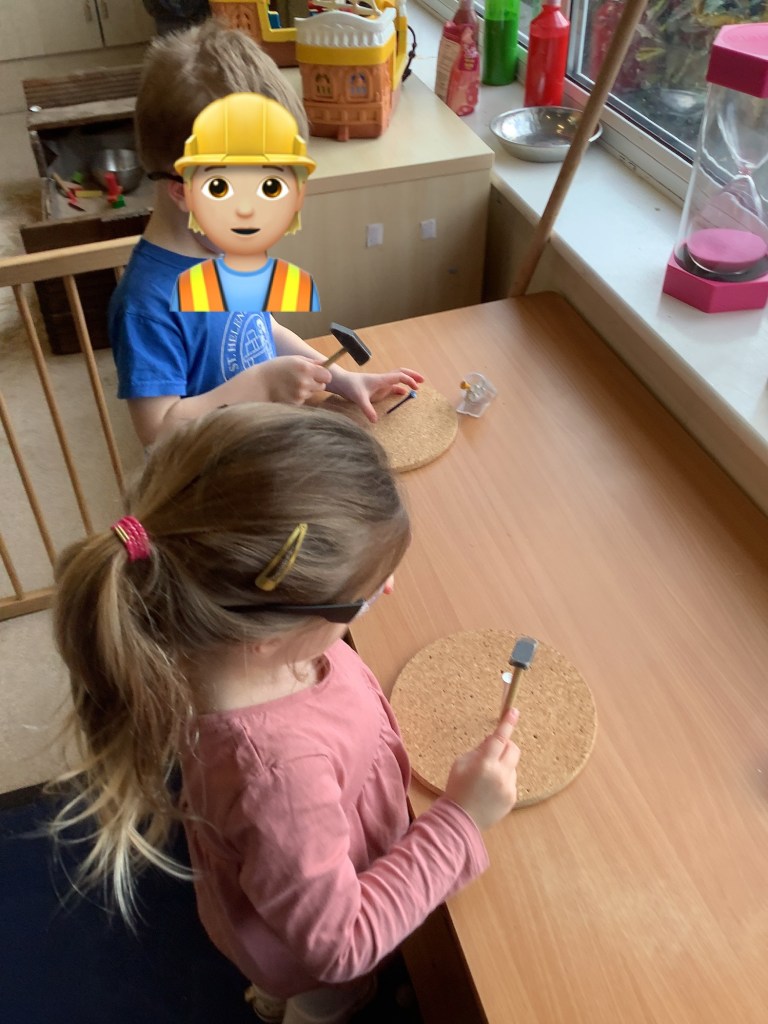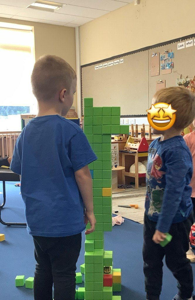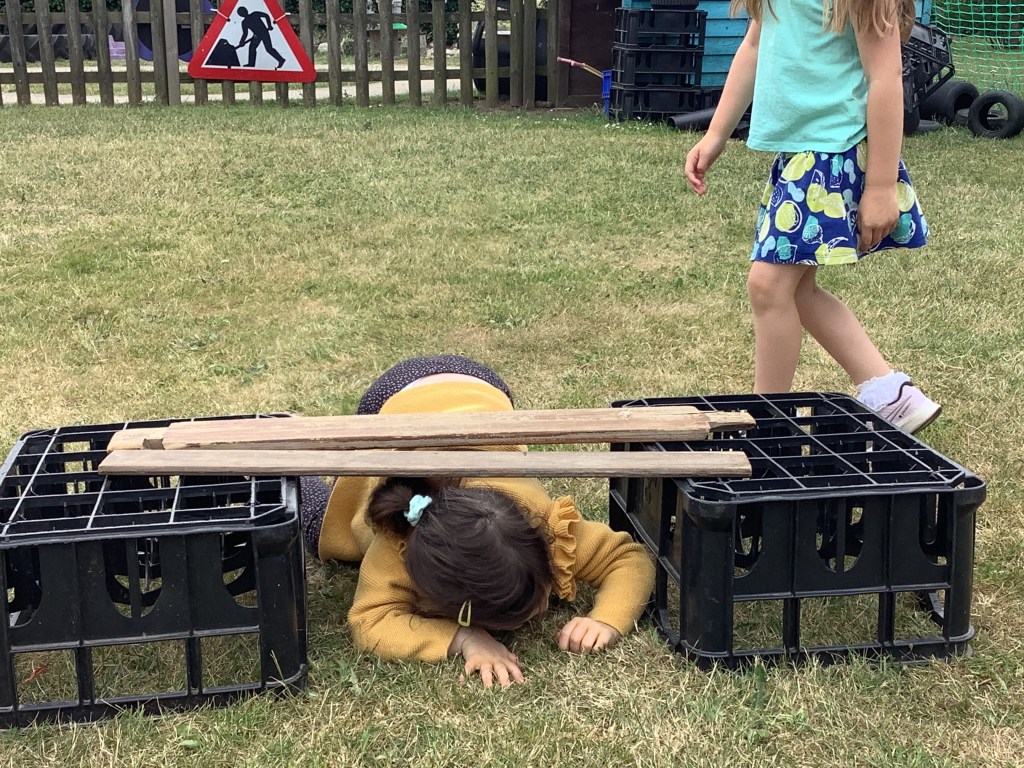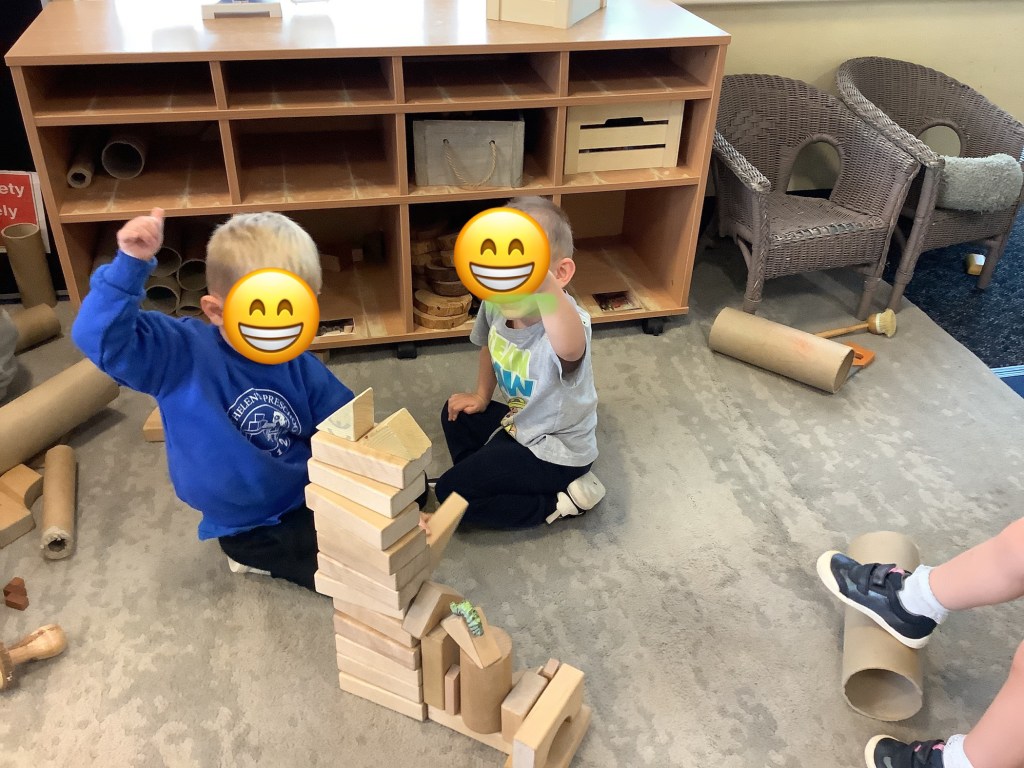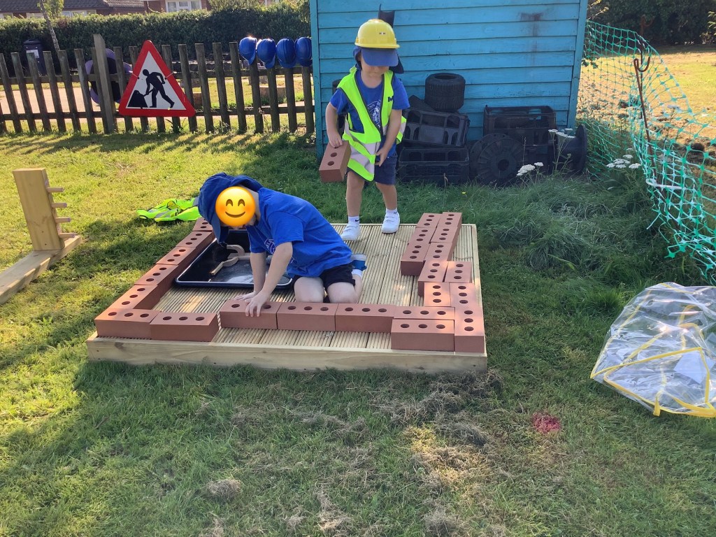 The children are really enjoying building of any kind at the moment. We’ve set up lots of activities, giving them the opportunity to use their critical thinking in building using different resources. Large cardboard boxes in the garden, woodwork, building blocks using house templates, and tools and bricks.