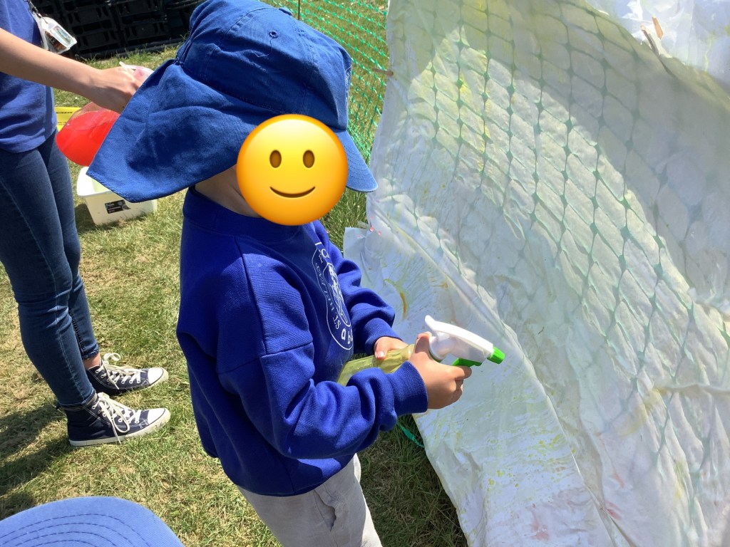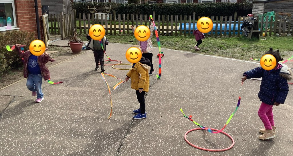 We took advantage of the bad weather with some indoor physical activities. We got out the parachute and the children learned how to listen and follow instructions, making the parachute loud, quiet and listening when to start and stop. Windy weather saw us in the garden with ribbons, making circles and waves. We loved holding them up to see which way the wind was blowing.