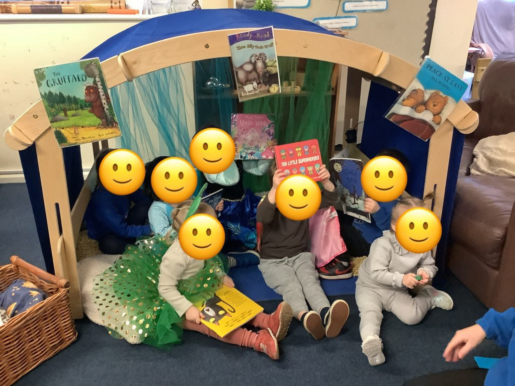 We begun our World Book day celebrations early, to ensure all children have a chance to join in the festivities. We set up a cosy corner in the lunch room to share stories the children have brought from home and some story sacks.