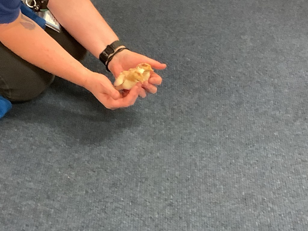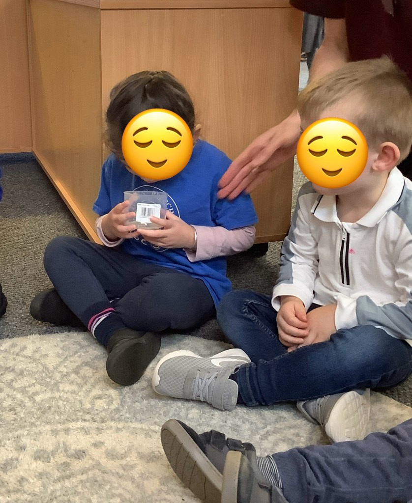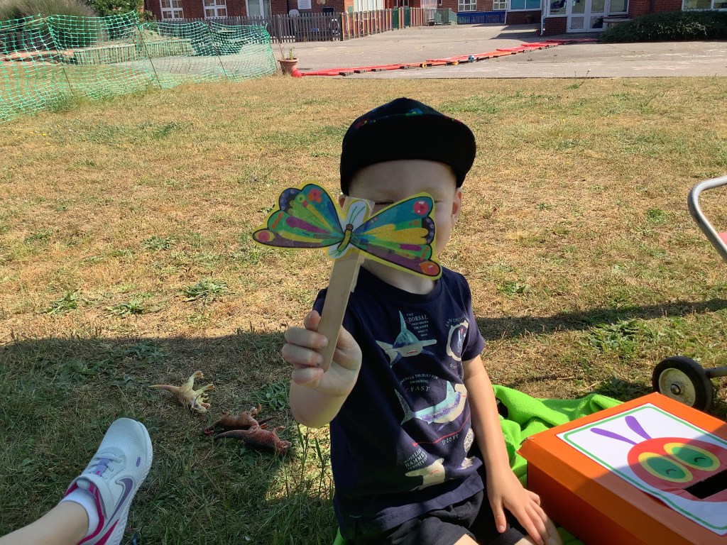 The children have loved watching the birds in the garden, we made some bird feeders to attract more for us to watch from the windows. We even had a surprise visit from 4 fluffy, yellow chicks. The children took turns to hold them and did really well at listening to our instructions to be very quiet and careful so not to scare them. We’ve been on lots of bug hunts, using magnifying glasses to spot the bugs hiding under our logs.