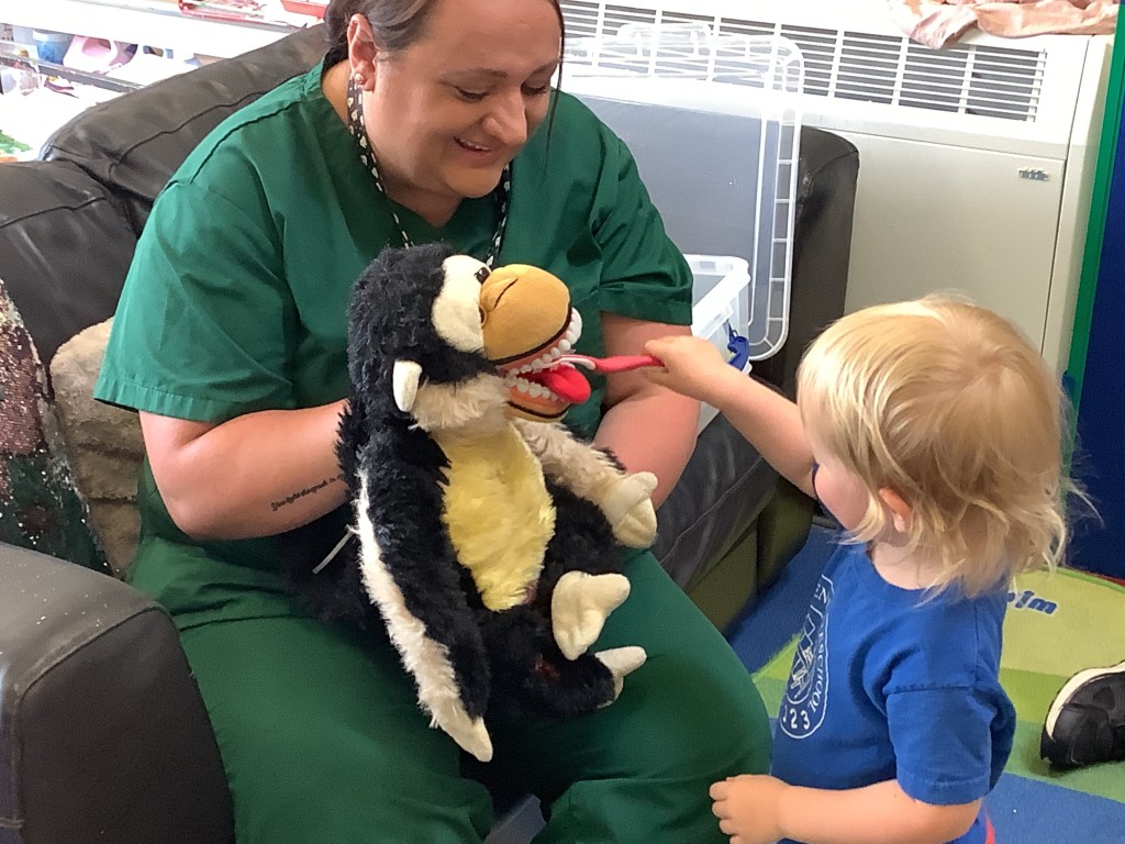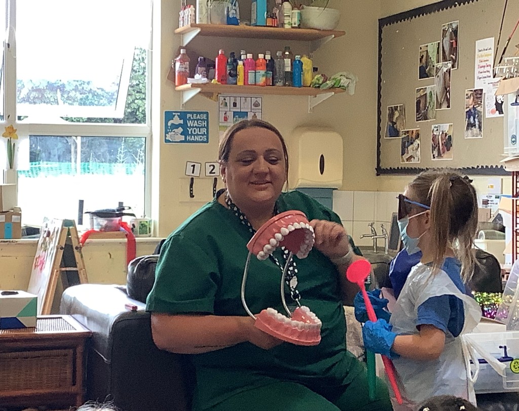 We also had a visit from a dentist, we got to try on some dentist equipment, gloves, apron and glasses, and brush the teeth of the cheeky monkey puppet. We listened very carefully to how we can keep our teeth clean and healthy, the dentist said we were very clever for answering all the oral health questions correctly.