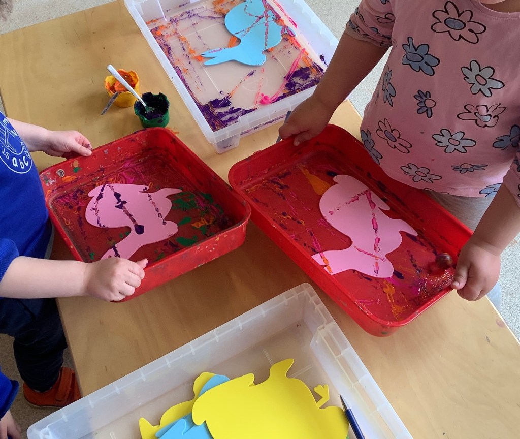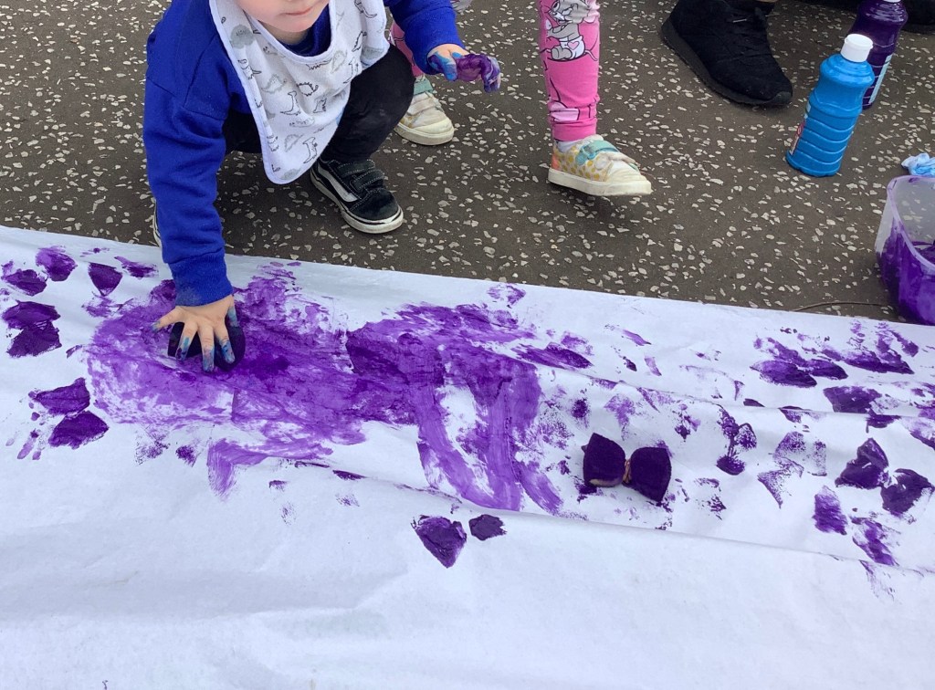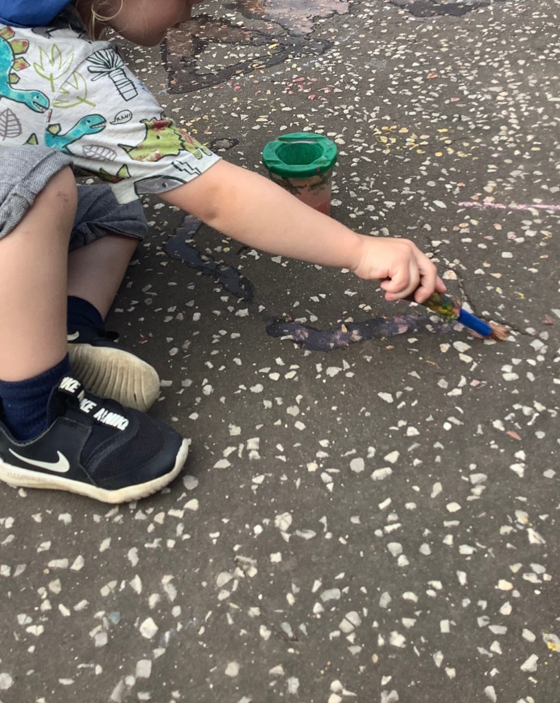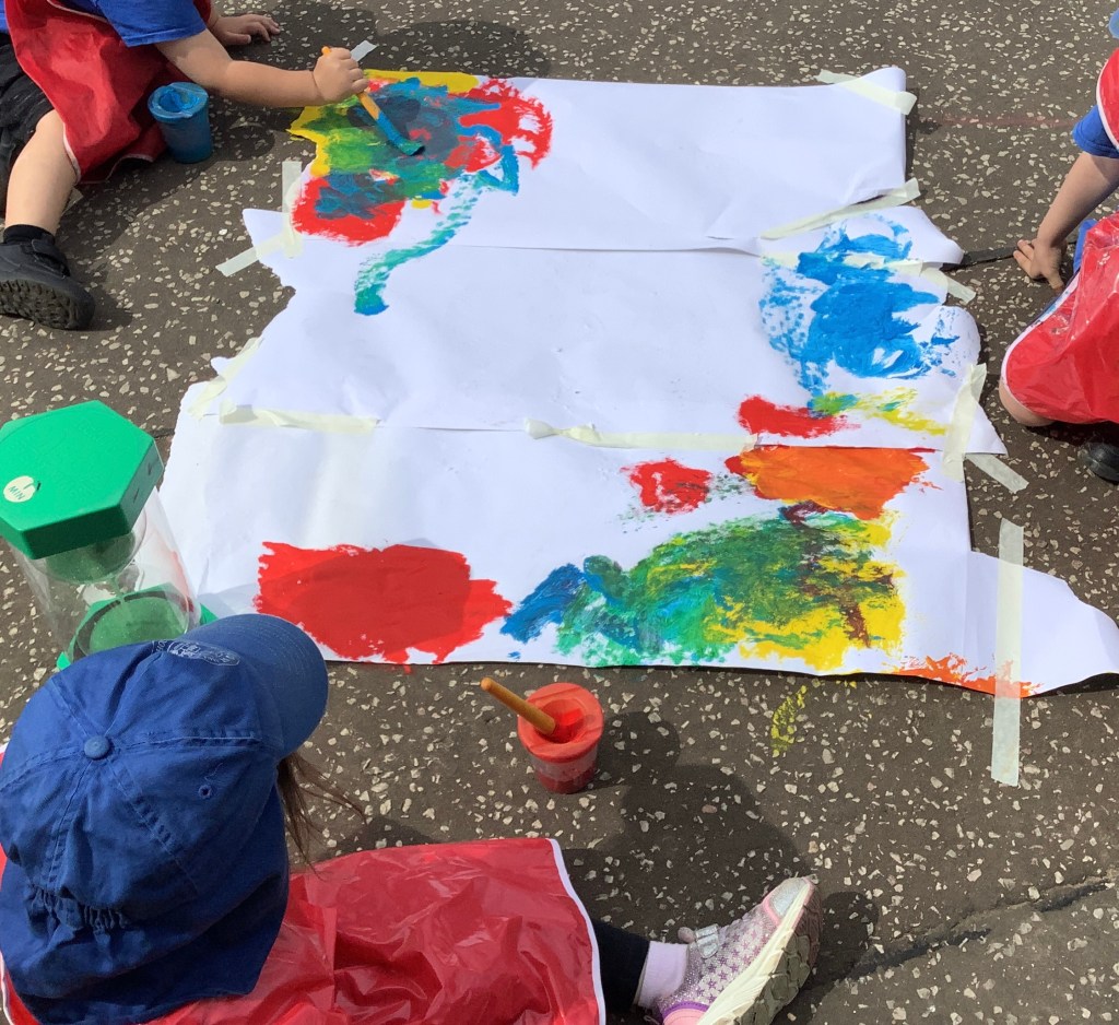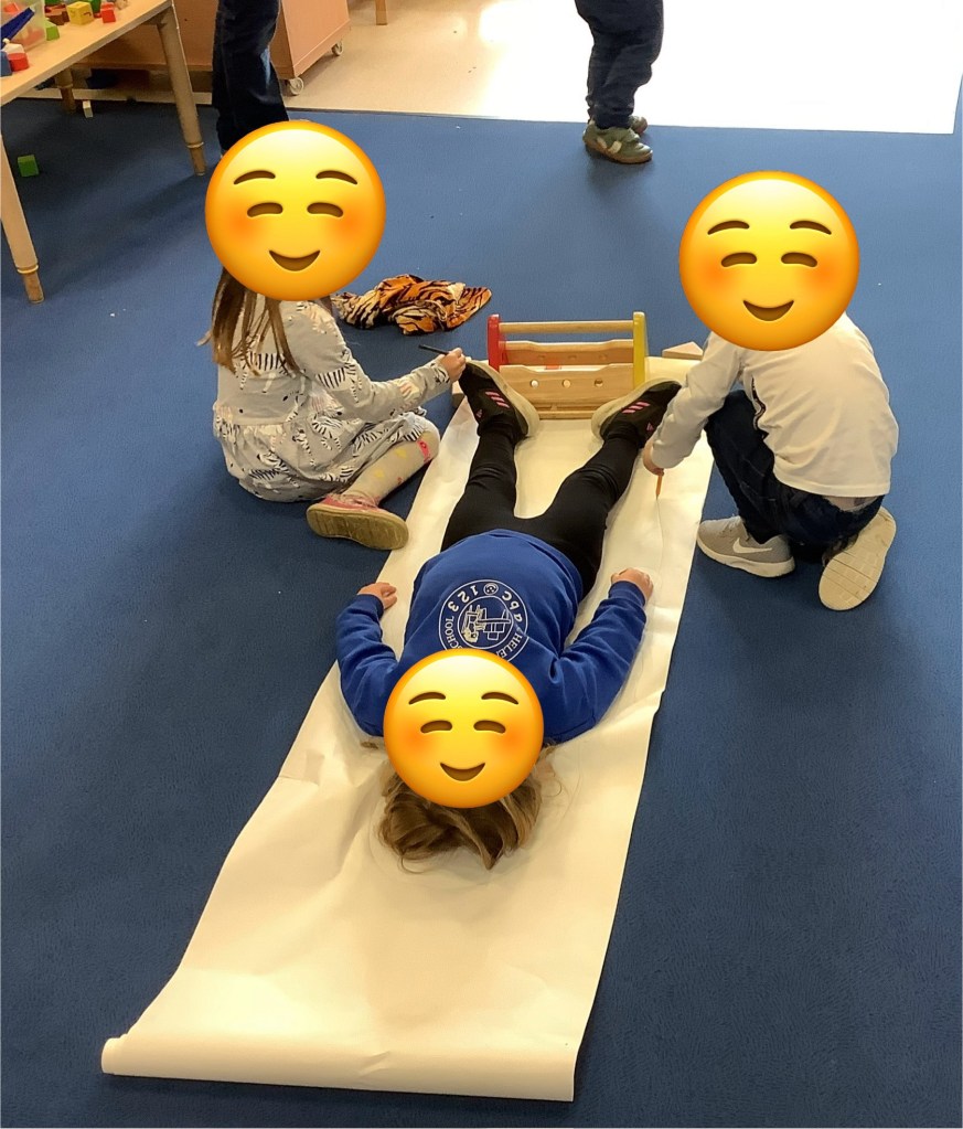 Alongside this we’ve been spending lots of time in the garden with various activities. On a particularly sunny day we enjoyed snack outside with a story and then some yoga. The children relished in the opportunity for some outdoor water play, while the preschool “babies” had a lovely bubbly bath!! The children have shown a keen interest in floor painting, experimenting with shadows and drawing around our bodies while laying on the ground.