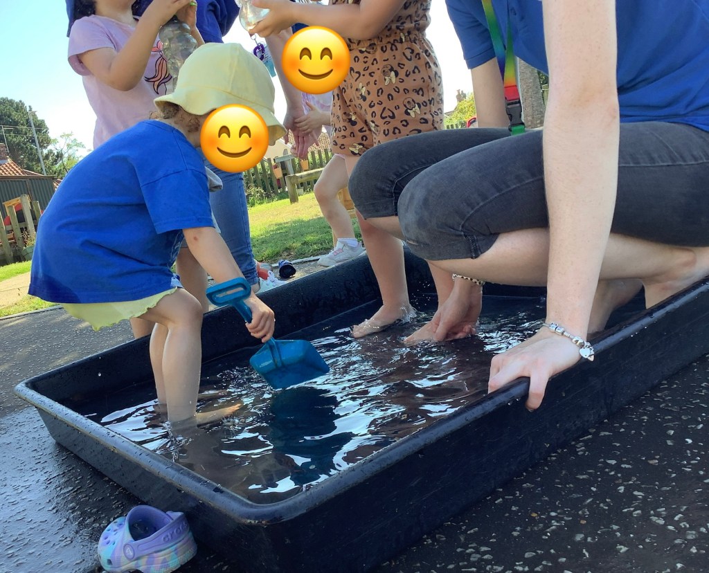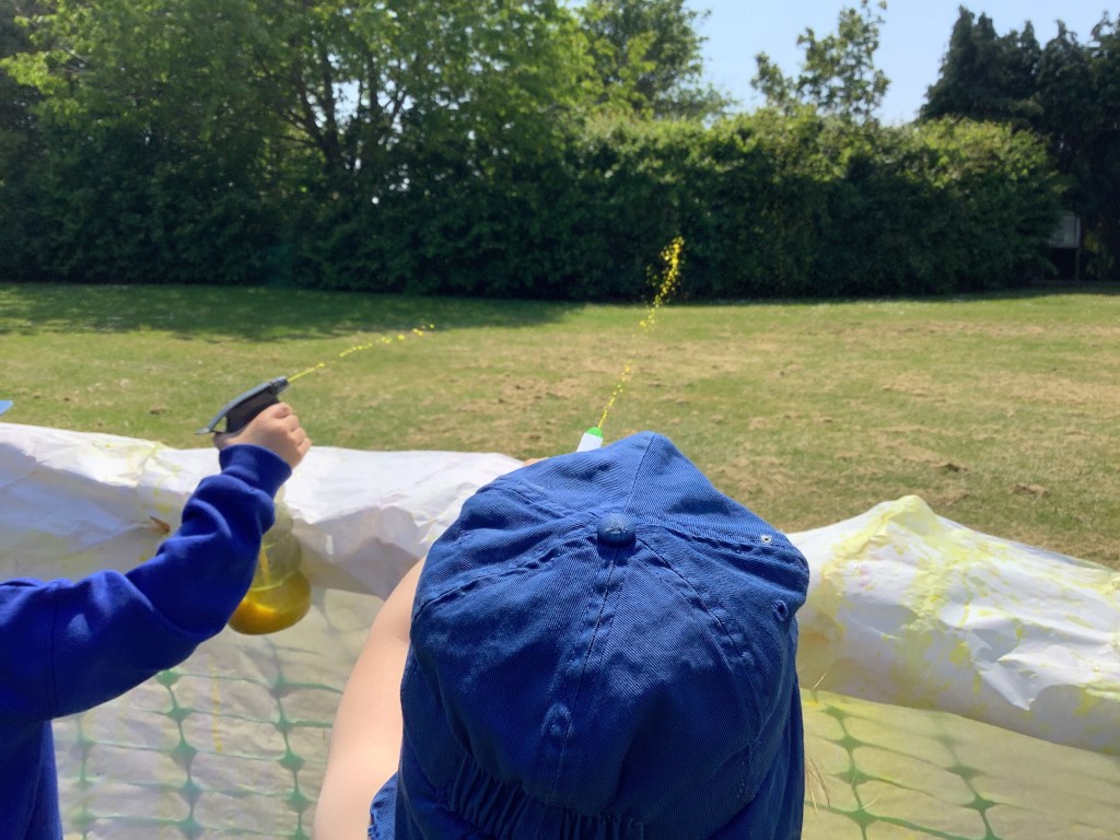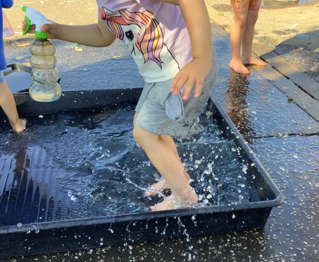As usual schools are back and the sun decides to come out to play…!! What a great opportunity for some water play!! With spray bottles and a tuff tray filled with water for paddling, tipping and pouring we were soon cooled off and enjoying being outside in the fresh air.