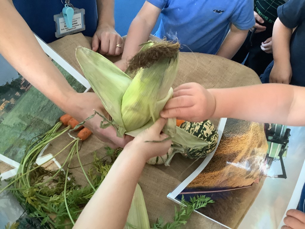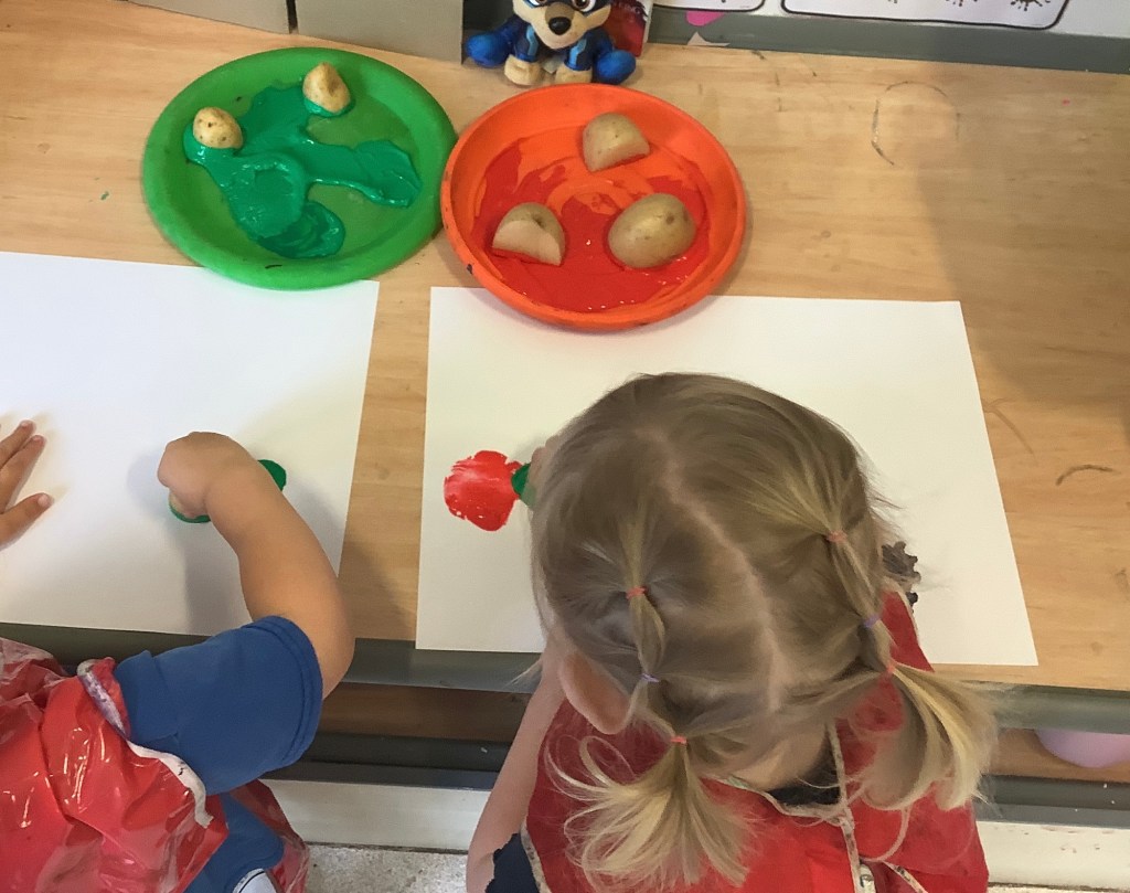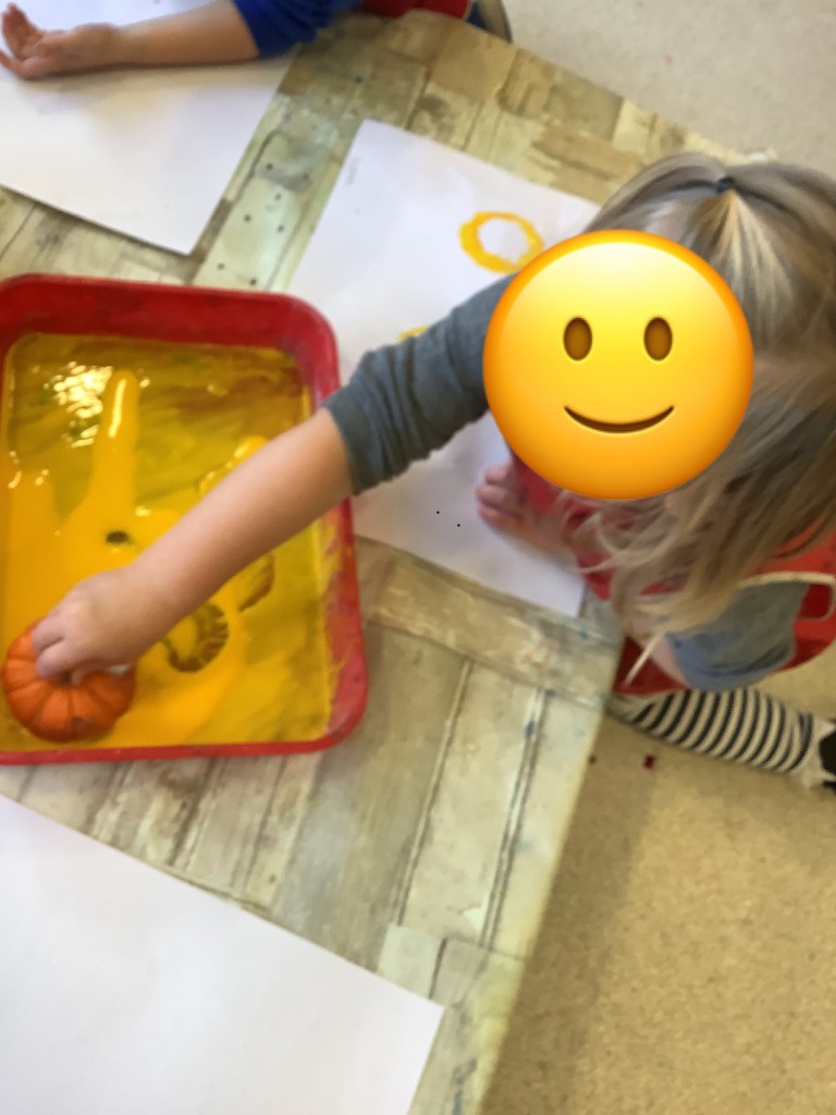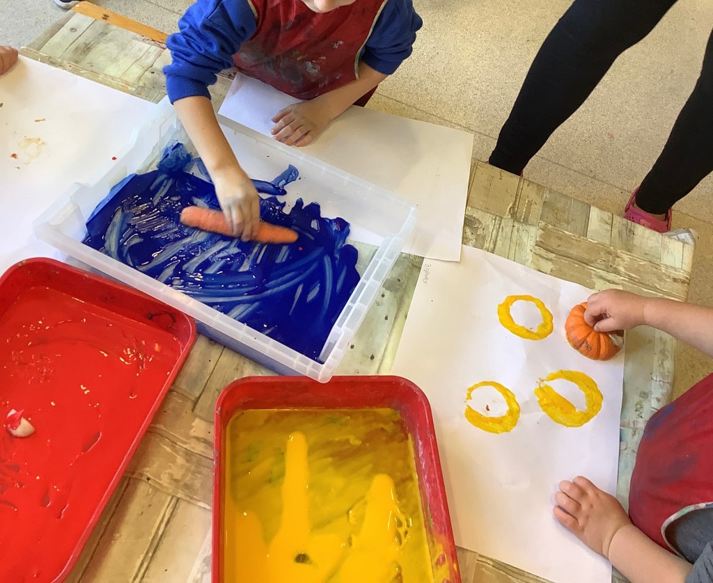 Towards the end of the month we welcomed harvest into some of our activities. We have been using vegetables for paint printing and had a look at some real vegetables set out in the tuff tray. First we watched a video explaining harvest, then we got to touch and smell some of the vegetables. Next month we will be tasting some during snack time.