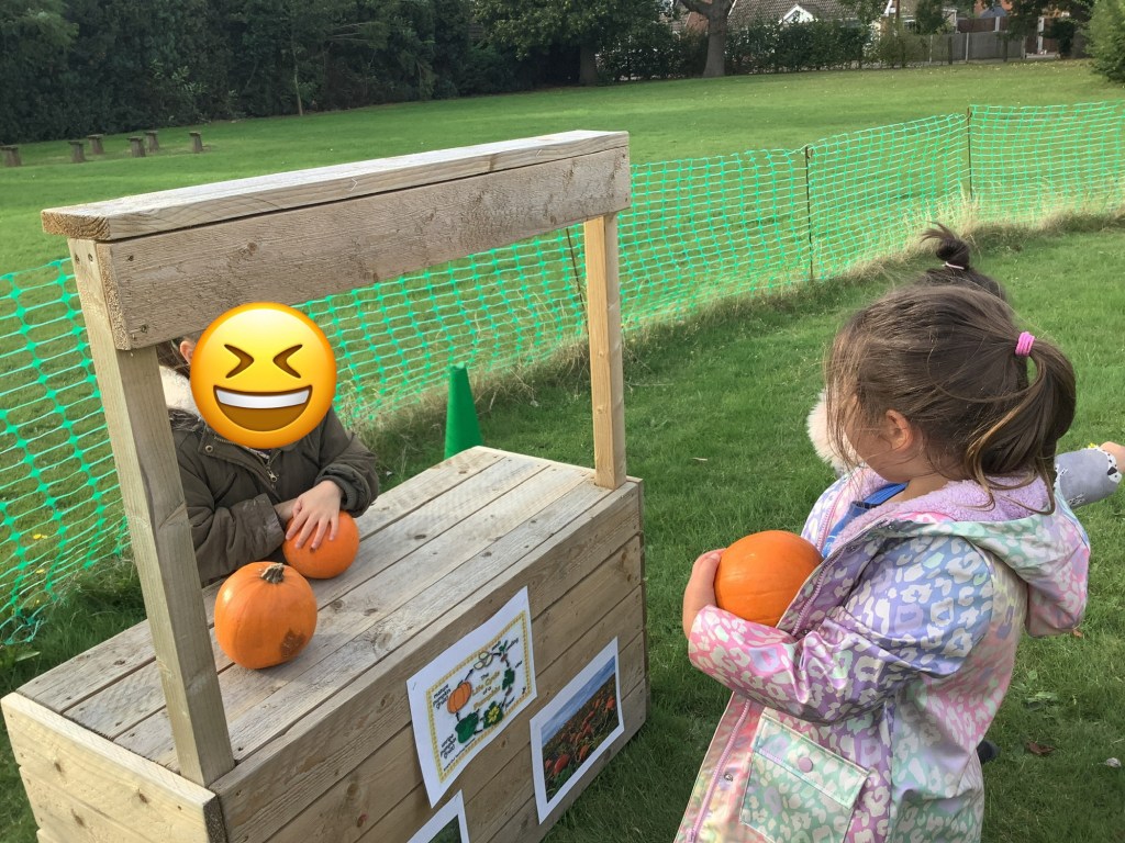 We embraced Halloween with so many learning opportunities. We created our own pumpkin patch in the garden used the wheelbarrows to collect them and our lovely wooden serving hatch was the shop to buy them from.