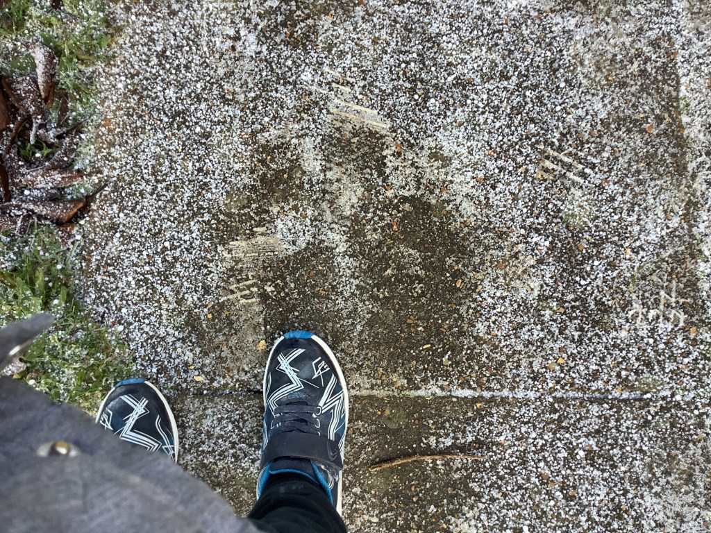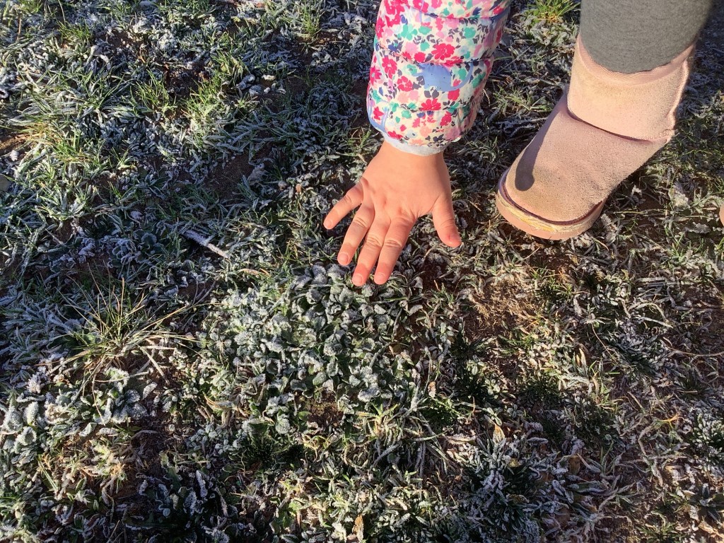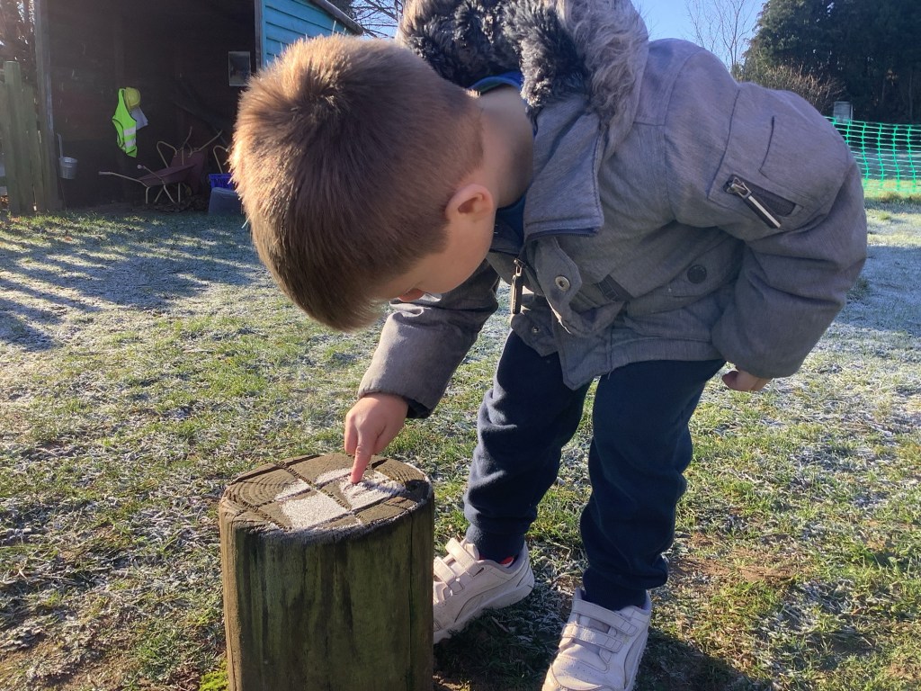 We explored a frosty morning in the garden, looking at frozen cobwebs and making marks in the frost on the ground.