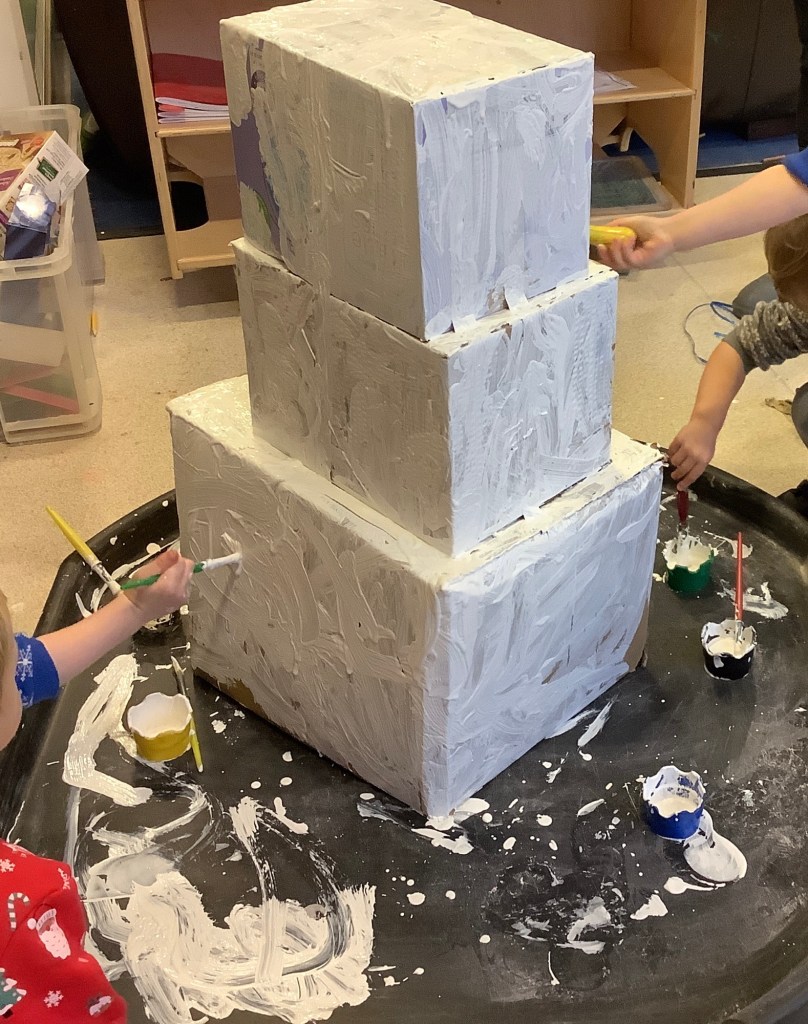 Some of our activities this month included…. building and following patterns using bricks, present wrapping, painting and decorating a Christmas tree and snow man made from boxes, a snowball game, woodwork, Christmas themed playdough, we made three little pig houses, and much much more!!!