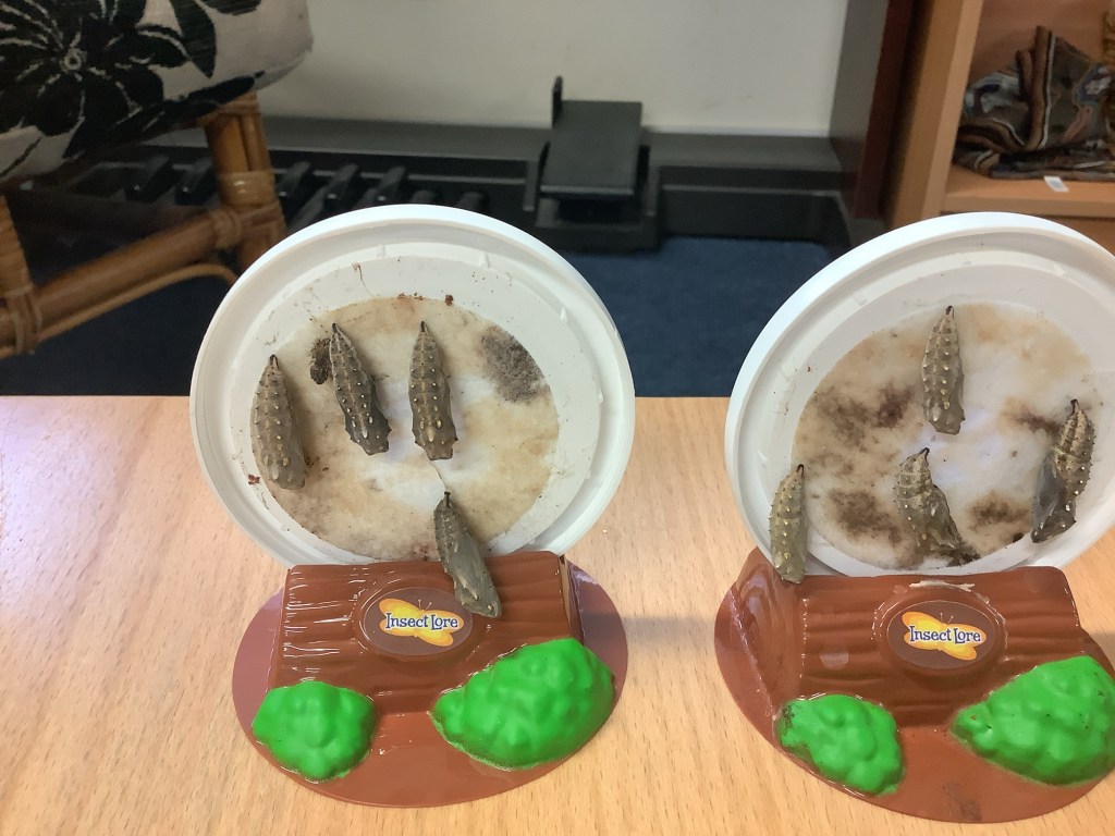 Have you seen our caterpillars? We’ve watched them grow and now they are in their cocoons waiting to emerge as beautiful butterflies. When they do we will release them into the garden.