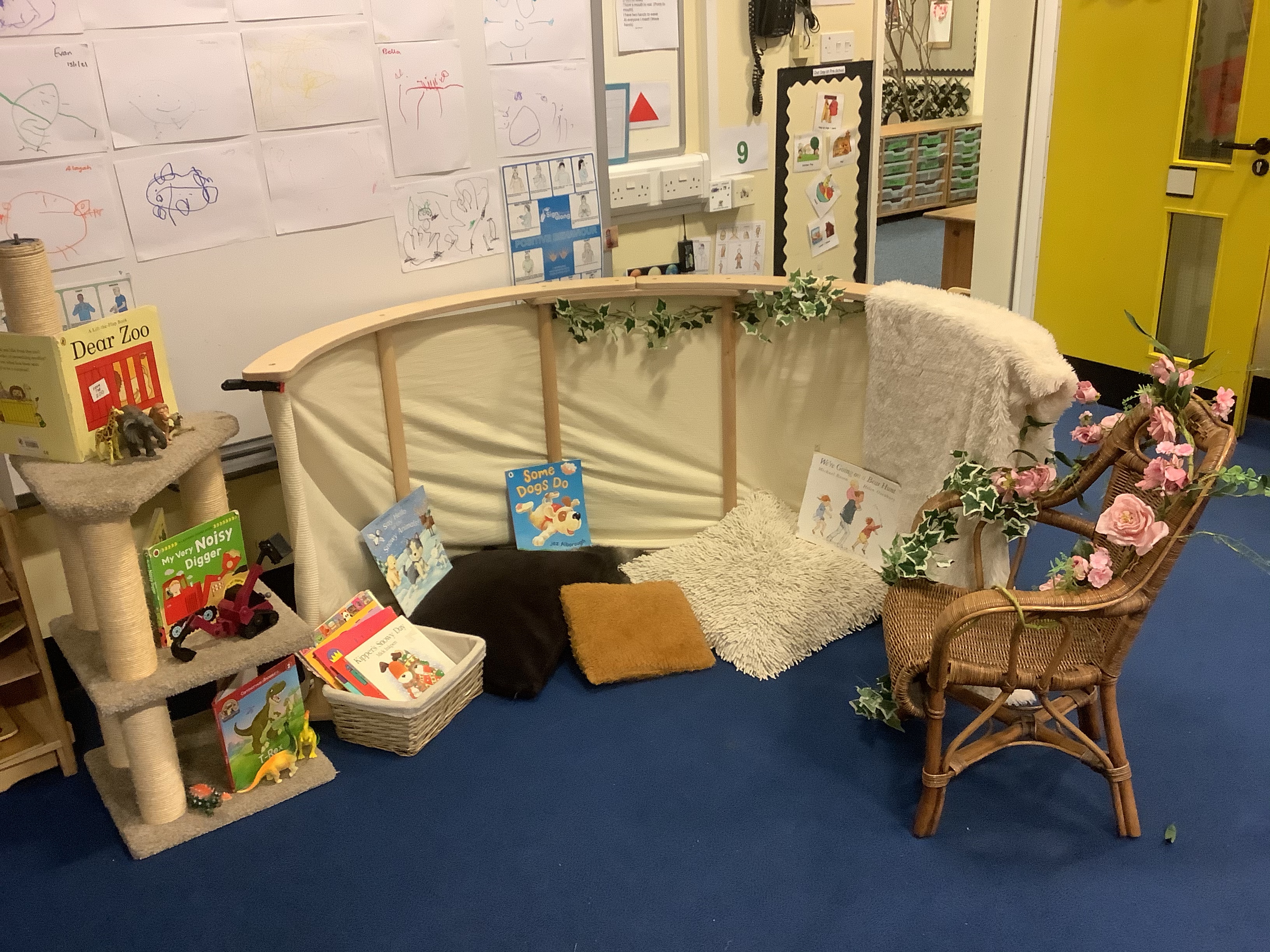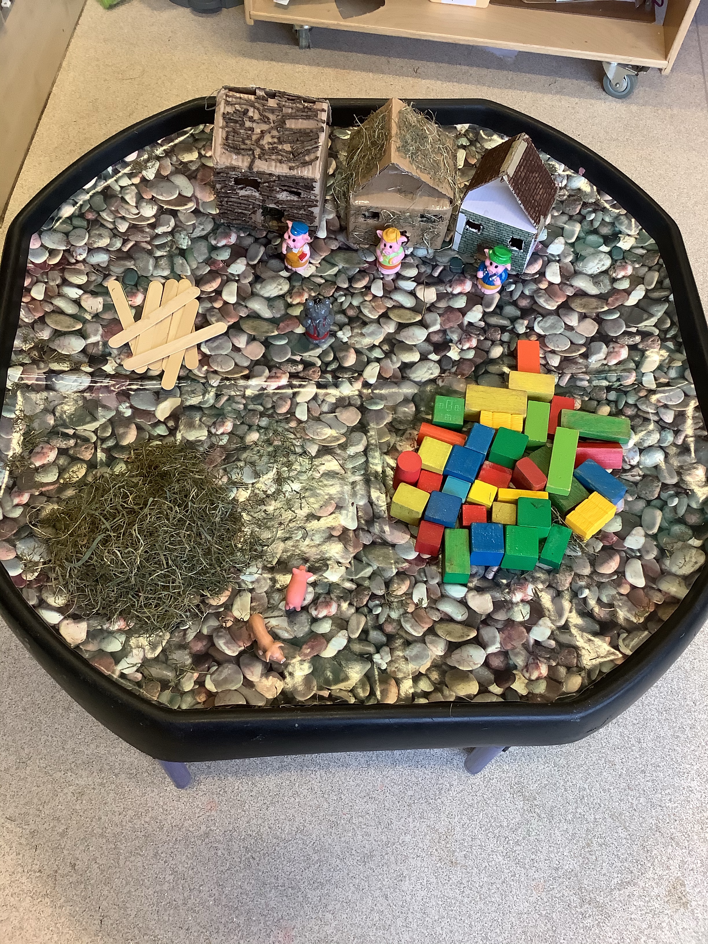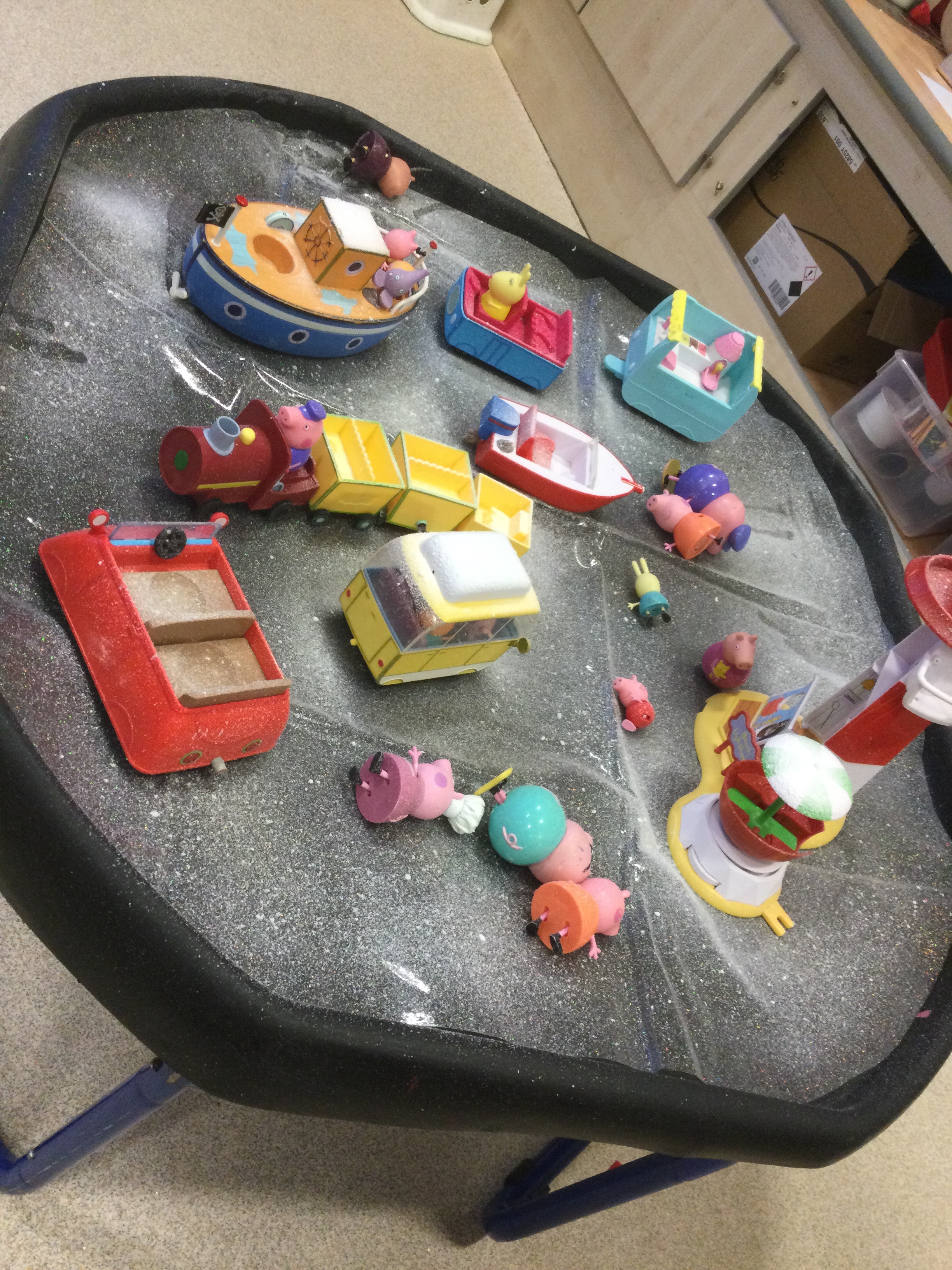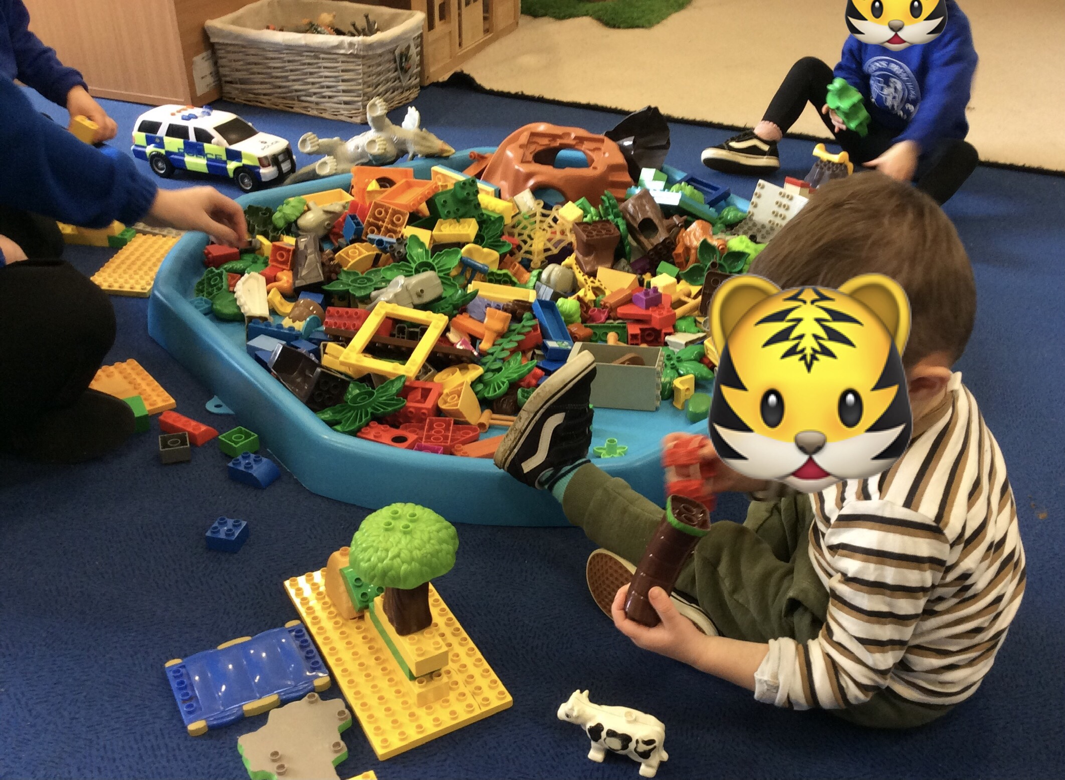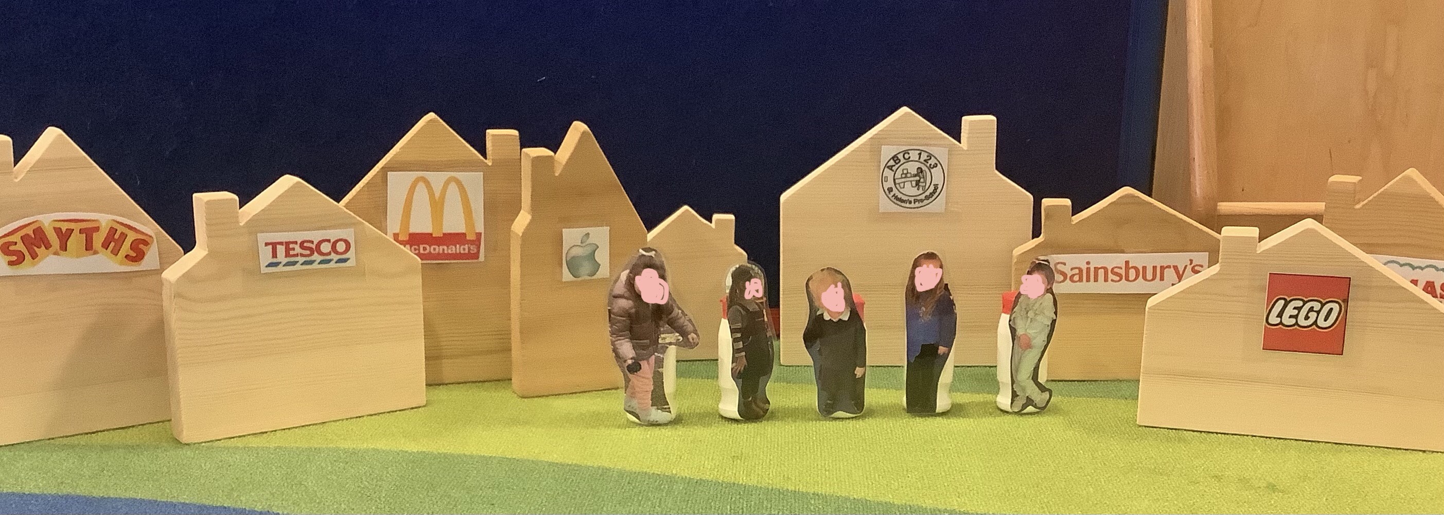 Orange room created a mini village, with real mini characters, allowing the children to role play going to each other’s homes and shops, to create a sense of belonging. Something which they have commented on during the pandemic. This also encouraged the children to recognise logos of familiar places.