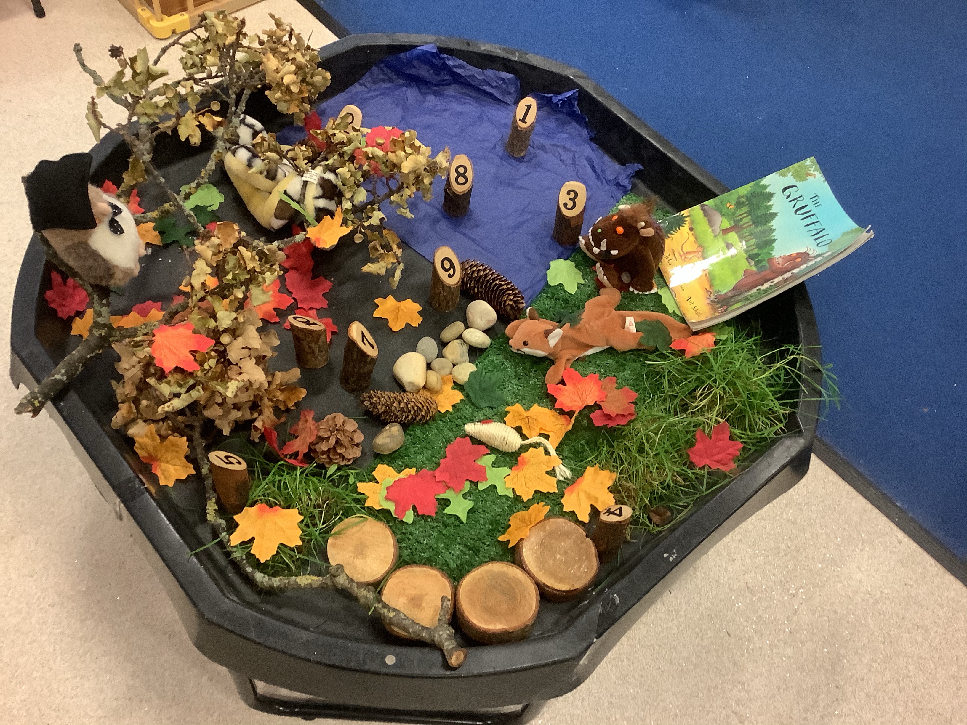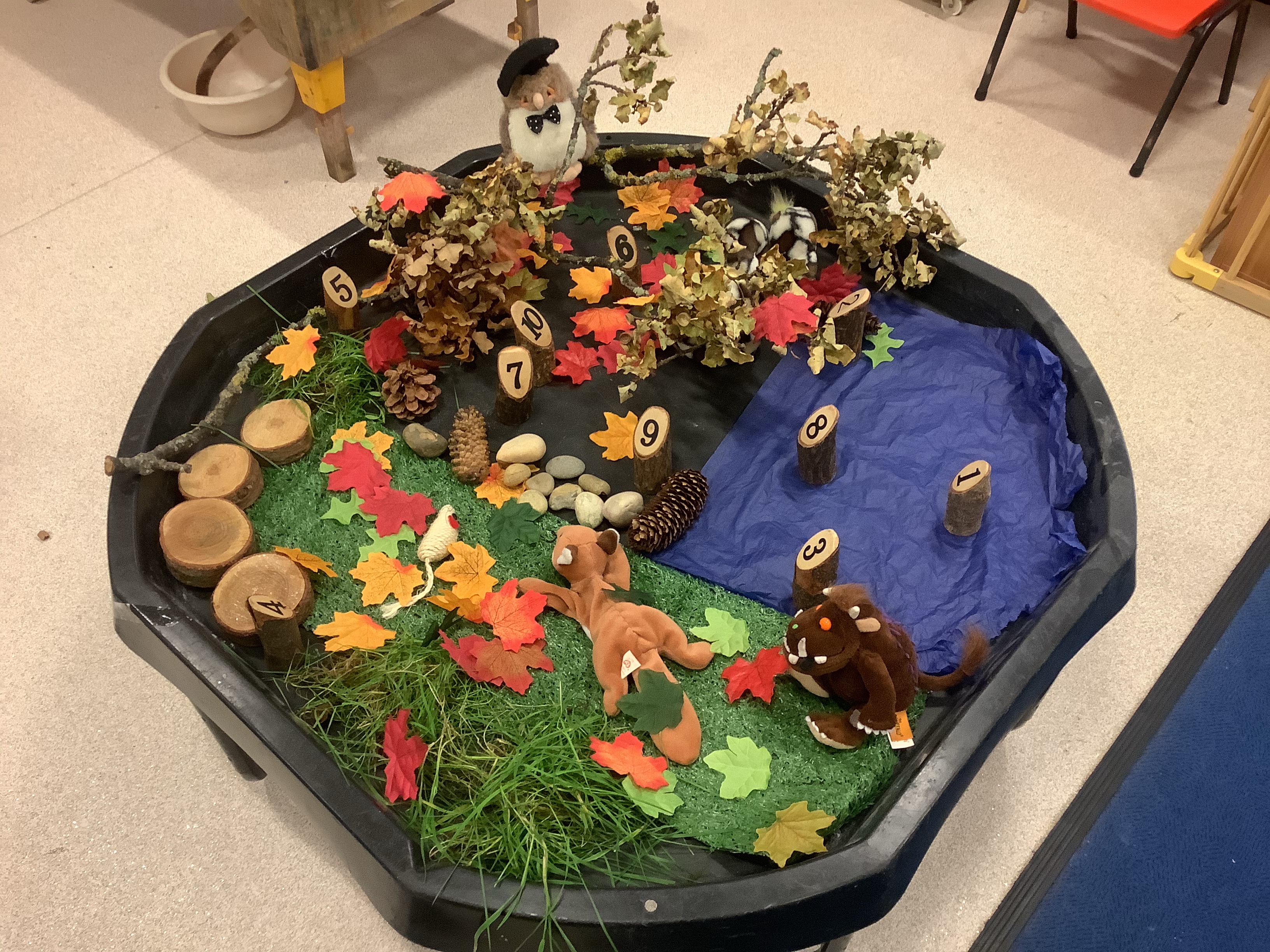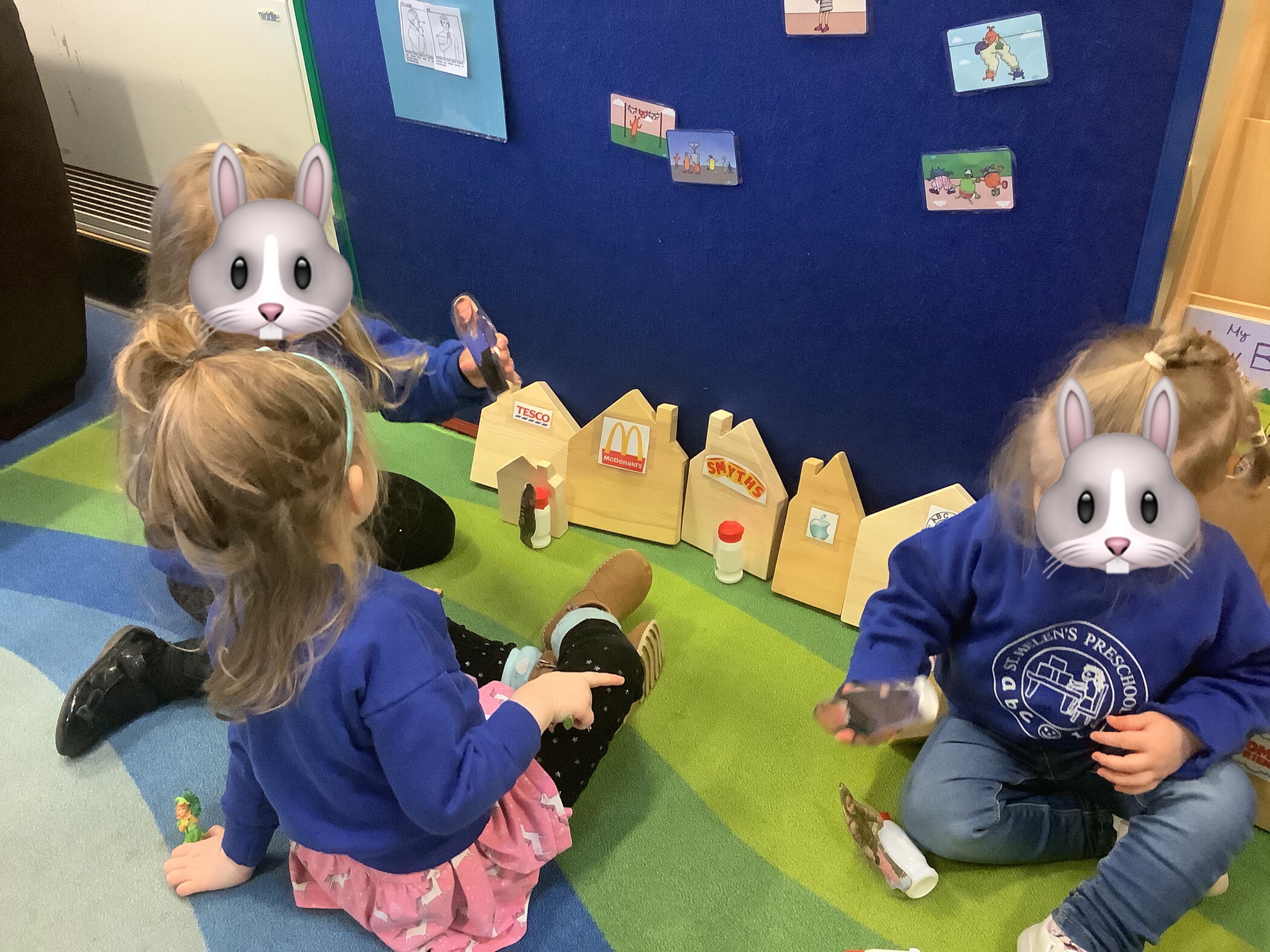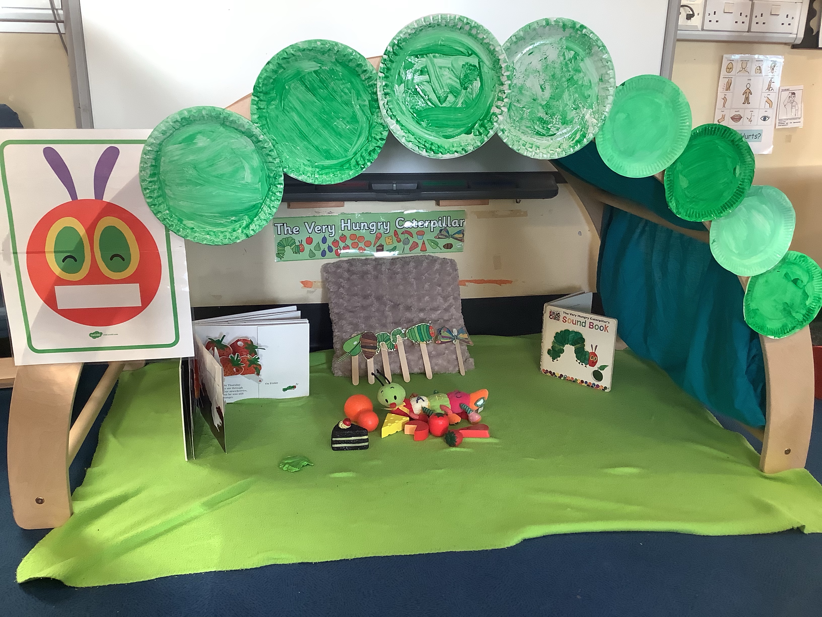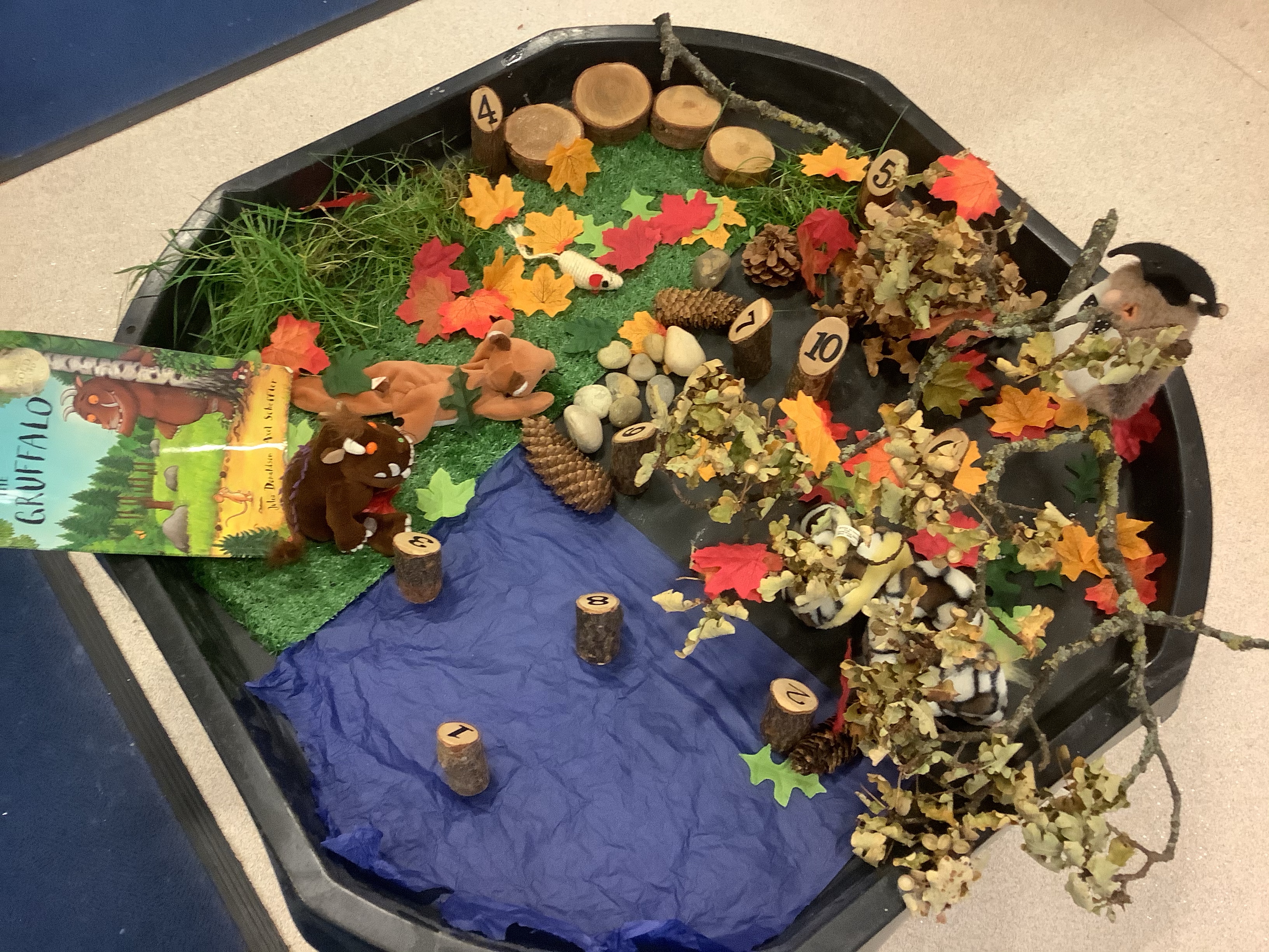 Orange room created a mini village, with real mini characters, allowing the children to role play going to each other’s homes and shops, to create a sense of belonging. Something which they have commented on during the pandemic. This also encouraged the children to recognise logos of familiar places.