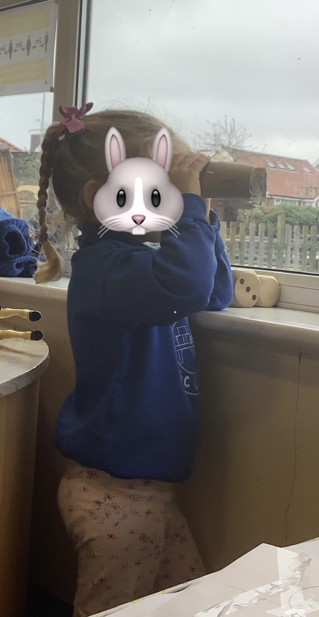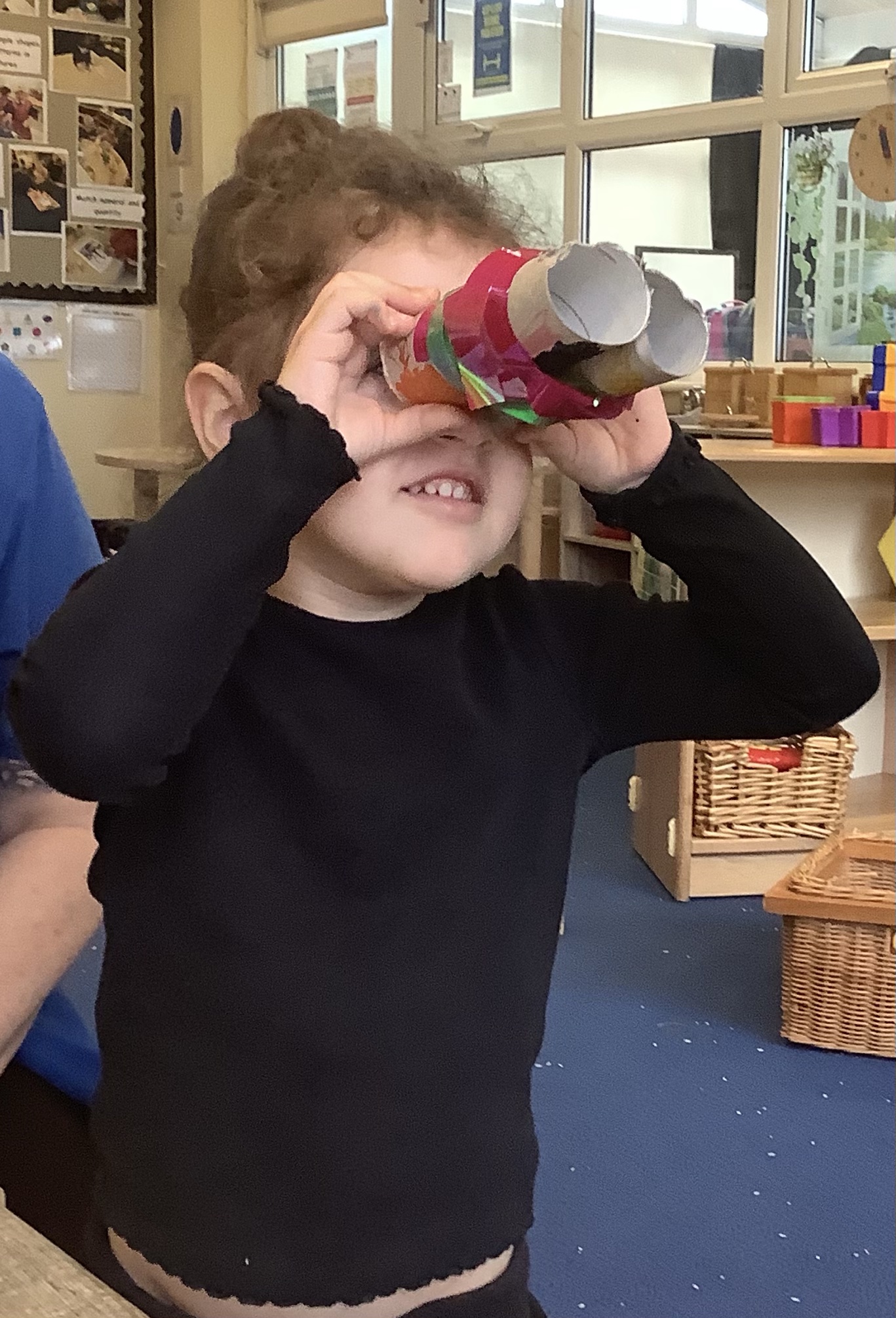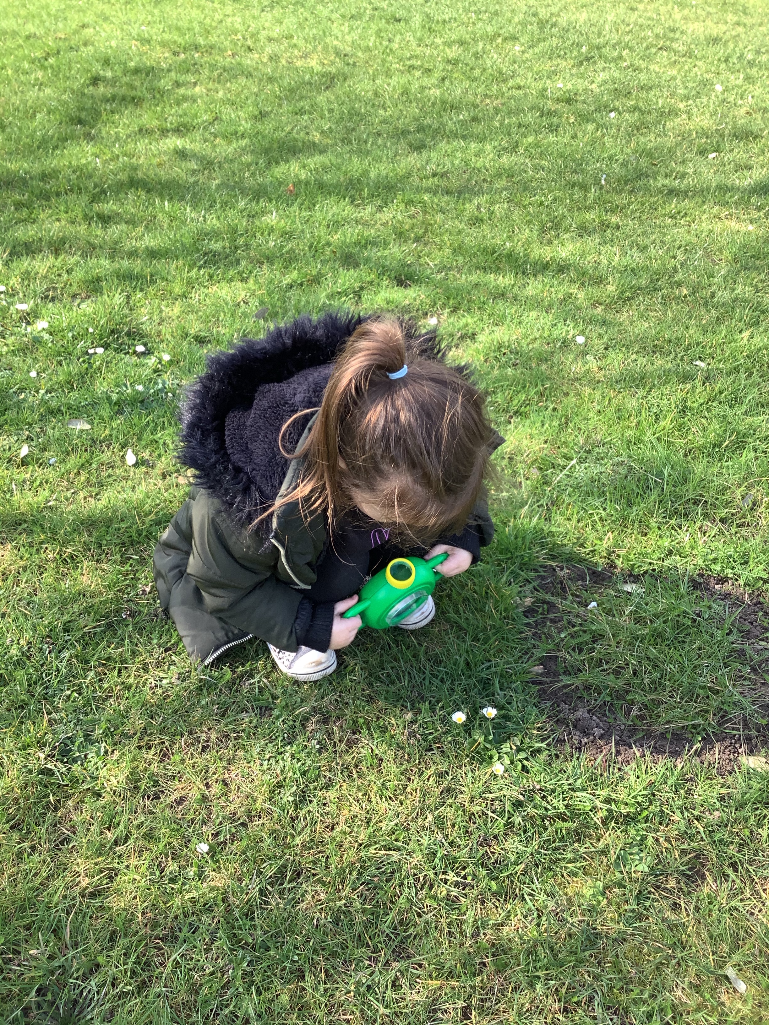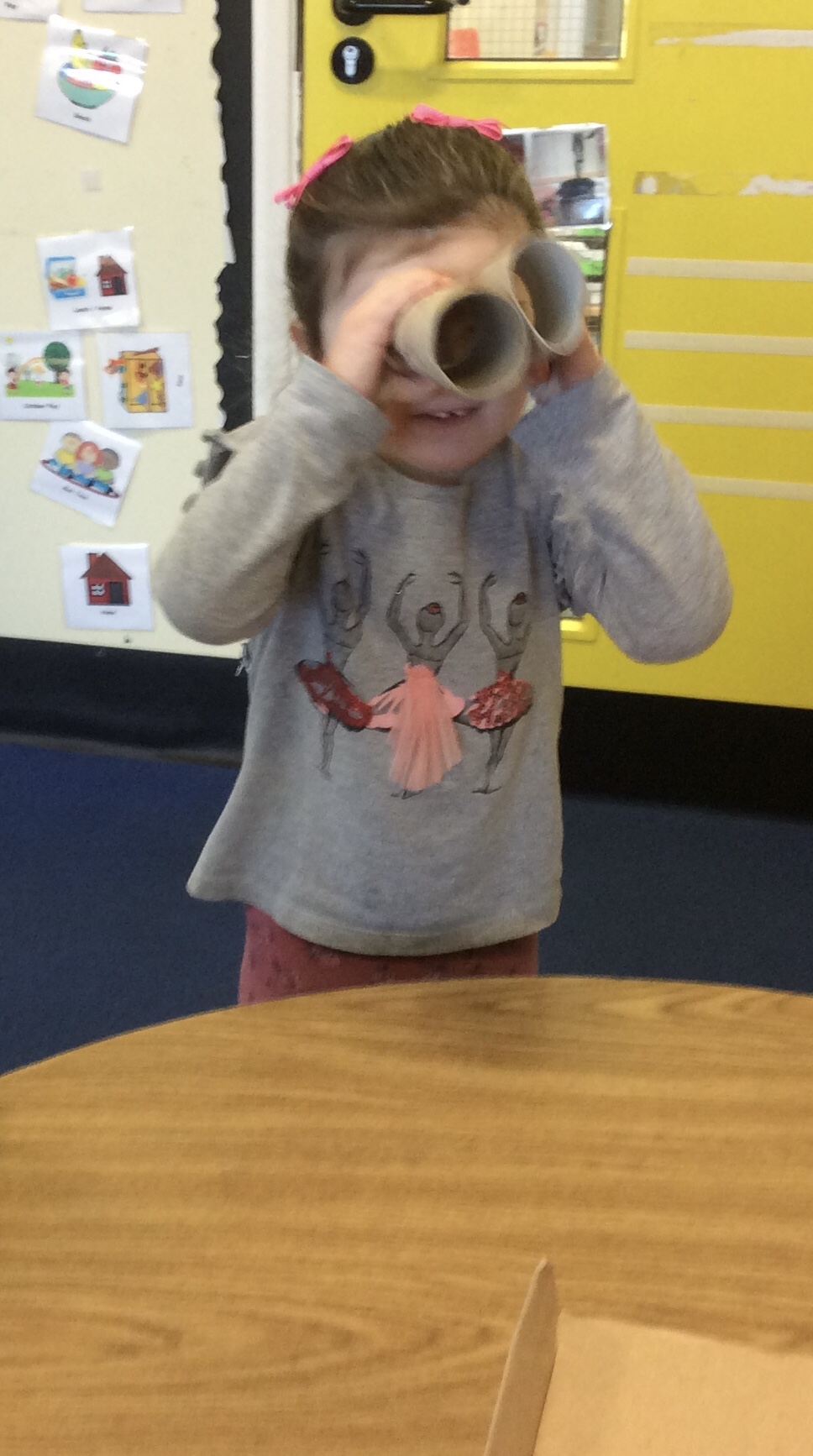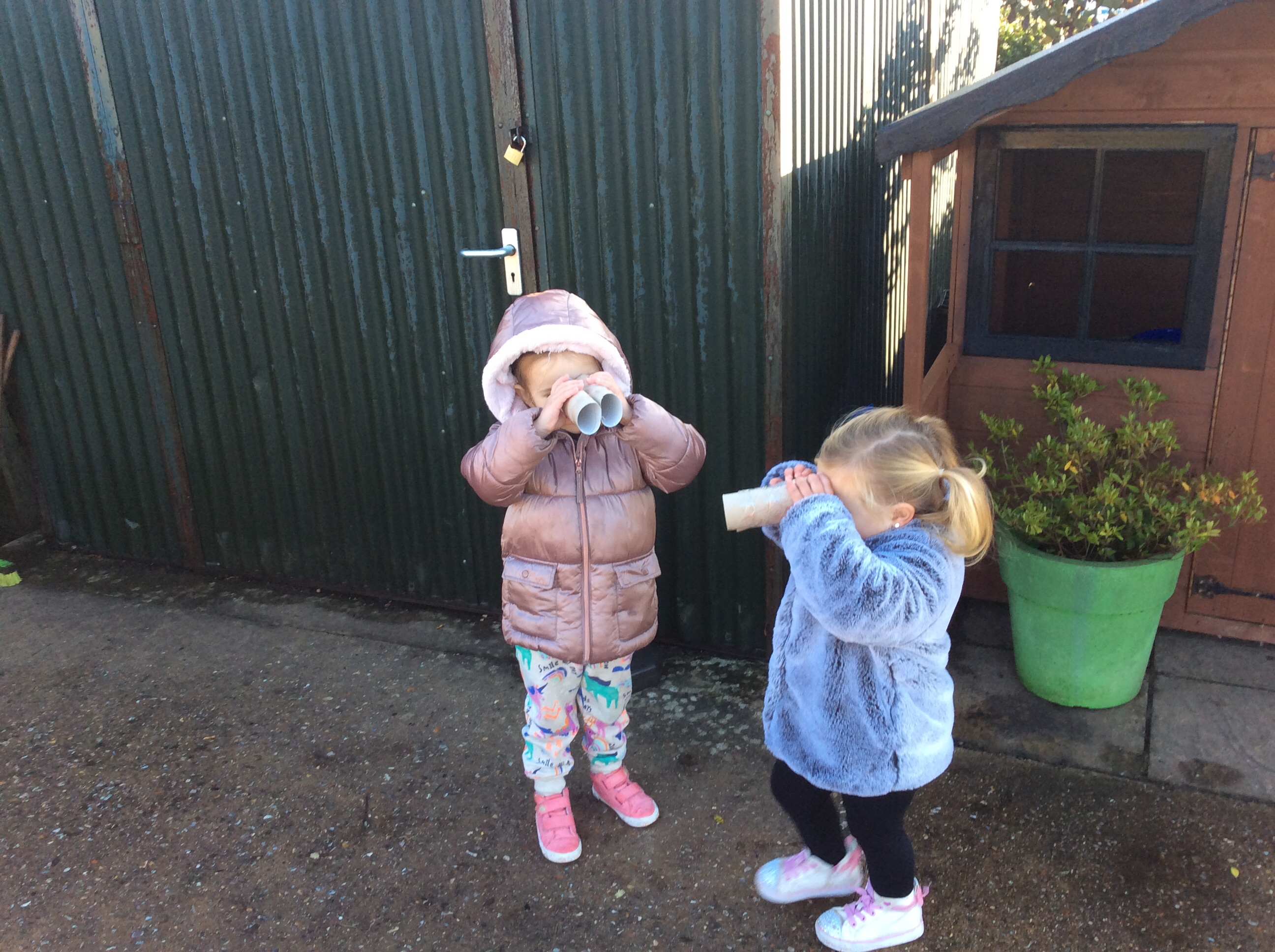 The children love to sing “we’re going on a bear hunt” and in orange room the children used random items that they pretended were binoculars to look out of the windows for bears. Following on from this, we made our own binoculars. We extended this activity even further by going into the garden using the bug hunt resources to search for living creatures (luckily no bears were found). All the while promoting care and concern for living things and our environment.