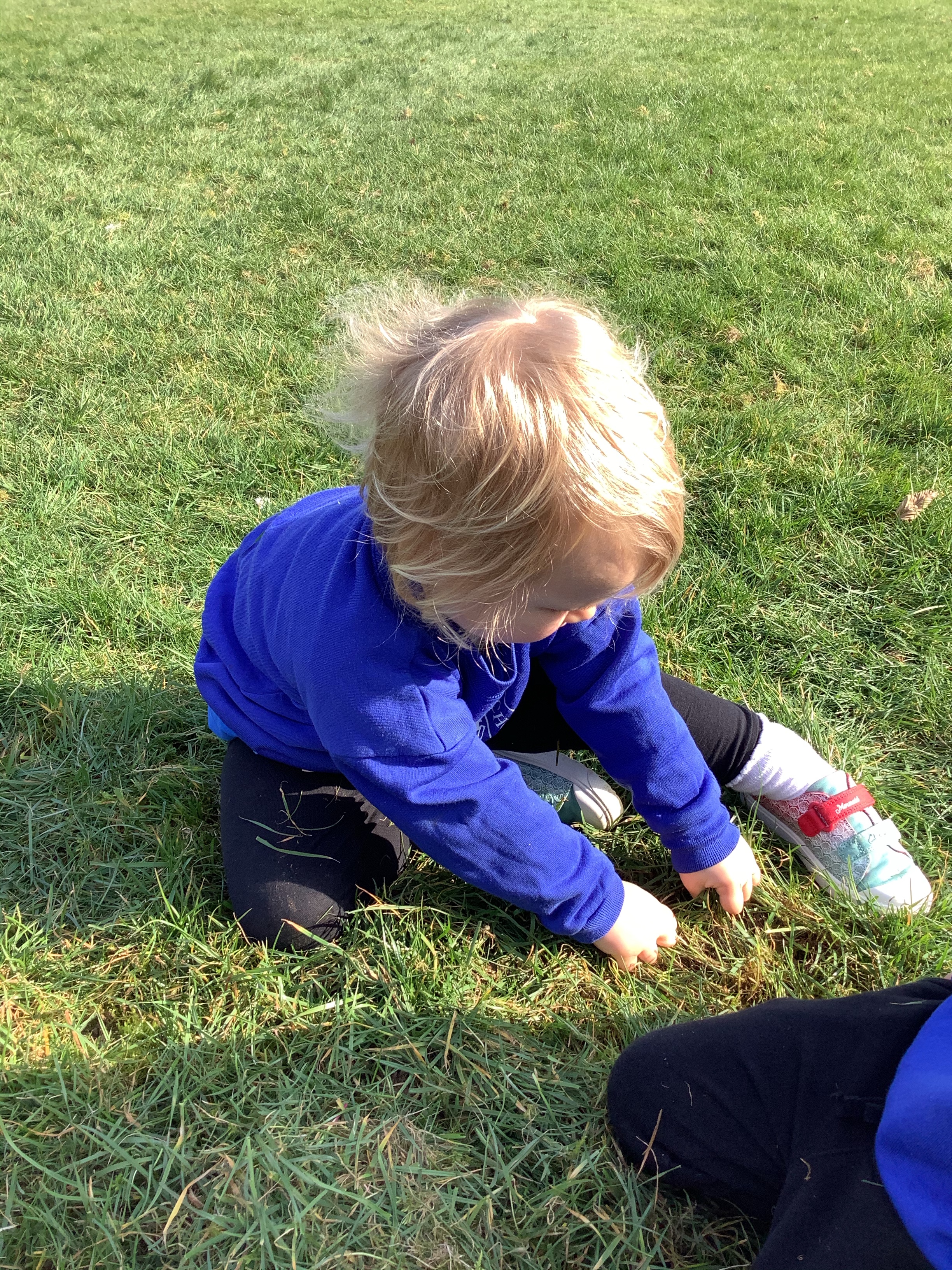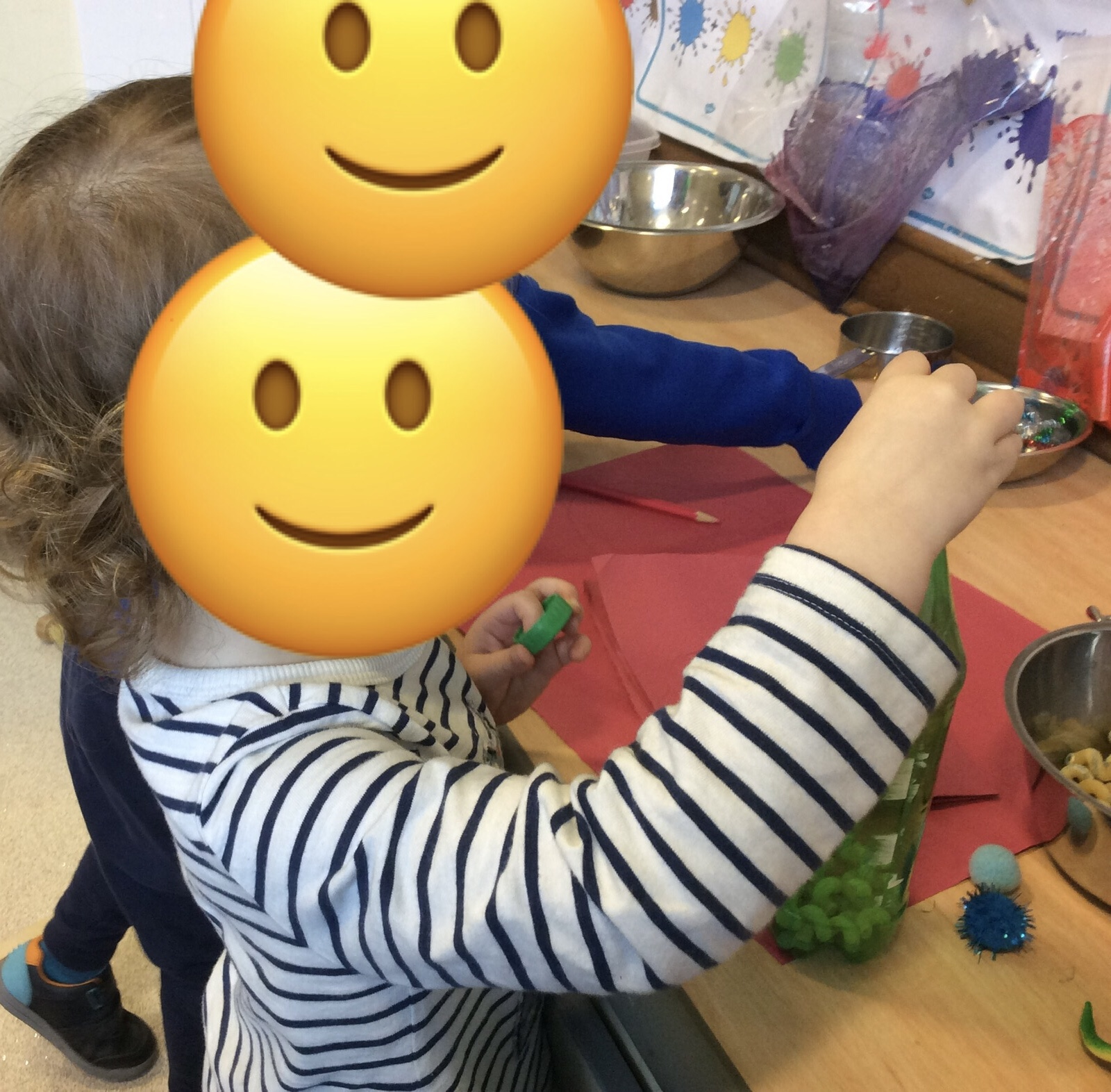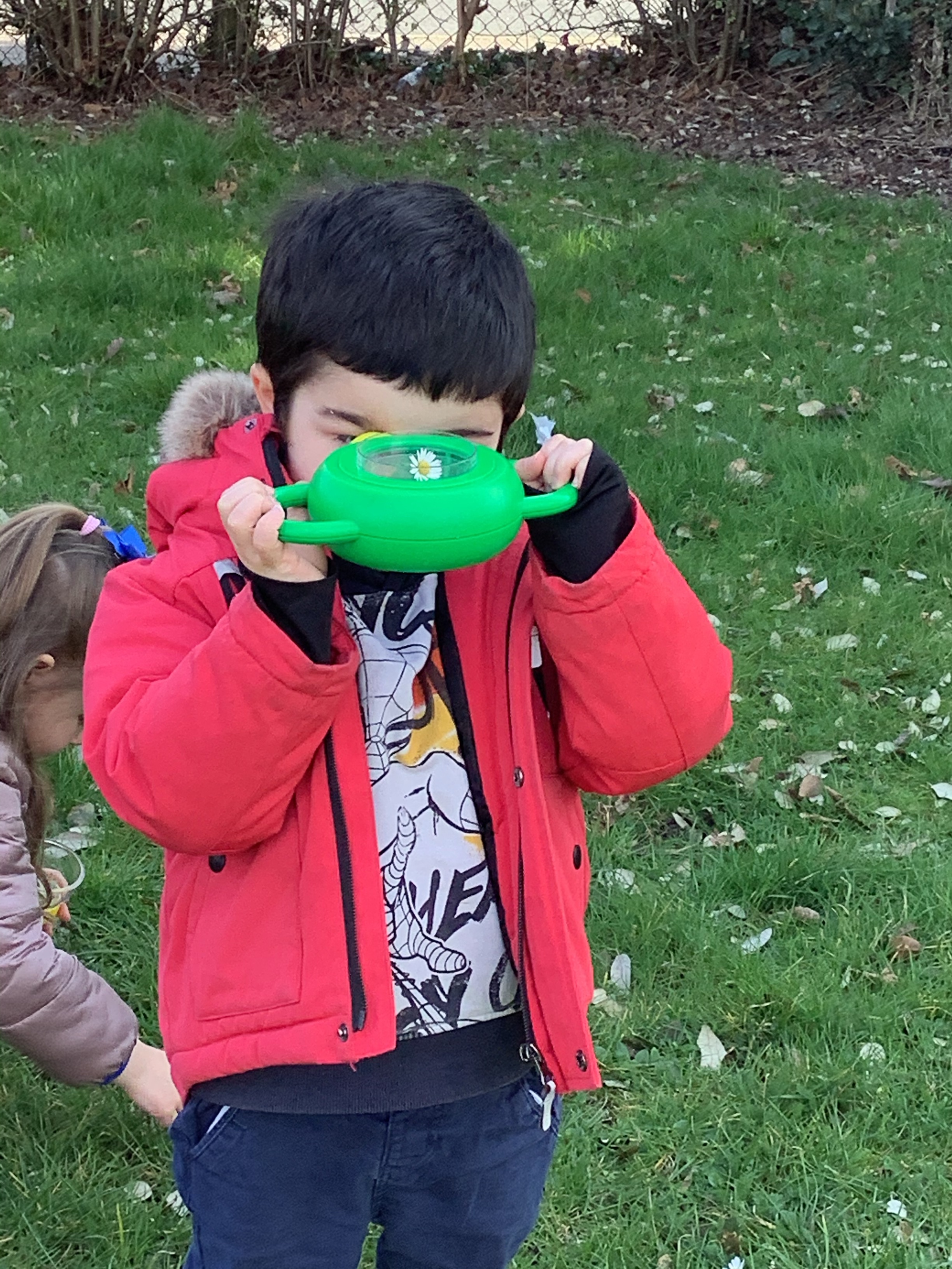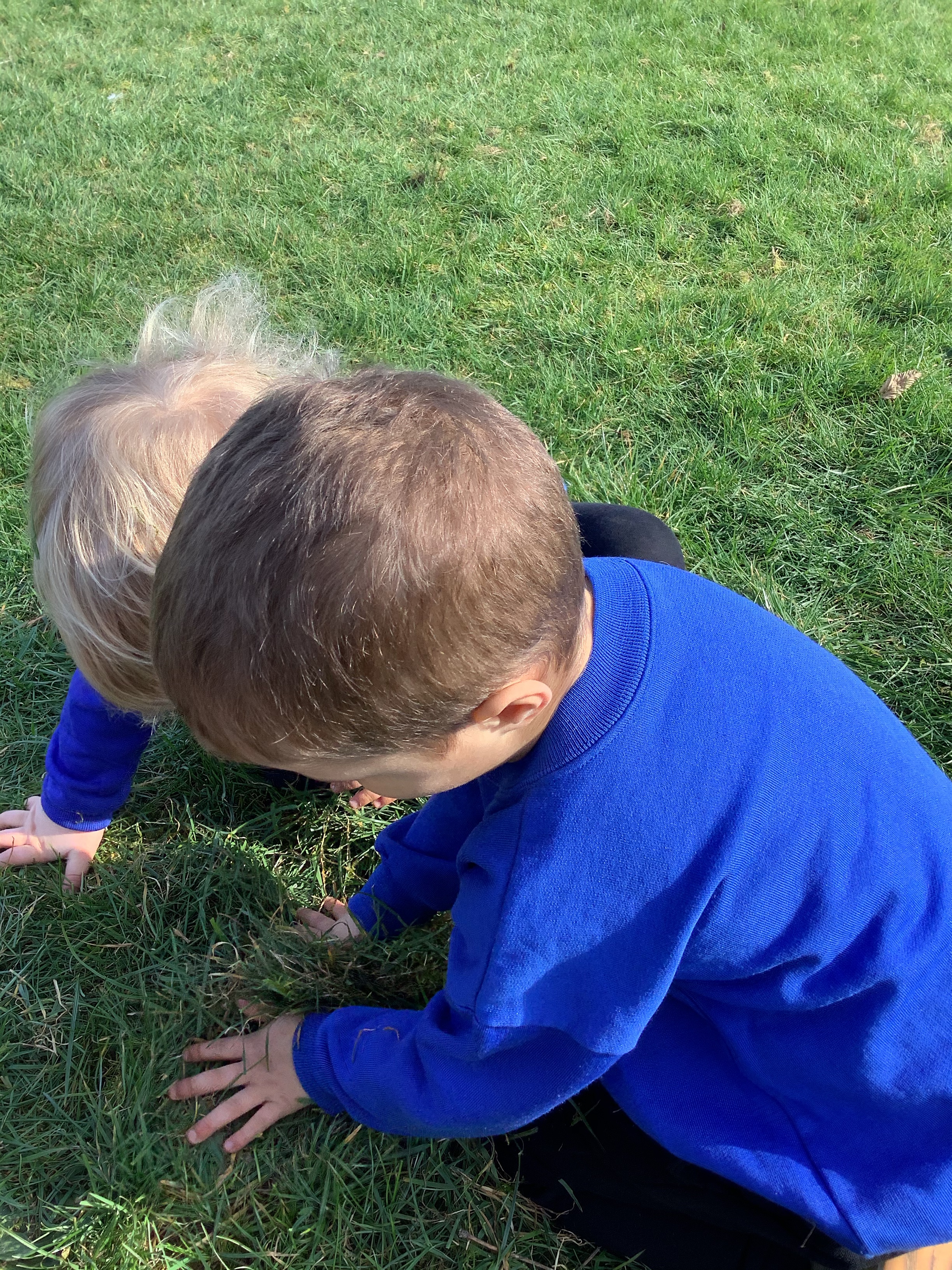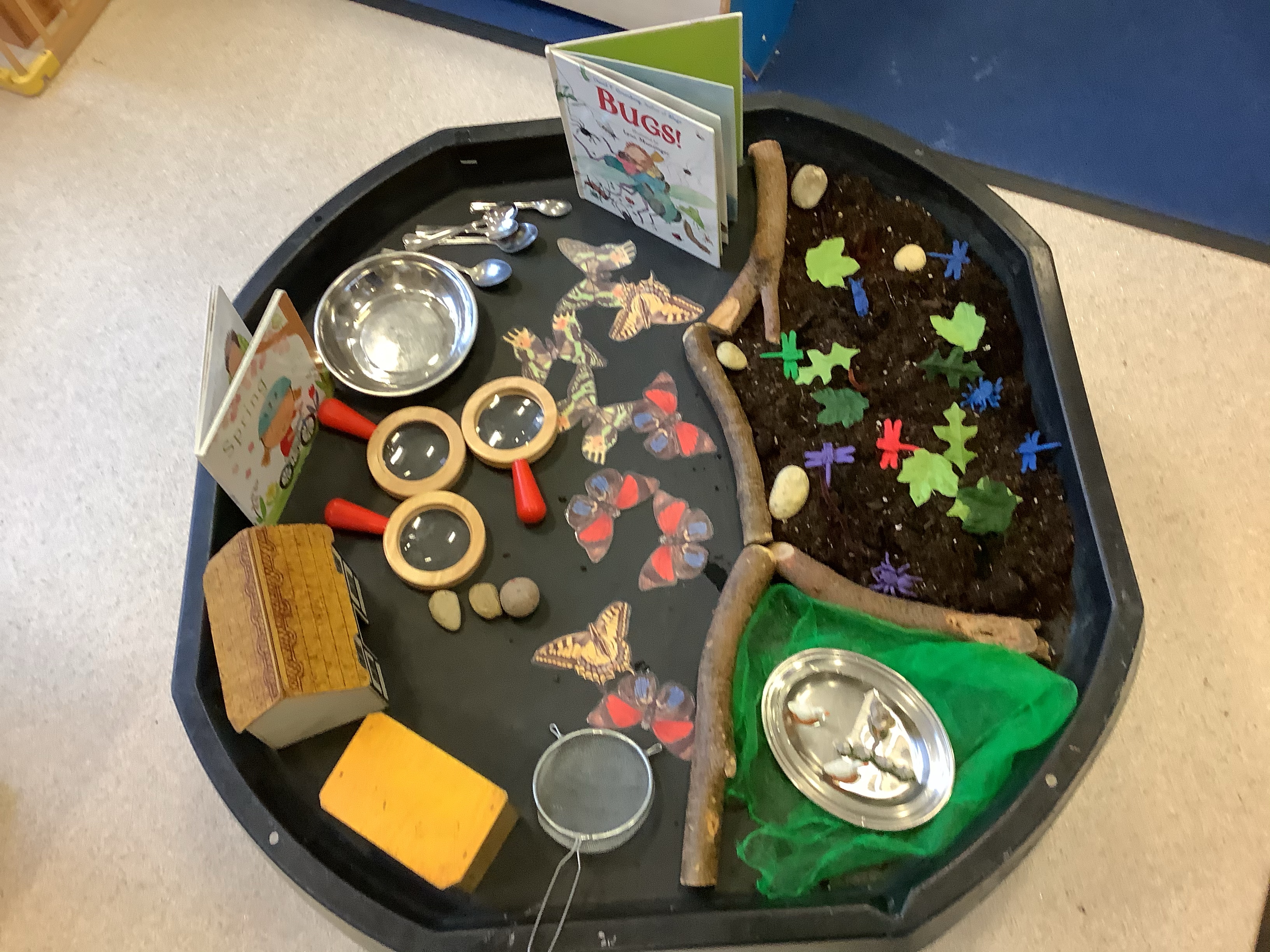 The children love to sing “we’re going on a bear hunt” and in orange room the children used random items that they pretended were binoculars to look out of the windows for bears. Following on from this, we made our own binoculars. We extended this activity even further by going into the garden using the bug hunt resources to search for living creatures (luckily no bears were found). All the while promoting care and concern for living things and our environment.