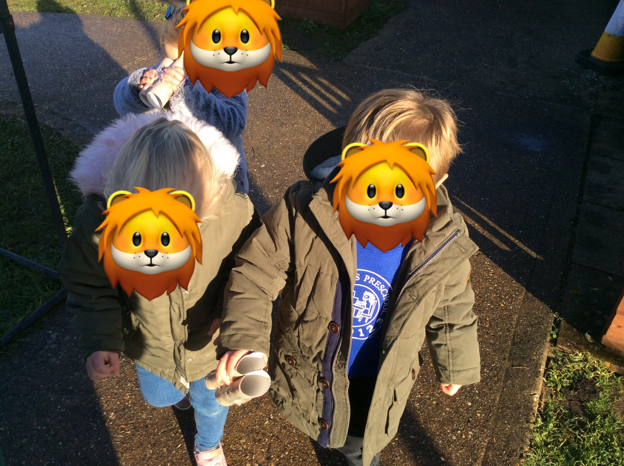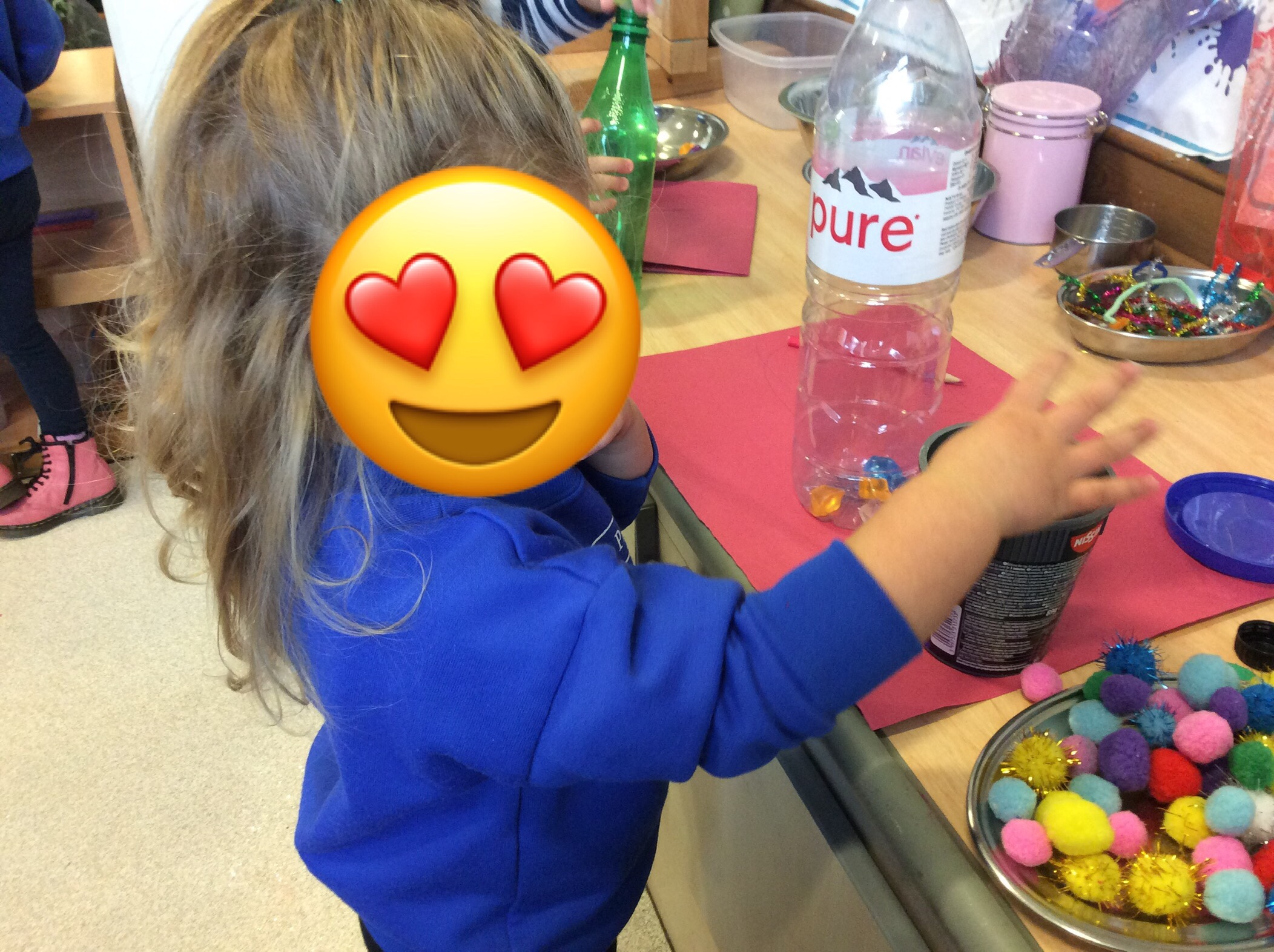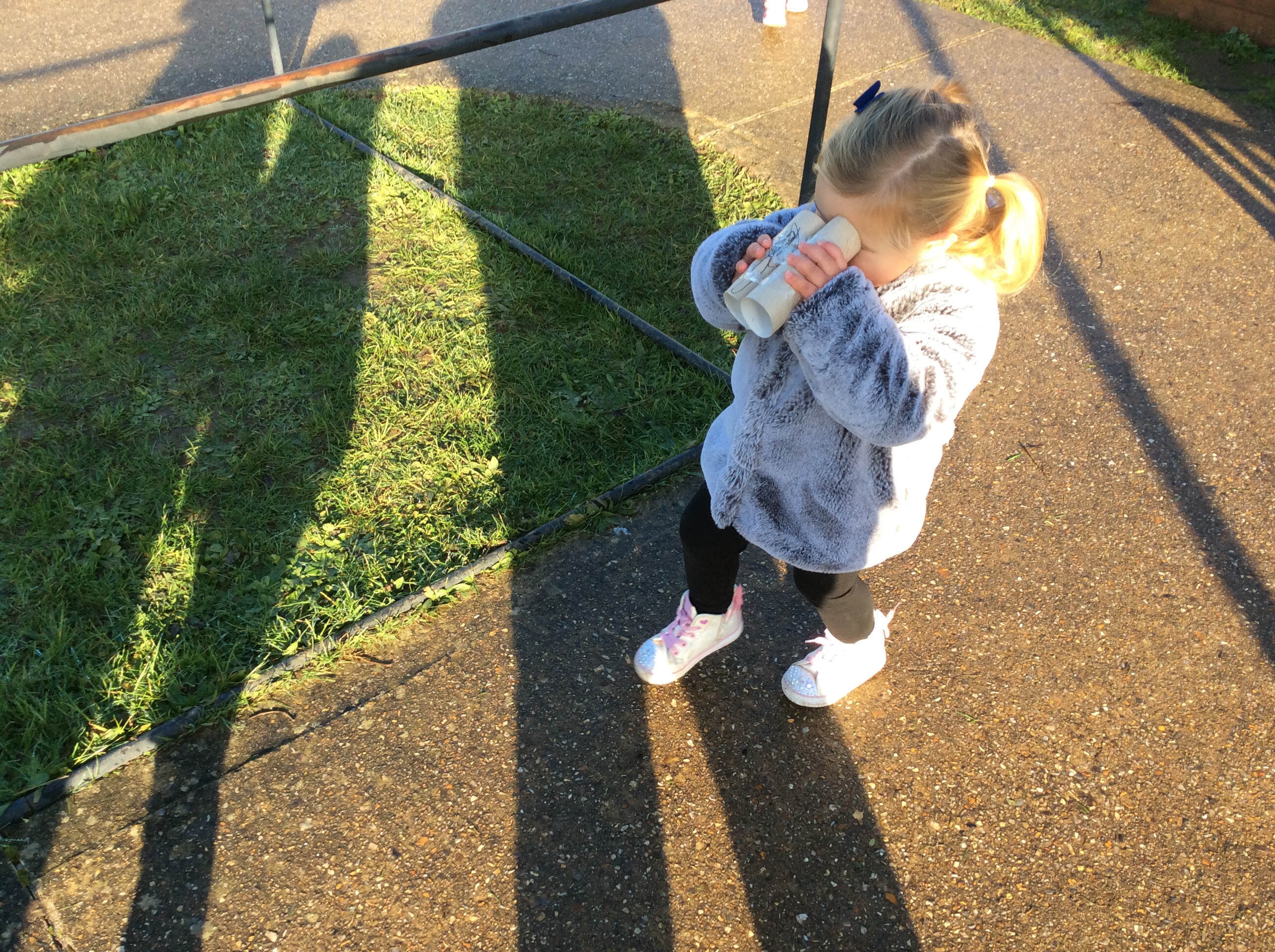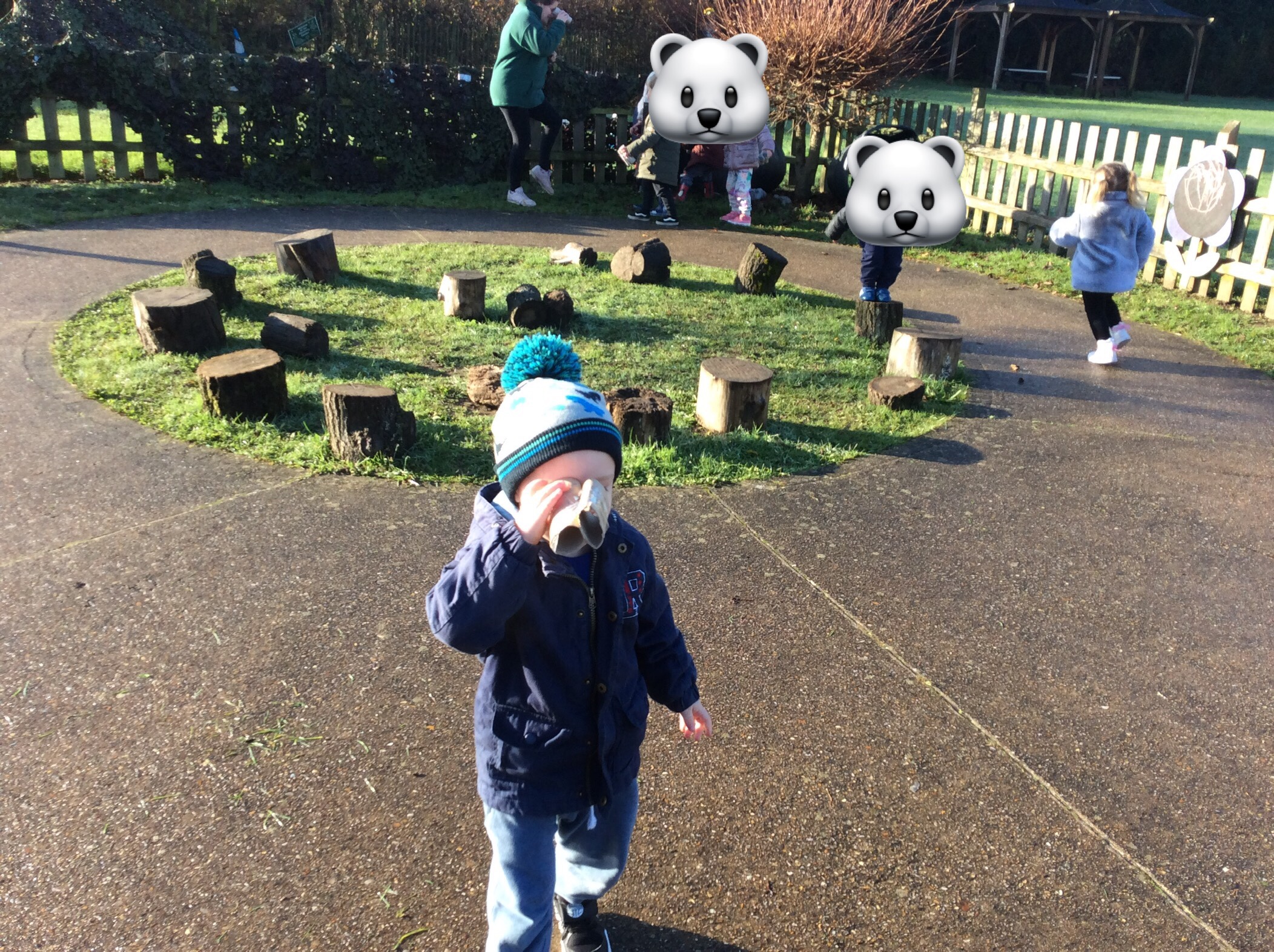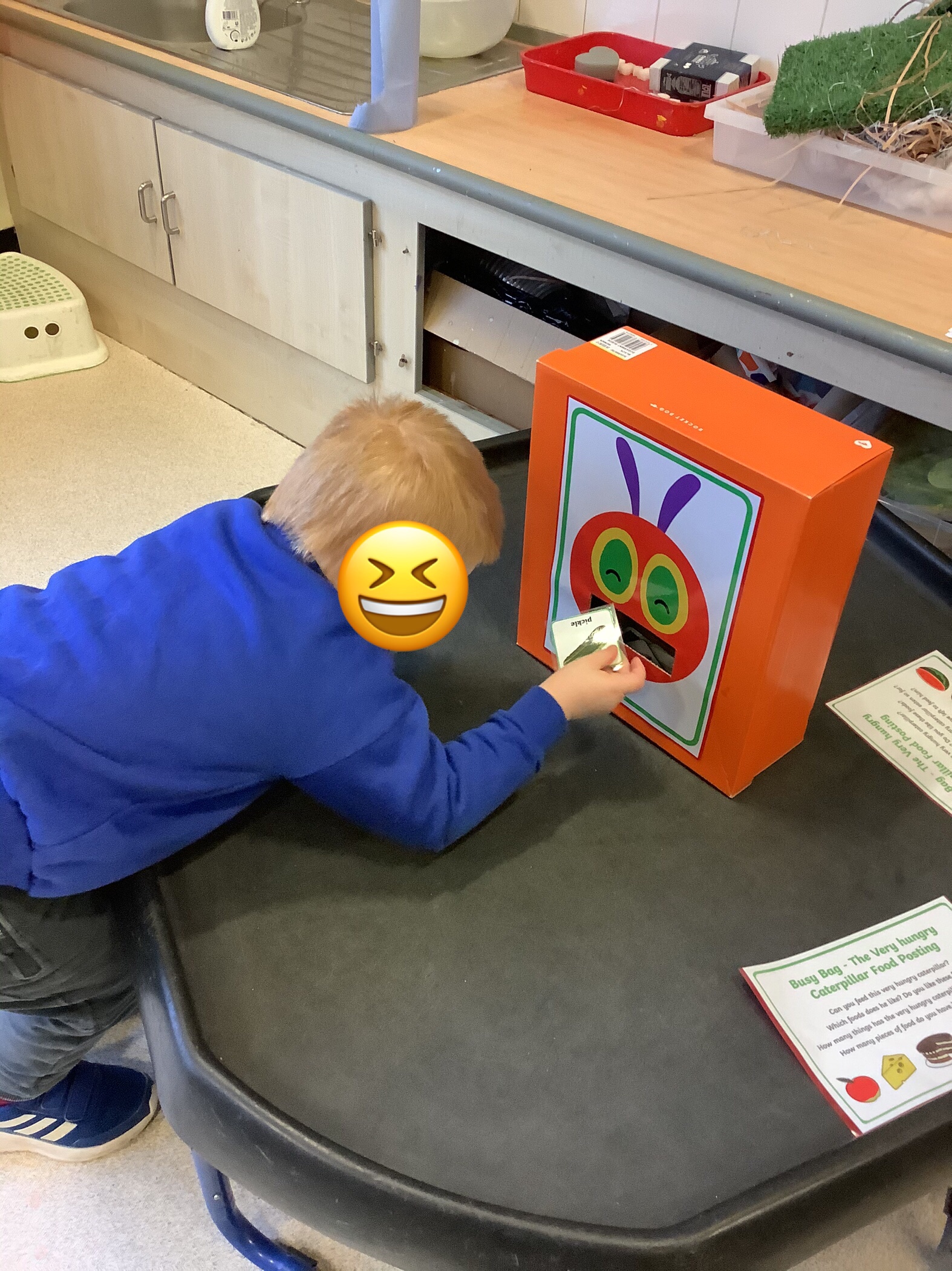 The children love to sing “we’re going on a bear hunt” and in orange room the children used random items that they pretended were binoculars to look out of the windows for bears. Following on from this, we made our own binoculars. We extended this activity even further by going into the garden using the bug hunt resources to search for living creatures (luckily no bears were found). All the while promoting care and concern for living things and our environment.
