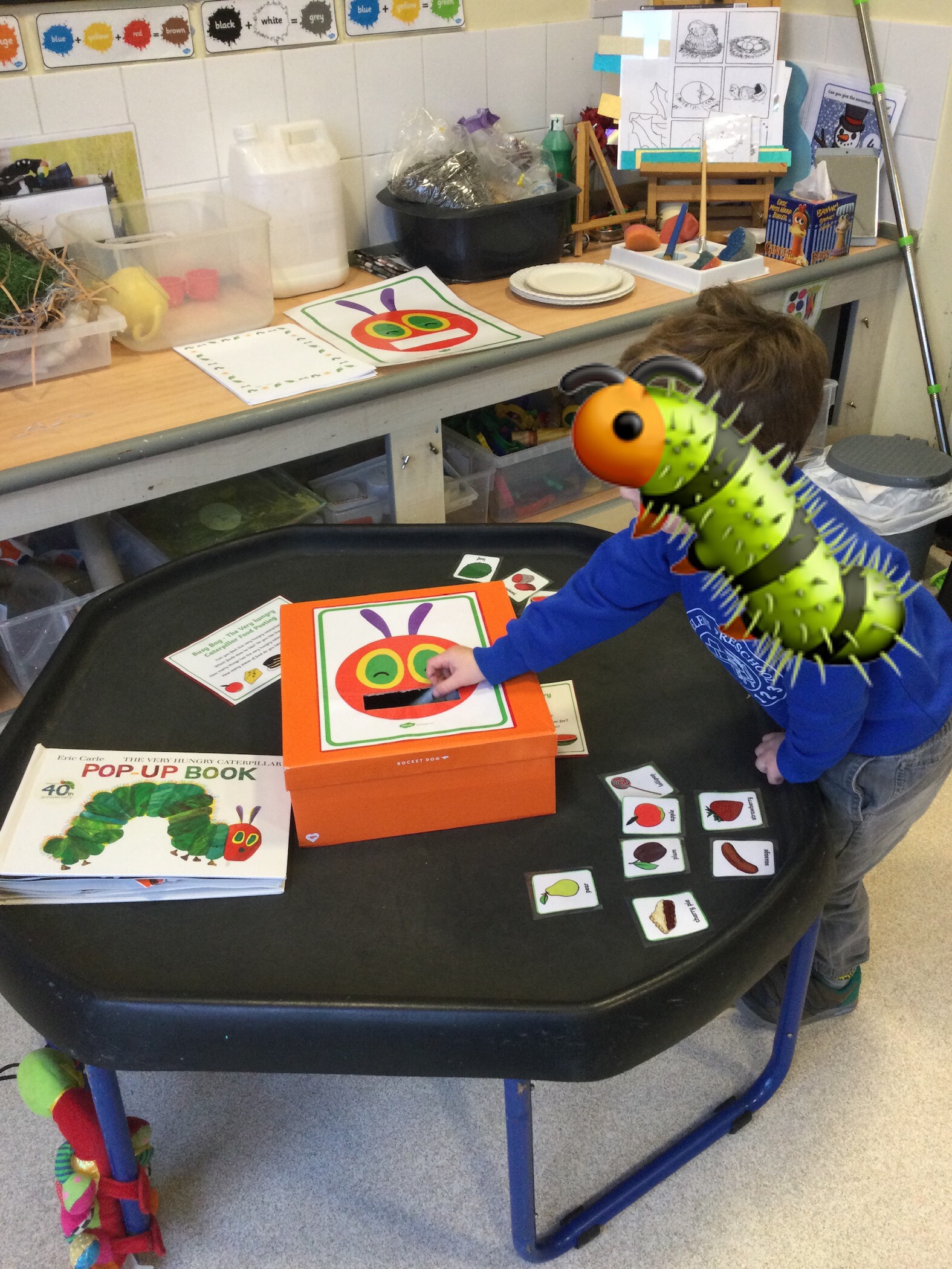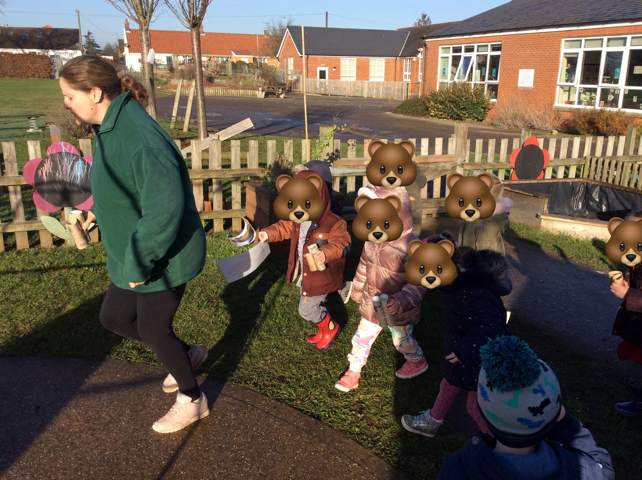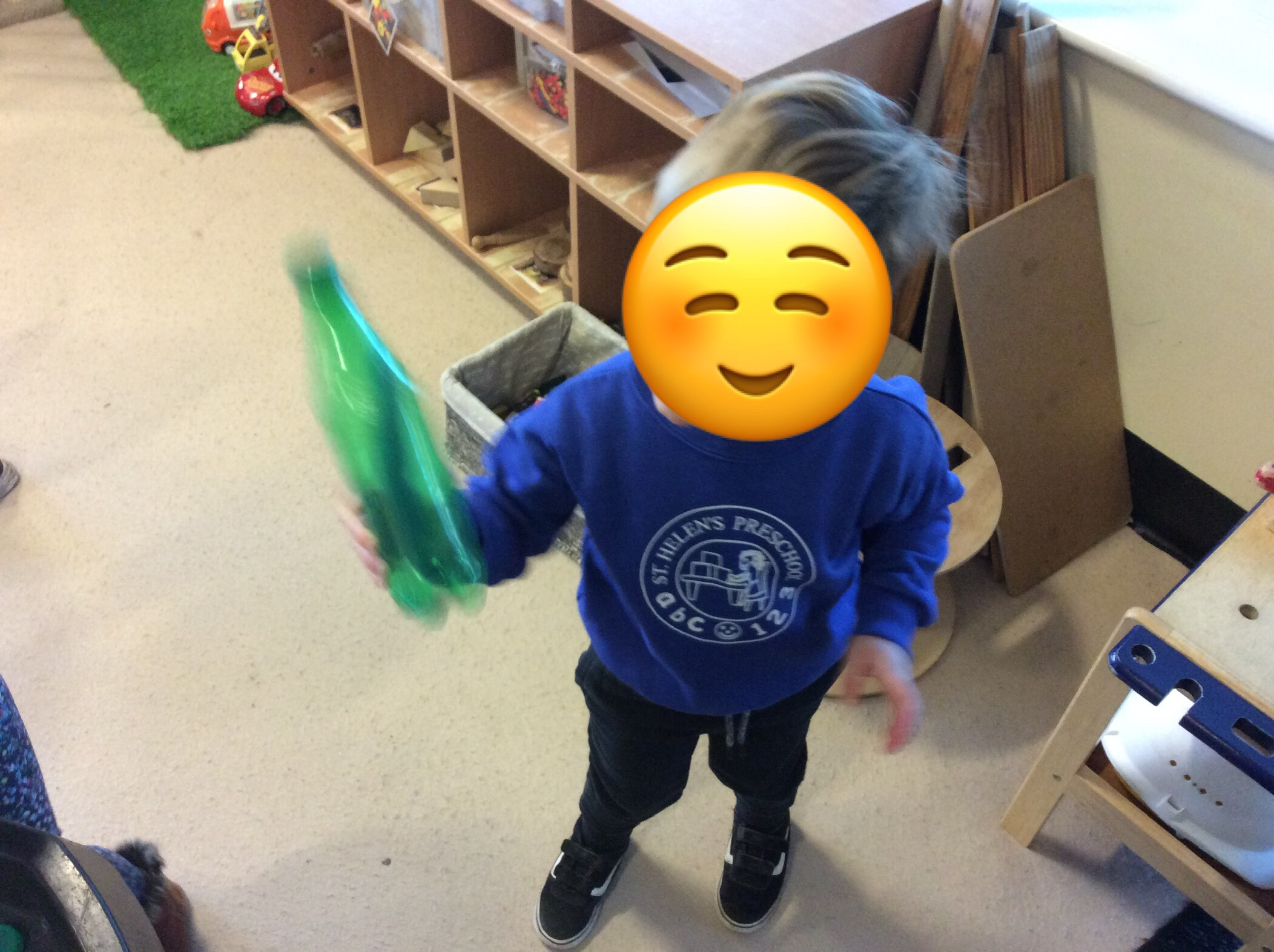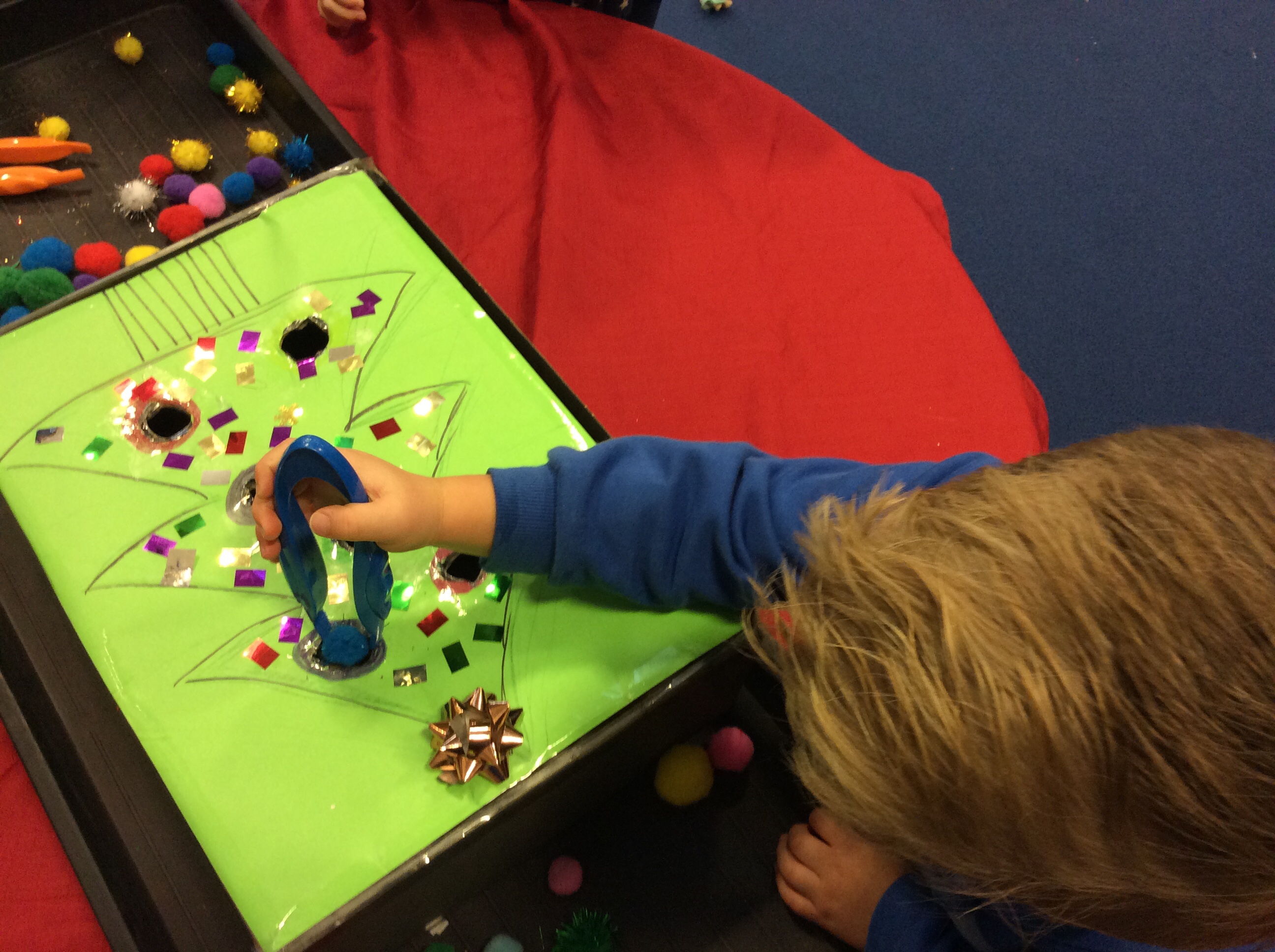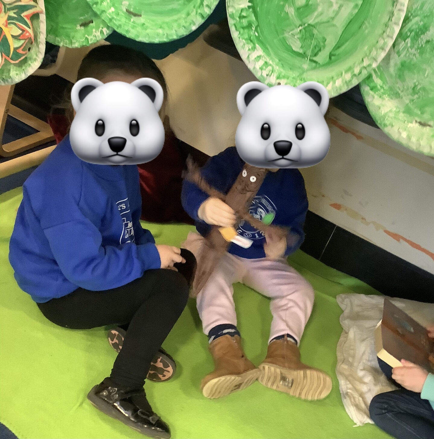 The children love to sing “we’re going on a bear hunt” and in orange room the children used random items that they pretended were binoculars to look out of the windows for bears. Following on from this, we made our own binoculars. We extended this activity even further by going into the garden using the bug hunt resources to search for living creatures (luckily no bears were found). All the while promoting care and concern for living things and our environment.