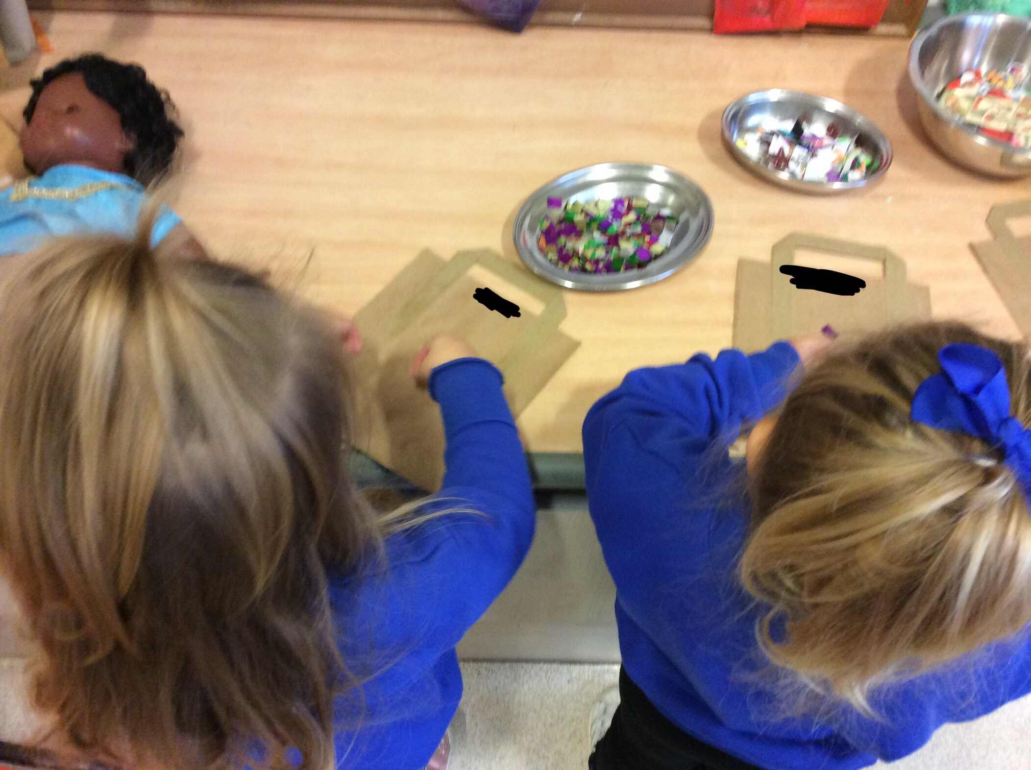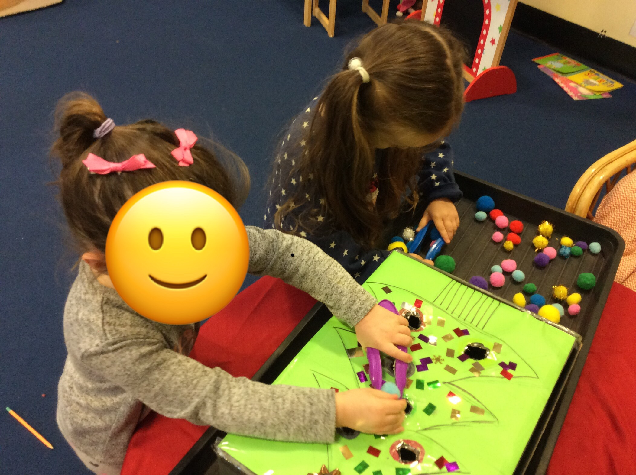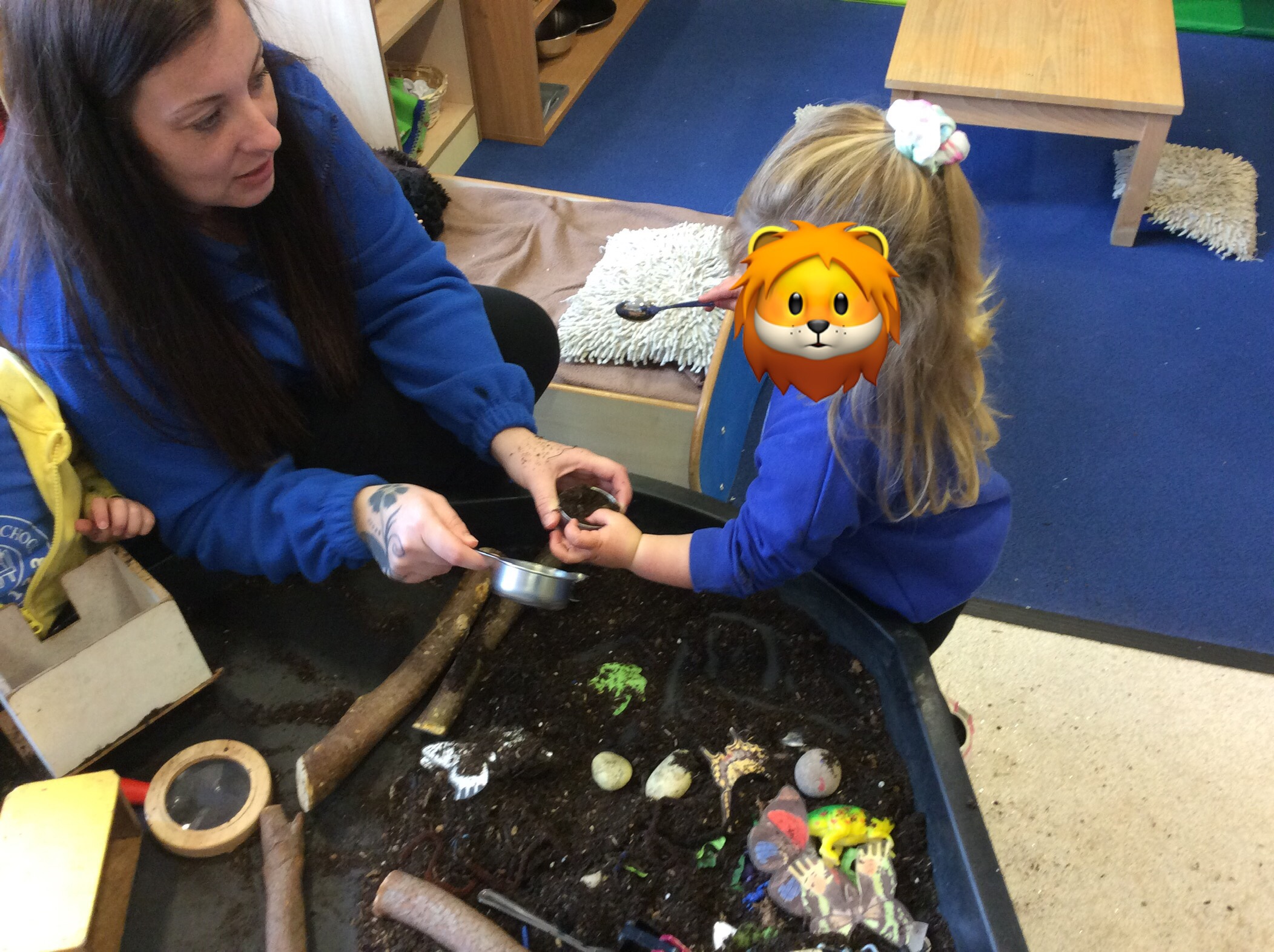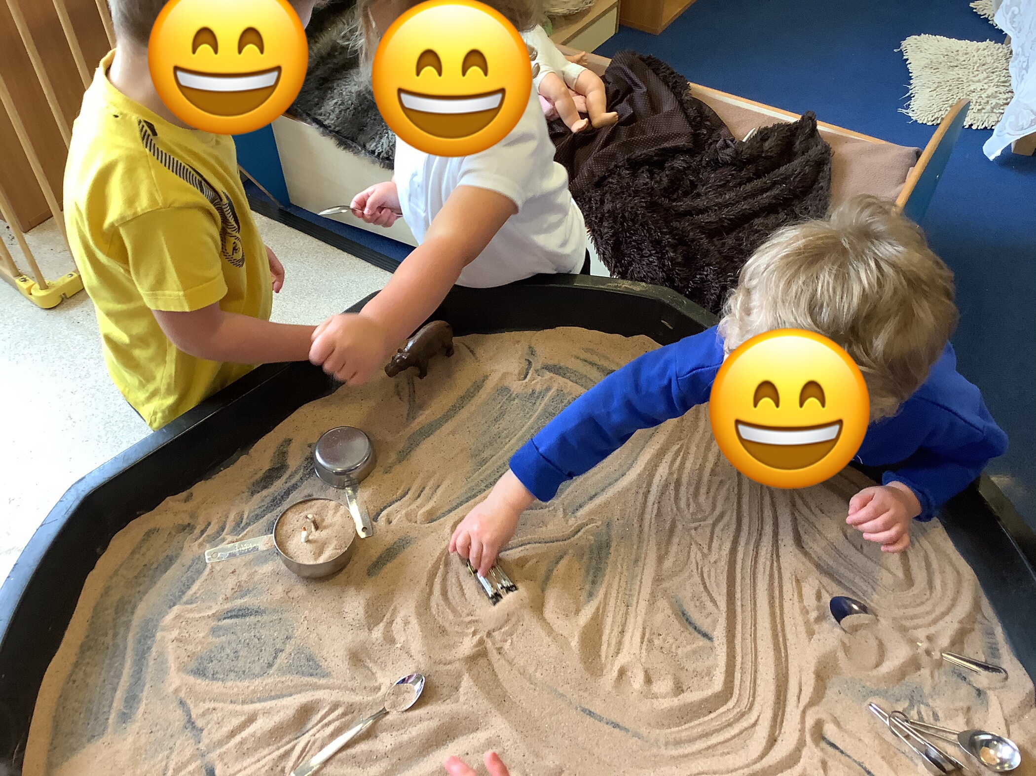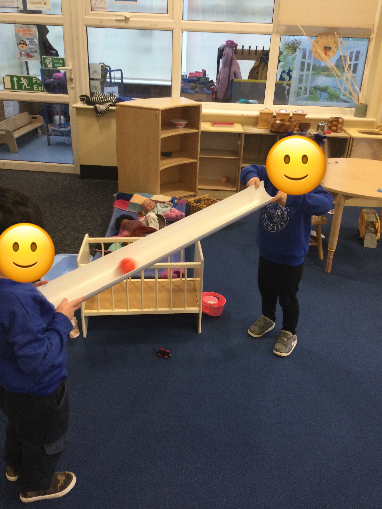 The children love to sing “we’re going on a bear hunt” and in orange room the children used random items that they pretended were binoculars to look out of the windows for bears. Following on from this, we made our own binoculars. We extended this activity even further by going into the garden using the bug hunt resources to search for living creatures (luckily no bears were found). All the while promoting care and concern for living things and our environment.